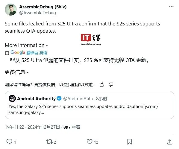 IT之家 12 月 28 日消息,消息源 AssembleDebug 通过发掘代码,发现新的证据表明三星 Galaxy S25 系列手机将突破性支持 A / B 无缝更新。 A / B 无缝更新简介谷歌于 2016 年推出初代 Pixel 手机时,引入了无缝更新功能。只管时间已已往快要 10 年,但三星依然没有下刻意推广无缝更新。 IT之家查询公开资料,无缝更新也称为 A / B 更新,确保无线下载(OTA)更新期间在磁盘上保存一个可正常启动和使用的系统。 接纳这种方式可以低沉更新之后装备无法启动的大概性,这意味着用户必要将装备送到维修和保修中心进行更换和刷机的环境将会淘汰。 必要注意的是,A / B 分区功能必须在硬件层面上支持,无法通过固件更新实现。假如一款手机从一开始没有 A / B 支持,那么它将永久无法具备这一功能。 三星跟进三星今年 3 月发布 Galaxy A55 手机,成为该公司首款支持无缝更新的手机,不外如今来看 Galaxy A55 依然是唯一支持无缝更新的三星手机。 三星最新发布的 Galaxy Z Fold6 和 Galaxy Z Flip6 均不支持这一功能,这意味着这些高端折叠手机在系统更新时,用户大概会碰到更长的更新时间或其他未便。 除了无缝更新,走漏文件还确认 Galaxy S25 Ultra(SM-S938)将搭载高通骁龙 8 至尊版芯片(SM8750,代号“pakala”)。 Galaxy S25 系列引入无缝更新,标记取三星在提升用户体验方面迈出了紧张一步。A / B 分区技能既能包管系统更新的服从,又能保障系统的稳固性。 |