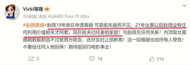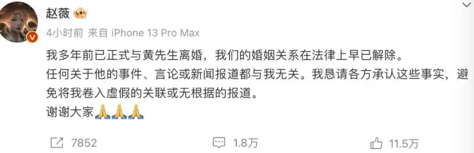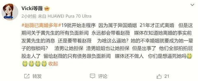 夫妻本是同林鸟,大难临头各自飞。赵薇从2021年起,消散在幕前三年多,本月初琼瑶去世才把她“炸”出来发文哀悼。12月28日,赵薇再次无预警公布仳离:“我多年前已正式与黄老师仳离,我们的婚姻关系在法律上早已排除。” 赵薇三年没公开现身,她的手机也没换过。她用三年前发布的苹果手机iPhone13 pro max写道:“任何关于黄有龙的变乱、言论或消息报道都与我无关。我恳请各方认可这些究竟,克制将我卷入卖弄的关联或无根据的报道。” 仳离消息一出,网友对此议论纷纷。有粉丝表示,赵薇这些年是被老公连累了,实时划清边界是明智选择。但许多网友则以为赵薇这是战术性仳离,“白手套白狼薇”。 但也有网友等待她复出的同时,提醒她别对社会和媒体有太高的渴望。 现年48岁的赵薇,来自安徽芜湖,家庭配景相当不错。她的爷爷在40年代的皖南变乱中牺牲,被追以为义士;外婆是田主,曾经生存在芜湖长街魏家大院;父亲赵家海是从事房地产行业的工程师;母亲魏启颖是小学西席;她还有一个比她年长7岁的哥哥赵健;她母舅魏启民是一名影戏演员,曾在上海人民艺术剧院任话剧团团长。 赵薇北京影戏学院结业后,凭《还珠格格》《情深深雨蒙蒙》成为国内一线女星,影视歌全面发展,红了20多年屹立不倒。 她的老公黄有龙,曾与2005年香港小姐冠军叶翠翠拍拖,其时叶翠翠有“悲情港姐”称呼——母亲患有严峻肾病,父亲退休零收入,家里还养了一大群狗,一个人要撑起整个家。之后她与黄有龙相恋,享受童话式爱情,还因忽然坐拥两幢豪宅,以3100万元连买两个赛西湖千尺单位,换来“港姐股神”称呼。 赵薇2004年~2007年曾先后跟“都城四少”之一的汪雨、奥运乒乓球运动员王励勤来往。直到2008年,她选择嫁给富商黄有龙。 婚后,赵薇身家暴涨,曾一度被捧为“中国女巴菲特”,夫妻身家曾高达60多亿人民币。现年48岁的黄有龙,多年来身份秘密,有传他在故乡湖南有一个乡村,十几岁随父离家,后入新加坡国籍。 赵薇黄有龙顶峰时期,还喜欢投资房地产,曾在当地、香港、台湾、新加坡、法国等地均有物业。黄有龙是新加坡籍,夫妇二人也持有香港身份证,喜欢购买香港豪宅及写字楼物业,曾在香港持有凌驾2亿港元的物业,早于2012年斥资逾1.5亿元大手购入荃湾皇璧3套复式式单位,比年已逐步淡出香港市场。 比年来,黄有龙多次被传陷入经济危机,2019年赵薇夫妻被500多名投资者提告旗下公司涉及证券卖弄报告,赵薇被列为共同被告,也需负担补偿责任,2021年又传出赵薇旗下3间公司股权遭冻结。对此,赵薇工作室并未回应。 但赵薇一些粉丝则表示早已知情,还透露了赵薇仳离的黑幕,称赵薇早在五年前就申请仳离,但是前夫避而不见到。直到2021年,赵薇出过后,黄有龙见赵薇已经没有任何使用代价这才同意仳离,而且现在黄有龙已经重组家庭了。 对于赵薇高调公布仳离,有传与黄有龙欠下巨债有关。本周一,智择创投有限公司入禀指,黄有龙拖欠择创投有限公司的本金和利钱约7.53亿元,原告追讨该笔欠款外,还要求黄有龙付出入禀至还款期间的利钱,以及相干讼费,现连本带利追讨逾11.2亿港元。黄有龙比年被指四处负债,客岁还被指租住香港荃湾汀九油柑头“皇璧”,但欠租280万港元。 |