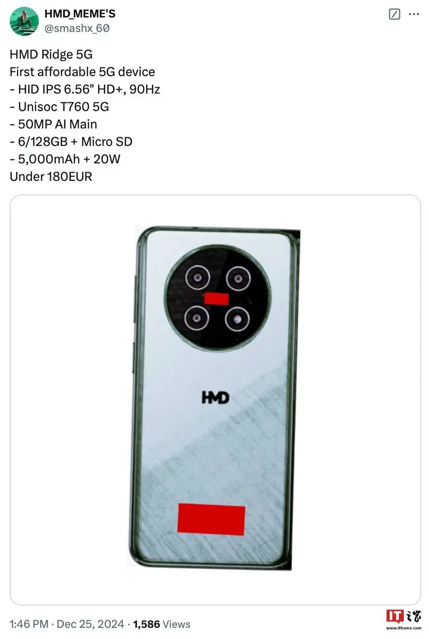 IT之家 12 月 29 日消息,拥有精良爆料纪录的消息源HMD Meme(smashx_60)如今曝光了HMD Ridge 5G手机,该机号称是HMD首款可负担的5G手机,虽然曝光图看起来像是折叠手机,不过现实上该机并非折叠手机,据称订价低于180 欧元(IT之家备注:当前约 1370 元人民币)。 如今,消息源暂时没有公布这款手机的正面照片,但其表示该机搭载一块6.56英寸HD+ 90Hz面板;参考如今曝光的手机背面照片,该机将搭载50MP主摄像头。 规格方面,该机搭载紫光展锐T760处置惩罚器,配备6GB RAM和128GB存储空间,搭载5000毫安时电池,支持20W有线充电。 |