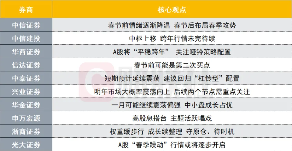 财联社12月29日讯(编辑 若宇)十大券商最新战略观点奇怪出炉,具体如下: 中信证券:春节前感情徐徐降温 春节后布局春季攻势 预测1月份,政策处于空窗期,预计上半月市场仍较为生动,下半月外部扰动因素将逐步增多,市场感情徐徐降温,从一季度的节奏来看,预计春节后政策预期重新升温,市场开始酝酿春季攻势。从资金面来看,春节前可预见的增量仅来自保险,存量生动资金料将对主题会更聚焦;从风格设置来看,由于交易业务消耗一连放大,预计纯粹的小盘风格难以连续,大盘代价风格占优。 从板块设置来看,建议继承接纳红利+主题的杠铃战略,并更方向红利,同时密切关注医药板块政策催化;从行业设置来看,红利板块内稳固高股息和消费类高股息占优,建议弱化能源型红利行业,主题板块内看好生动资金向端侧AI、新零售和呆板人聚焦,但在1月中下旬要鉴戒主题交易业务退潮。 中信建投:中枢上移 跨年行情未完待续 已往数月,A股市场底部不绝上移,短期从季节性规律看,一些资金年底结算赢利告终,落袋为安的生理使得岁末市场通常交易业务偏淡,风险偏好降落,到新年伊始之后又会徐徐生动,而通常农历春节后流动性会进一步改善。同时在当前政策基调下,中信建投以为明年一季度有望适时降准降息,债券收益率的降落会使得股票估值吸引力进一步上升,增量流动性有望推动A股跨年行情,预计市场将在明年初连续中枢震荡上行趋势。 建议继承关注潜伏政策发力受益方向,AI+是中期产业主线。关注行业:非银金融、电子、军工、传媒、机器、地产链、修建、休闲服务等。重点关注主题:AI+、低空经济、首发经济等。 华西证券:A股将“安稳跨年” 关注哑铃战略设置 临比年报预告披露期,日历效应使得投资者风险偏好有所回落,A股成交额和融资余额下行,此中受益于低利率和央企市值管理催化的高股息板块可作为压舱石设置。中期维度,当前股市资金供需关系已大幅改善,宏微观流动性均有望宽松,以“AI+”为代表的科技主题仍将频仍演绎。近期市场重点关注:1)海外方面,思量到特朗普上台后对全球加关税风险,我国出口或出现“前高后低”,国内核心矛盾仍在于内需。2)随着前期一揽子政策显效,预计国内经济连续暖和修复态势,2025年或是A股红利“筑底之年”。 3)年底巨细盘风格迎劳迫椿,投资者风险偏好有所回落。 行业设置上,跨年建议关注哑铃战略的两条主线:一是“新质牛”核心资产,重要包罗AI+、人形呆板人、低空经济、国产替换等主题投资;二是低利率和央企市值管理催化的高股息板块可作为压舱石。 信达证券:春节前大概是第二次买点 2024年9月初是这一轮牛市第一个较好的买点,下一个可以重点关注的时间点大概是春节前。一方面,季节性规律表现2月是Q1胜率赔率最好的月份。另一方面,更重要的是,3-4月是经济数据和住民热情可否继承加速的重要时点,春节前假如市场位置不高,买点比力安全。 将来1个月设置建议:金融地产(政策最受益)>上游周期(产能格局好+前期涨幅和预期低) > 交运&公用古迹(低估值防御)>AI&消费电子(新赛道+发展股中的代价股+风格阶段性偏大盘代价)>出海(长期逻辑好,短期美国大选后政策空窗期)。 中泰证券:短期预计连续震荡 建议回归“杠铃型”设置 1月预计连续震荡。一方面,市场对政策的期待有所低落。本轮行情是比力典范的政策预期驱动的估值修复行情,行情得以连续的条件是政策一连宽松。另一方面,A股的日历效应。1月是传统的经济与政策窗口期,汗青上沪深300相比于12月的胜率和赔率都出现了显着降落(胜率50%vs57%,赔率0.7vs2.5)。不外对1月也并不是完全悲观,一是政策基调依然是偏宽的。无论是政治局会议还是中心经济工作会议,对政策的定调都是连续宽松的,此中货币政策的进一步宽松可以期待。二是政策有“稳住楼市股市”的要求,假如市场出现较为显着的下行风险,预计也能得到市场化机制的参与和支持。 设置战略方面,短期建议回归“杠铃型”设置,杠铃的一端是以银行为代表的红利资产。一方面,当前市场对政策的乐观预期有所降温,以及特朗普履任的不确定性来看,预计市场避险需求会有肯定升温;另一方面,1月各行业的整体赔率相比于12月会有所降落,此中只有银行的胜率和赔率均高。杠铃的另一端是中小市值的题材方向,建议继承围绕科技温和周期两个方向做恰当的市值下沉,窗口期内大概会更聚焦于科技方向。中期的行业设置现实上必要期待更加明确的政策和经济信号,不外基于国内政策预期有所降落、海外不确定性有所上升的判断,可以开始关注有独立增长逻辑、25年业绩预期好转的行业。 兴业证券:明年市场大概率震荡向上 后续两个节点必要重点关注 9月底以来,政策反转带来估值修复。行至当下,估值修复已较为充分。闯辗视端来看,“红利底”大概率已经出现,根本面修复的方向是明确的。但数据验证还必要时间,预期和现实将轮番主导市场。因此,整体来看,明年市场大概率是震荡向上。后续两个节点必要重点关注:节点一是明年3-4月,根本面反转验证窗口;节点二是2025年7、8月,代价回正+中报景气验证窗口。 布局上,从赔率和胜率角度关注两大方向。赔率角度,重点关注新质生产力以及并购重组。新质生产力重点关注AI、半导体、信创、呆板人、低空经济等;并购重组重点关注优质地域本地资源