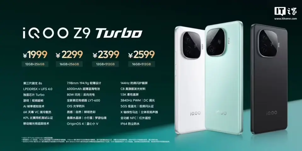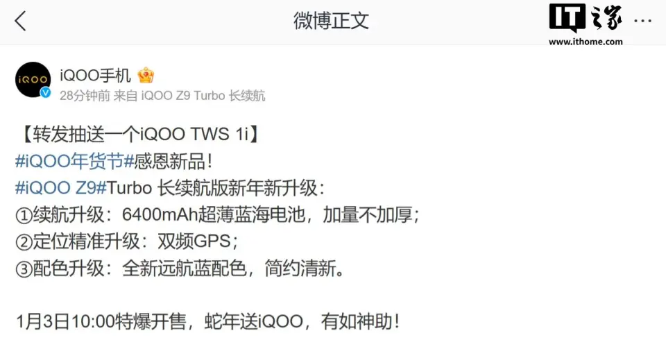 IT之家 12 月 30 日消息,iQOO 手机官方本日公布,iQOO Z9 Turbo 长续航版手机将于 2025 年 1 月 3 日 10:00 开售。 据先容,相较于 iQOO Z9 Turbo,长续航版在续航、定位、配色三方面举行了升级: