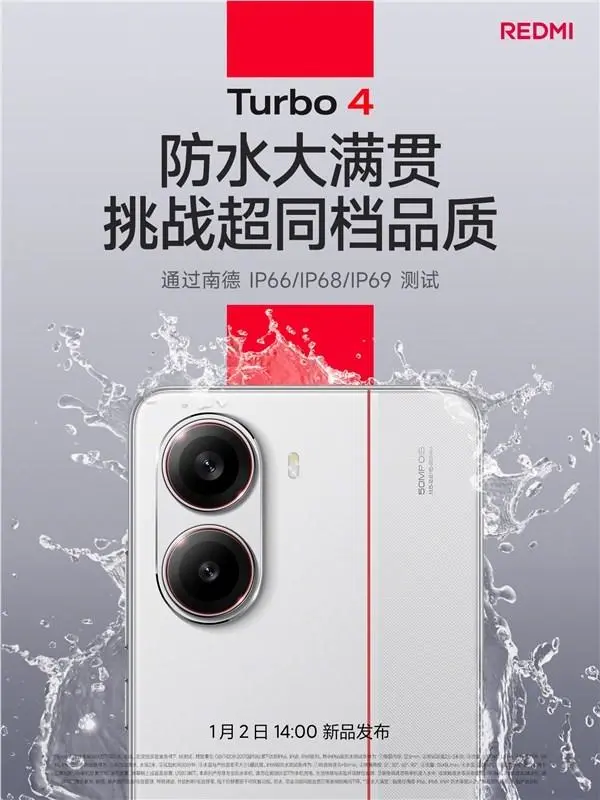 站长之家(ChinaZ.com)12月31日 消息:红米Turbo4手机即将发布,官方克日公布了其良好的防水性能,该机型支持IP66、IP68和IP69防水等级,被誉为“防水大满贯”。这意味着红米Turbo4可以或许在多种恶劣的液体情况中利用而不受损害,为用户提供了全方位的防水掩护。 为了进一步加强用户信心,红米Turbo4在初次贩卖时还将提供免费的进水保服务。在一年内,如果用户因不测进液导致手机发生故障且无法正常利用,可以享受一次免费的维修服务,但不包括表面破坏和人为故意破坏的情况。 官方宣称,红米Turbo4不光在防水性能上体现出色,还支持铁人三项挑衅,力图成为同档位手机中风致最强的产物。在续航本领方面,该手机配备了6550mAh的小米金沙江电池,通过采用硅碳负极技能,提升了电池的密度和耐用性,实现了1600次的四年耐用长循环。 别的,红米Turbo4还配备了双增压耐寒芯片,使其能在低至-35°C的情况下正常工作,这对于北方用户和须要在室外工作的特种职业者来说是一个实用的功能。 最告急的是,红米Turbo4在初次贩卖时还将提供五年电池保修服务。参照之前的Redmi Note14Pro,如果电池康健度在五年内降至80%以下或出现性能故障,用户可以享受免费更换电池的服务,为用户提供了极大的保障。这些特性使得红米Turbo4成为了一款在防水性能、续航本领和耐用性方面都具有竞争力的产物。 |