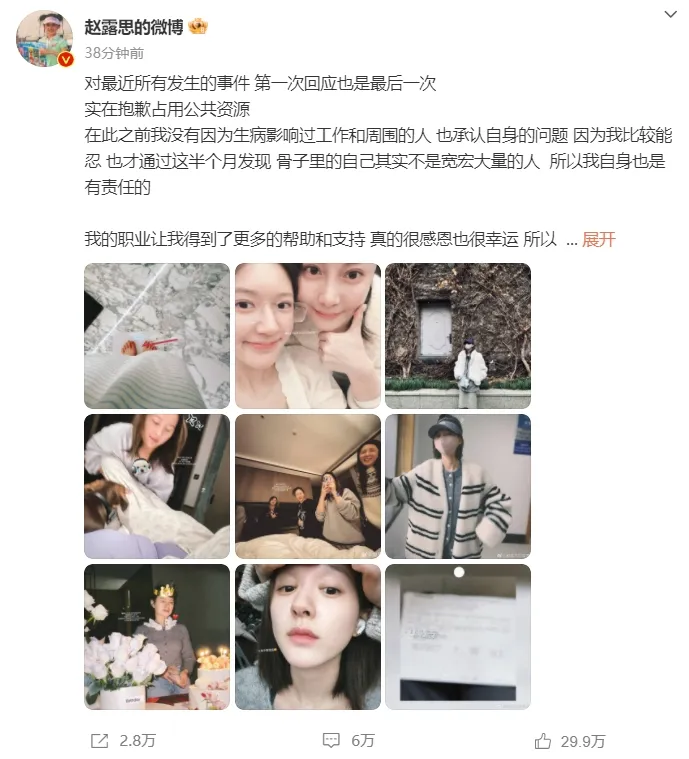 本日(1日)下战书,演员赵露思发长文,回应近期出现的各种变乱。 在长文中,赵露思透露自己从2019年开始出现烦闷情绪,2023年出现“肺炎、肺气肿、玫瑰糠疹荨麻疹、盗汗、惊醒、神经性耳聋”,2024年出现“频仍干呕、眩晕、关节疼、颈椎疼”等症状。同时也透暴露自己因没试上戏而挨打,现在这段时间“是给自己 ‘特别时间’去颠覆此前心田的抵牾状态 重新创建自我的一次机遇。” 全文如下: 克日,演员赵露思因“被送医院救济”相关变乱多次登上热搜,连续引发公众关注和热议。 2025年1月1日破晓1点28分,影视演员赵露思在交际平台更新了动态,这是她抱病后首发动态,惹不少民气疼。 1月1日,赵露思天下粉丝后盾会发长文,文中提到“赵露思没有经纪人,许多变乱甚至去外洋运动跟机场的人沟通都必要她亲力亲为。恒久超负荷的工作、无苏息的行程安排给她的身体造成了巨大压力。” 同时,后盾会对于剧组现在不负责和不发声的没有担当行为,提出“赵露思需无穷期克制拍摄”的诉求。 “18日,赵露思密斯突发身体不适,已第一时间前往医院担当检查治疗,现在在谨遵医嘱治疗休养中。” “不停以来,赵露思密斯秉持着演员的初心,爱惜每一次出演的机遇,专心对待每一部作品。接下来我方将以赵露思密斯的身体康健为紧张考虑,暂停后续全部工作,也愿全部关心露思的人,给她身心苏息的空间,谢谢各人的理崩溃谅。” 有更多出色视频和直播! 关注小强热线微信公众号和视频号 |