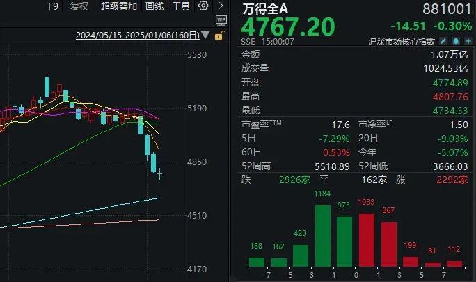 每经记者:肖芮冬每经编辑:赵云 1月6日,市场全天弱势震荡,三大指数均小幅下跌,沪指盘中一度跌破3200点。截至收盘,沪指跌0.14%,深成指跌0.12%,创业板指跌0.09%。 板块方面,流感、中药、医药贸易、其他电源装备等板块涨幅居前,零售、AI眼镜、白酒、食品等板块跌幅居前。 全市场近2300只个股收涨,逾百股跌停或跌超9%。沪深两市全天成交额1.06万亿元,较上个买卖业务日缩量2092亿,成交金额创客岁9月25日以来新低。 固然是缩量4连阴,但本日盘面上那些大盘企稳的细节,你都留意到了吗? 1)紧张股指的日K线,开始收十字星了; 2)本日收盘上涨家数回升至2200多家,为开年以来最高; 3)早盘盘初,紧张指数的黄线(领先指数)均出现急速探底回升,而午后的回落也并未跌破这一低点; 4)跌停家数与涨停家数的差距,较上周五缩窄。本日全市场出现了8只“地天板”走势的个股——这一点本文会睁开讲。 换句话说,接下来一段时间,每次下跌,都更值得博弈反弹。 多股同日“地天板”,有量化资金到场陈迹今早开盘到10:15,可以说是全天“多空交战”最剧烈的时段。 以万得全A的分时图为例,这段时间,在权重股支持下,大盘窄幅波动,但黄线代表的小盘股走势显着更狂野——时而探底回升,时而上穿白线显着回暖,但10:15之后,又与白线逐渐贴合;终极于午后形成弱于大盘的形态。 对应到微盘股指数,也能看到早间最大跌幅超4%,但10点过后根本不超过1.5%。 本日一度走出“地天板”(含准地天板)的8只个股,大多会合在这一时段异动;也有尾盘“偷袭”乐成的。 此中最具代表性的,却不肯定是涨停的5只: 起首是差点走出“地天地”的近期高位热门股电光科技。 该股的潜在“竞争对手”,当属上周五“天地板”的中百团体。 作为“同一批”热门股,二者早盘先后“跌停→翘板”,但由于零售板块日内领跌、科技线局部活跃,概念上略微吃亏的中百团体后继无力、再度跌停,间接效果了电光科技走出地天板(固然也没封住)。 其次是画线最笔挺的梦洁股份,从跌停到涨停,只用了约5分钟。 有趣的是,最近不少股民在投资平台讨论“这类笔挺的走势真是人能买出来的吗”,以为背后有量化资金在助推。 乃至有观点以为,近期A股短线接力感情不佳,“核按钮”、“天地板”等频仍出现,紧张就是A股游资和量化资金之间“互割”,剧烈博弈。 龙虎榜数据表现,上周四(1月2日),该股的买四席位恰好就是“量化打板”。 盘中又传利好本来大概在上周五收出的“十字星”,为何本日才姗姗来迟? 据媒体分析,除了周末央行亮相,早间紧张有两大利好,进一步稳固了市场感情: 一是中国12月财新服务业PMI录得52.2,较11月回升0.7个百分点,为2024年6月来最高,表现服务业谋划活动加速扩张。经济现实大概比预期的要好一些。 二是国债市场再现波动。中国国债期现货一度全线转跌,30年期国债期货盘中一度跌近0.4%;10年期、30年期国债收益率转为小幅上行。国债市场近期亦是压力频传,这对于权益(特殊是中小盘股)来说,是利好因素。 中信建投以为,牛市底层逻辑未被粉碎,扭转通缩目的仍旧明白。特朗普2.0确实带来不确定性,但外部因素是次要抵牾,其影响节奏,不影响趋势。国内政策依然值得等待,央行四序度例会开释择机降息降准信号,“两重两新”加码,后续若政策实质性落地,市场有望随之企稳并睁开打击行情,回调是结构时机。 长城证券研报指出,现在政策“强预期”已逐渐被消化,更具体的财务增量政策,例如赤字规模、特殊国债规模、“两新两重”大概须要比及“两会”前后才气明白。以后看,活动性环境和股市资金面相对宽松趋势未改,外洋风险扰动逐渐落地,国内政策决心明白,短期来看市场下探空间或有限。 本日涨停后,这只ETF溢价率已超27%场内ETF方面,不与A股行情挂钩的跨境型产物继承领涨,但风险也在渐渐累积。 如本日尾盘涨停的标普消费ETF,最新溢价率已来到27%。基金公司近期已开始提示风险。 景顺长城基金昨日公告称,(该产物)二级市场买卖业务代价显着高于基金份额参考净值,出现较大幅度溢价。特此提示投资者关注二级市场买卖业务代价溢价风险,投资者如果盲目投资,大概遭受庞大丧失。为掩护投资者长处,将于2025年1月6日开市起至当日10:30停牌。 另一边,受益于流感话题冲上热搜,A股医药板块日内走强,场内多只中药ETF也引来资金关注。 Wind数据表现,这些产物紧张跟踪中证中药指数,基金规模较小,最大的不到20亿元。别的也有部分产物跟踪疫苗生科指数。 消息面上,2024年12月30日,天下中成药采购同盟会合带量采购拟中选效果公布,共有175个品种拟中选,涉及厂家157家,此中165个药品直接拟中选,10个药品增补拟中选,团体中选率为54%,最大降幅达96%。 华源证券以为,团体而言,第三批中成药集采降幅略超市场预期,相比前两批中成药国采降幅更为显着。与此同时,首批集采扩围续约拟中选效果较为温暖,多个品种续约未贬价;随着第三批集采续约效果渐渐落地,头部企业依附渠道、品牌和资本等方面的上风,产物终端覆盖率有望进一步提升。 逐日经济消息 |
