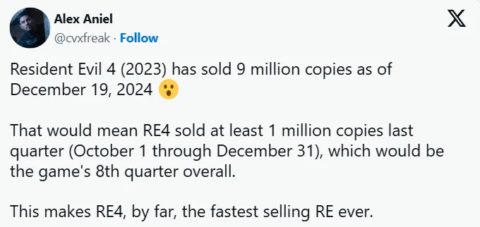 受黄金版和iOS版的推动,卡普空旗下《生化危急4重制版》的累计销量已突破900万套。 信息泉源是CapcomDev1官推,除公布数据外,还放出一张艺术画,游戏中标记脚色,包罗艾达王、克劳萨、萨德勒、门德斯齐聚一堂,玩宾果游戏并享受美食,庆祝这一汗青时间。 《生化危急4重制版》据2005年的原作改编,于2023年3月发行,报告里昂深入邪教村庄,营救总统女儿阿什利的故事。该作被誉为生化系列的迁徙转变点,动作元素变动,而非主打传统可怕体验。 在此之前,《生化危急4》刚发布更新,改善了PS5 Pro的嬉戏体验。 生化危急已成为卡普空最告急的IP,据生化粉丝书《Itchy, Tasty: An Unofficial History of Resident Evil》的作者Alex Aniel透露,生化4已成为系列最脱销之一。对比生化8,后者在第8季才卖出50万套。 重制的风潮在继承,除了《生化危急9》,《生化危急0》和《生化危急:代号维罗妮卡》的重制版热度非常高,只待官宣。 |