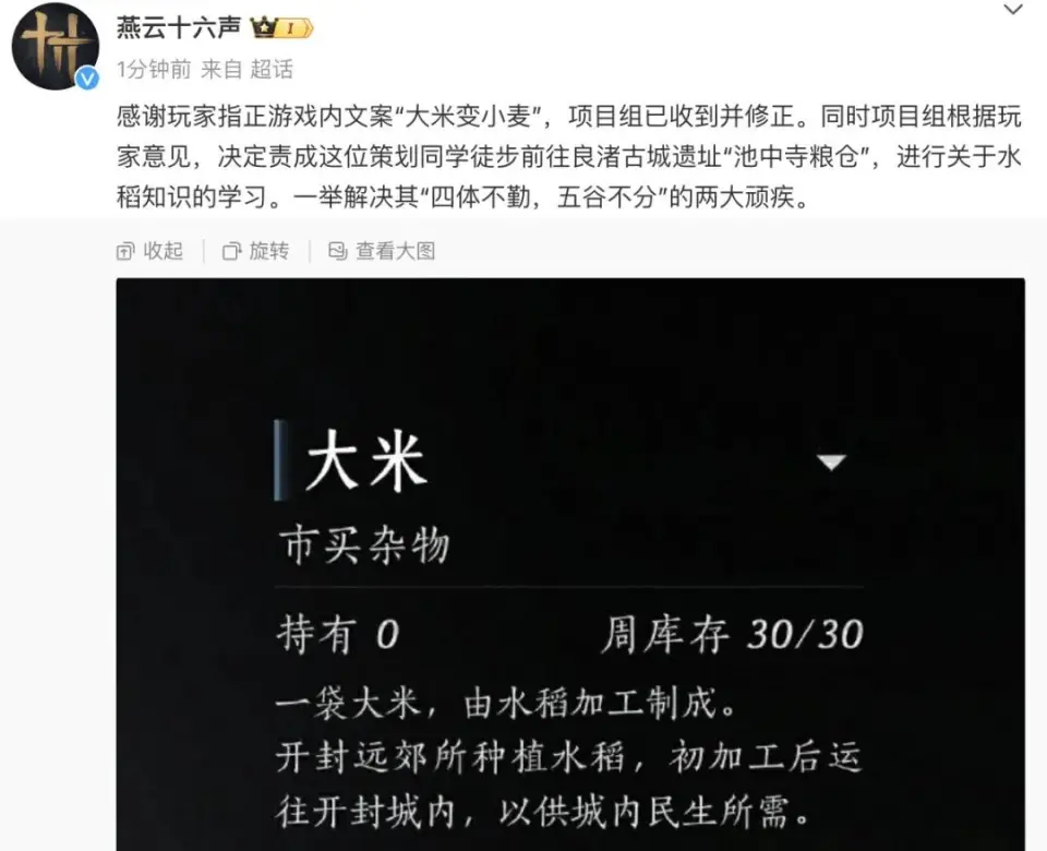 克日,网易旗下一款国产武侠动作游戏《燕云十六声》正式上线,然而有网友发现,游戏中“大米”的描述竟然是:“一袋大米,由小麦加工制成”。 这一文案错误让网友们纷纷吐槽:“怪不得游戏里这么多人吃不上饭,用小麦加工成大米,谁来了都吃不饱!” 尚有玩家质疑,“假如这不是文案失误的话,我可要查策划职员的学历了”“四体不勤,五谷不分!” 1月8日,据媒体报道,网易游戏方面已经举行了告急修复,现在该道具先容界面已更正为“一袋大米,由水稻加工制成”。 8日晚19时许,@燕云十六声 发布声明回应此事,称:“感谢玩家指正游戏内文案“大米变小麦”,项目组已收到并修正。” “同时项目组根据玩家意见,决定责成这位策划同砚徒步前往良渚古城遗址‘池中寺粮仓’,举行关于水稻知识的学习。一举解决其‘四体不勤,五谷不分’的两大顽疾。 ” 《燕云十六声》是一款由Everstone工作室开辟的动作脚色饰演游戏,于2024年12月27日举行公测。 游戏的故事背景设定在五代十国与宋代的瓜代之时,玩家作为一名侠客,开启属于自己的武侠故事。 据悉,该游戏的出书单位是广州网易计算机体系有限公司,运营单位是杭州网易雷火科技有限公司。 微信编辑:吴祈 考核:方雨 【来源:九派消息综合】 声明:此文版权归原作者全部,若有来源错误或者侵占您的正当权益,您可通过邮箱与我们取得联系,我们将实时举行处置惩罚。邮箱所在:jpbl@jp.jiupainews.com |