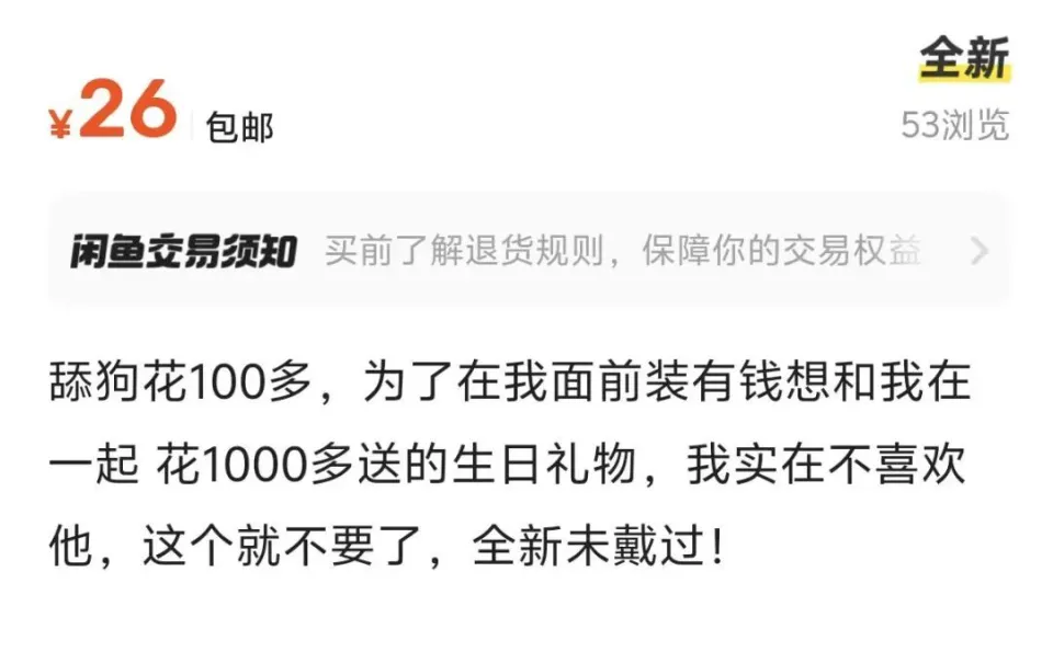 大概大伙想到的,都是有关团购送礼品给抖音挚友的利用。 从前女主播在直播间找榜一年老要礼品,虽然年老刷的都是真金白银,但平台总得抽成吧。 那女主播实际得手的收入,着实是打了折的。 可如果女主播直接加年老抖音挚友,让对方天天送点这的那的。 不就能低成本无风险掏空对方了? 而且收礼品的一方,还不会暴露收货地点和身份信息,榜一年老想找上门都难。 有机友看完大概又要问了,那我如果只想变现,不想要实体礼品咋办呢? 收到礼品后,大可把东西挂到闲鱼上预售,文案写着—— 「舔狗送的,还没确认收货,拍下填你地点」 如许一来,收礼品的人能变现,闲鱼老哥能用更便宜的价格,买到全新的商品。 暴虐么,确实很暴虐。 你没法唤醒一个舔狗,也没法唤醒捞女的本心。 不过抛开网友的调侃来看。 微信和淘宝的「送礼品」功能,照旧有一些实用场景滴。 比如家里父母尊长想让我们资助买点东西,直接送礼比什么“亲情付”要方便得多。 又大概是某天下午,对象想让你请她喝一杯下午茶,这时间「送礼」比直接转钱更有感情代价。
