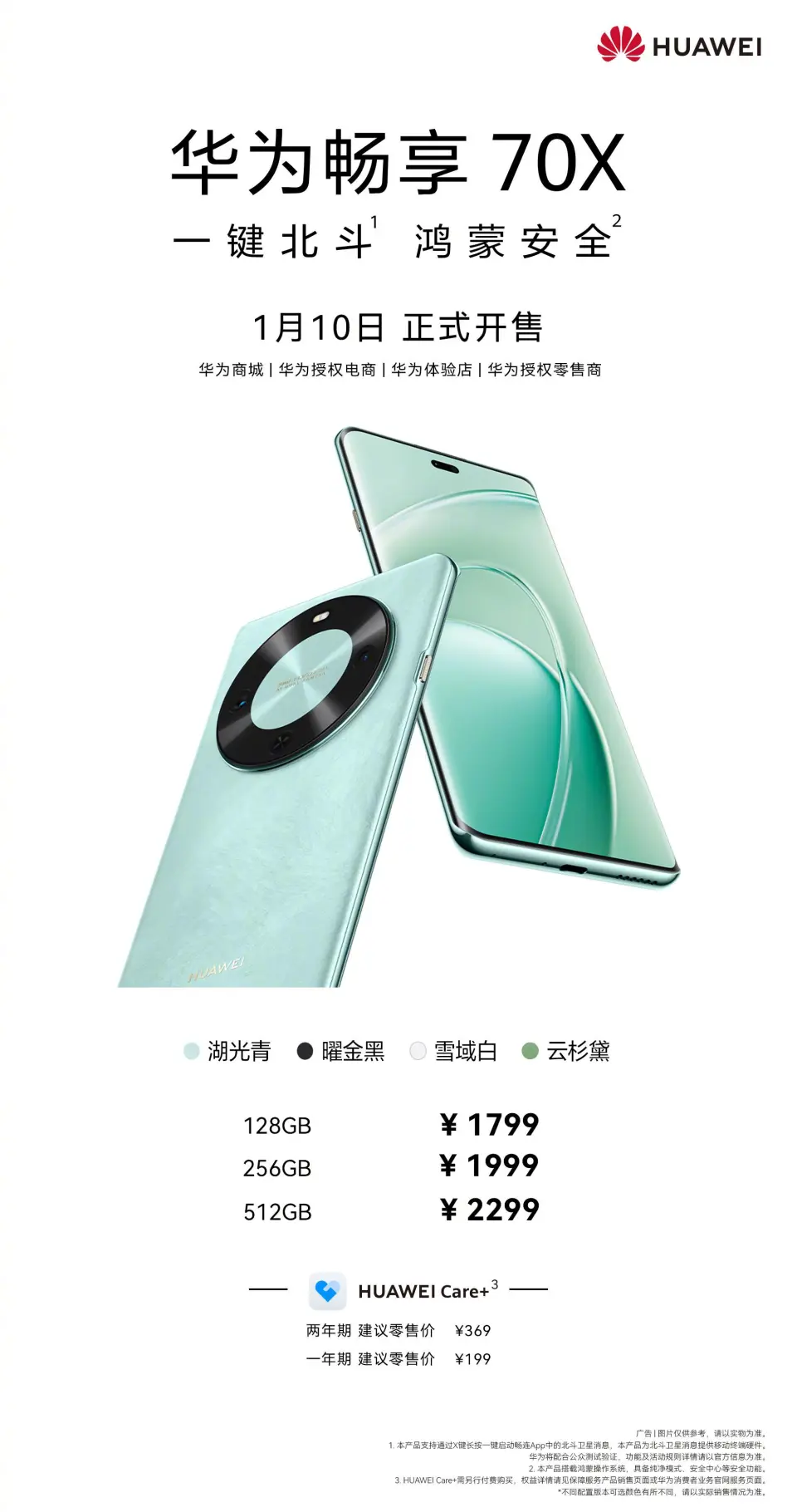 IT之家 1 月 10 日消息,华为畅享 70X 手机今日 10:08 正式开售,支持北斗卫星消息、5000 万 RYYB 暗光影像,IT之家附代价如下: