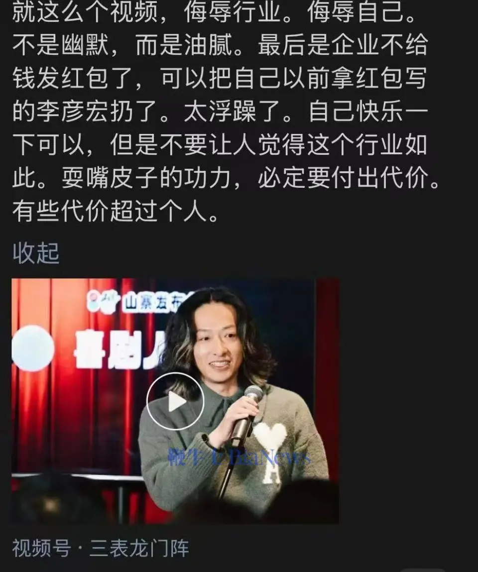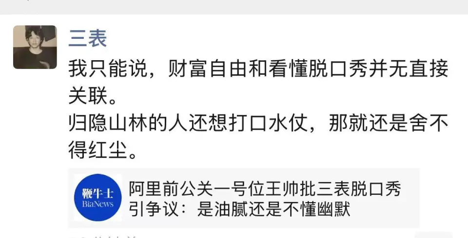 三言科技1月10日消息,昨日,阿里巴巴前公关一号位王帅转发自媒体三表年前在山寨发布会的一次脱口秀视频,称视频欺侮行业,欺侮本身,不是幽默,而是油腻。 王帅称,“太浮躁了。本身快乐一下可以,但是不要让人觉得这个行业云云。耍嘴皮子的功力,必定要付出代价。有些代价凌驾个人。” 对此,三表转发相干报道回应称,“我只能说,财产自由和看懂脱口秀并无直接关联。归隐山林的人还想打口水仗,那就还是舍不得凡间。” |
