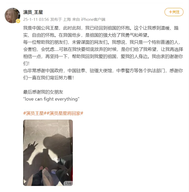 1月11日,@演员_王星 发微博报安全,同时表达了本身的感激之情,详情如下: 来源:@演员_王星 |