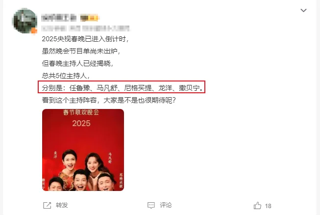 随着 2025 年春节的脚步日益相近,央视春晚的准备工作也进入了最后的冲刺阶段。克日,备受瞩目的 2025 央视春晚总台主持人名单终于灰尘落定,引发了广大观众的热议。 本年的主持人阵容相比以往有了较大的厘革,总共五人,分别是马凡舒、龙洋、撒贝宁、任鲁豫、尼格买提,此中康辉退出,而马凡舒作为女主持全新人参加。 康辉不绝以来都是央视的中流砥柱,他那沉稳大气、字正腔圆的播音腔,以及对节目节奏的精准把控,让观众们对他在春晚上的体现赞誉有加。 此次康辉的退出,无疑让不少观众感到痛惜,仿佛春晚舞台少了一根 “定海神针”。但春晚作为一个不绝推陈出新、注入奇怪血液的舞台,也须要给更多年轻主持人时机,让他们在这个最隆重的舞台上显现自己的风采。 马凡舒作为新人参加春晚主持阵容,无疑是本次最大的亮点之一。她原来在央视五套讲授体育赛事,以芳华靓丽的形象、专业的讲授本事和亲和力十足的主持风格受到了观众的喜好。 此次跨界来到春晚舞台,对于马凡舒来说是一次全新的寻衅和机遇。信任她的芳华活力和独特魅力,会为春晚舞台带来不一样的风景,给观众带来全新的感受,大概她会成为下一个春晚女神。 龙洋也是比年来在央视渐渐崭露锋芒的主持人,她的主持风格大气、沉稳又不失灵动,在之前的节目中显现出了踏实的专业功底和精彩的应变本事。 经过几年的历练,龙洋已经积累了丰富的履历,在春晚舞台上也能更加从容地应对各种环境,继续显现她的风采。 撒贝宁可以说是观众的老熟人了,他的幽默风趣、机智过人早已深入人心。从法制节目跨界到春晚,撒贝宁总是能在舞台上制造出意想不到的欢乐效果,他的高级而不低俗的智慧讥讽,常常能把观众逗得前仰后合,又能在笑声中给人启示,为庄严的春晚增添了几分活泼俏皮。 任鲁豫作为朱军之后的接棒人,业务本事过硬,是稳住场子的存在。他在春晚舞台上多年的主持履历,让他对各种局面都能应对自如,可以大概很好地掌控全场节奏,确保晚会的顺遂进行。 尼格买提则是春晚的老面目了,他亲和力十足,总是能与观众和高朋创建起良好的互动关系,让各人感受到春晚的温暖和欢乐。他的存在就像是春晚的 “门面继续”,给观众带来了亲切和认识的感觉。 2025 央视春晚主持人阵容的大换血,是期间瓜代的肯定效果。新老主持人的瓜代,既生存了春晚的传统韵味,又注入了奇怪的活力。 |