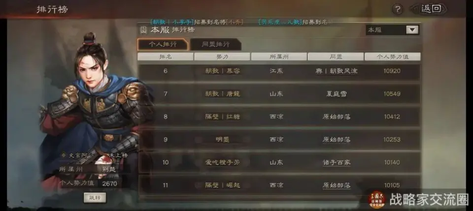 同盟权势前十的属于存案盟(就是前期能查到的备战盟)的有山河、朝歌、万象,分别是河北、山东、巴蜀。