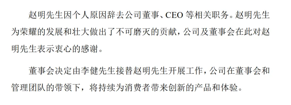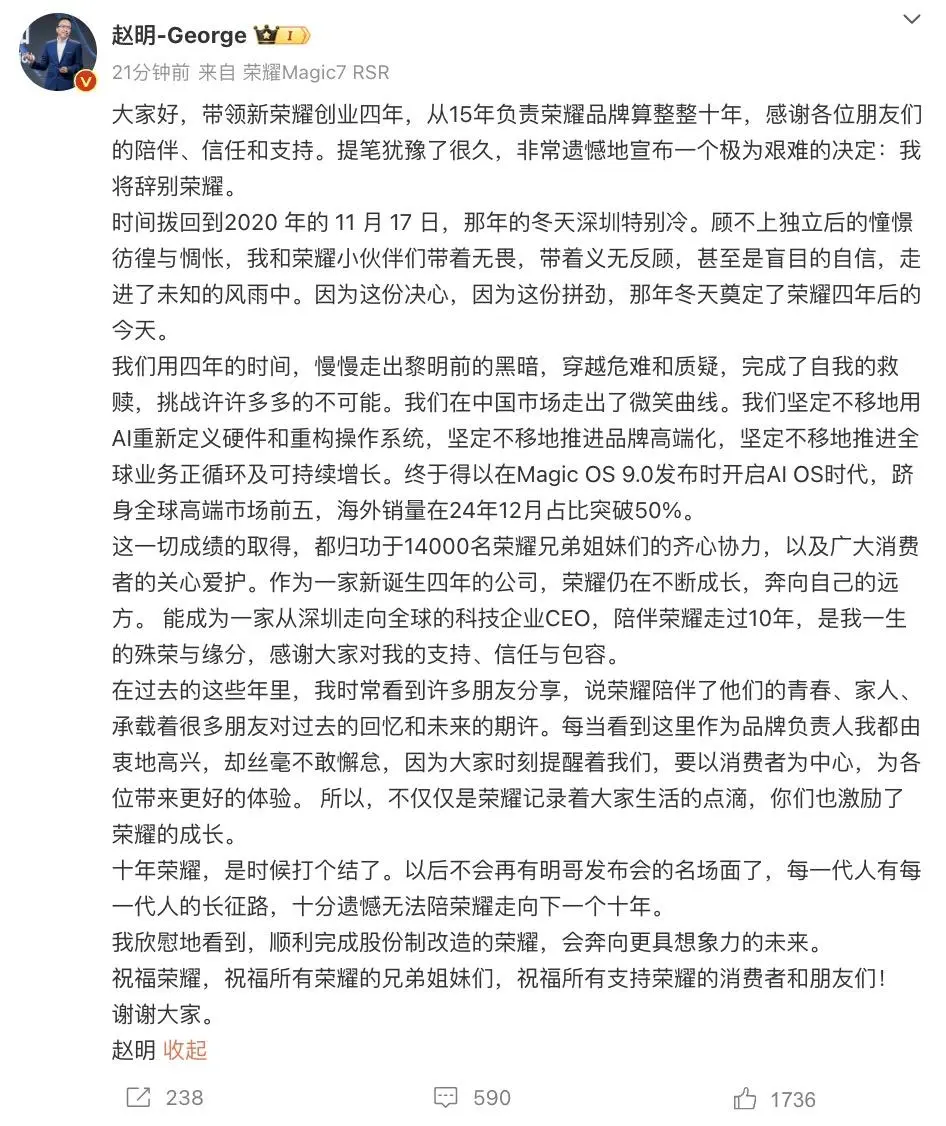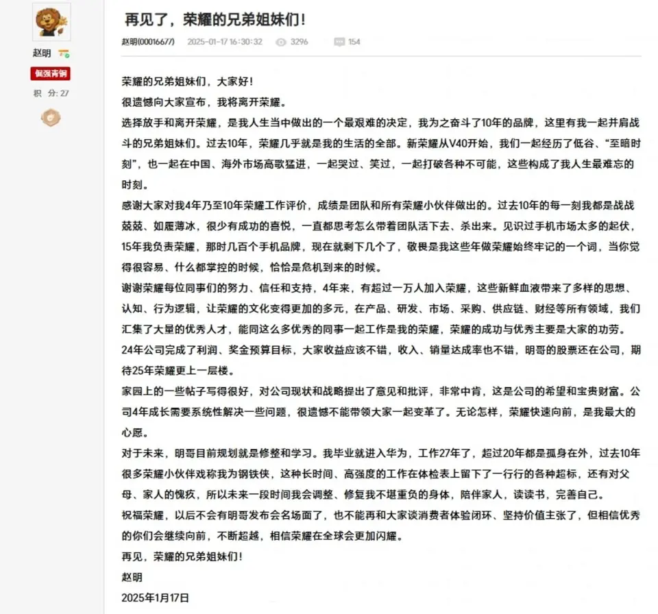 作者 | 云鹏 编辑 | 心缘 智东西1月17日报道,经智东西向光彩方确认,光彩本日下战书在内网正式发公告称,赵明老师因个人缘故原由辞去公司董事、CEO等相关职务。董事会决定由李健老师接替赵明老师开展工作。 公告发布后,下战书16点31分,赵明在光彩内网发布了标题为《再见了,光彩的兄弟姐妹们!》的长信。 赵明在信中提到,选择放手和离开光彩,是他人生当中做出的一个最困难的决定,过去10年,光彩几乎就是他生存的全部,自己“很遗憾不能向导各人一起厘革了”。 就在18点02分,赵明在微博更新了一篇文章,回首了他在光彩的历程和感受: 光彩已于2024年底正式完成股份制改造,光彩IPO历程已进入“倒计时”阶段,光彩此次重要人变乱动发生在这一关键时间节点。 接替赵明的新任CEO李健同样是一位华为老将。李健于2001年到场华为,2017年起进入华为监事会,根据公开报道,李健曾到场过华为公司庞大改革和战略订定,在多个重要战争中有突出向导体现。 2021年李健到场独立后的光彩,先后继续管理团队焦点成员、副董事长、董事、人力资源部总裁等职务。 赵明在信中还提到,过去10年,赵明不停在思考带着团队活下去、杀出来。赵明在信中透露,24年公司完成了利润、奖金预算目标,收益应该不错,收入、销量告竣率也不错,赵明本人的股票还在公司,他期待25年光彩更上一层楼。 就在两天前的1月15日,光彩才“辟谣”过关于CEO赵明离职的传言,称消息不实。没想到事变反转如此之快。 近两年,已有多次光彩上市相关进度消息传出,2024年12月28日,光彩正式完成股份制改造,公司名称变动为“光彩终端股份有限公司”。 有业内人士以为,光彩赵明的职务变动预示着光彩公司正在举行上市前的预备,内部团队或有肯定变动。赵明曾在多次媒体采访中对光彩上市相关题目表达过雷同观点,称上市是董事会要负责的事变,他要做的是谋划好公司,做好产物体验。 赵明修业及职业履历回首: 赵明比余承东小4岁,于1973年出生于上海,毕业于上海交通大学。1998年到2015年间,赵明到场华为公司,历任华为 CDMA/WiMAX/TD-SCDMA 产物线总裁、举世无线办理方案销售部部长、意大利代表处代表、西欧地区部副总裁等职位。 可以说赵明是一名尺度的华为老将。 2015年3月,赵明继续光彩奇迹部总裁,彼韶光彩作为华为旗下品牌,主打线上市场,重要对标小米的红米品牌。 2020年11月,光彩正式独立,赵明继续光彩终端有限公司CEO。 光彩独立初期十分困难,赵明向导团队在三四个月时间里建立起研发、产物、供应链和市场体系,后续光彩在产物高端化、产物线梳理、线下渠道建立、重点深耕AI等关键方向上,几乎都有赵明的关键发声。 2023年11月,赵明正式宣布光彩一系列体系应用和服务与华为彻底切割,在产物定位上与华为苹果直接对标,在塑造品牌形象和产物高端化方面加码布局。 2024年一季度,光彩手机曾迎来自己的高光时候,中国市场出货份额第一,占比到达17.1%,高出华为。这一季度,光彩在600美元以上的高端市场出货量同比增长123.3%,跻身高端三强。 2024年全年,光彩中国大陆智能手机市场出货量4220万部,排名第四,份额与苹果、OPPO几乎持平,均为15%。2023年光彩出货量4360万部,同样排名第四。 根据Canalys数据,近三年,光彩市场份额团体出现波动降落趋势,从2022年一季度的20%降至2024年四序度的14%左右。 在AI手机这一当下行业的关键竞争焦点上,光彩是举世主流手机厂商中走的比力快的一家。 光彩是最早提出用AI重构操纵体系的手机厂商,并发布了基于意图辨认的人机交互以及MagicOS 8.0。 赵明曾多次在公开场合表达光彩对AI的器重。赵明说,MagicOS 9.0是一种AI OS,未来AI手时机向着“主动驾驶”期间发展。 2023年,光彩团体研发投入占到总营收11.5%,AI研发费用累计已达100亿。比年光彩发布的自研技术包罗鸿燕通信、青海湖电池、绿洲护眼屏、巨犀玻璃、鹰眼相机到鲁班钛金铰链等。 在赵明的向导下,光彩在中国智能手机市场已卓有声量。 CEO层面的人变乱动对于企业来说十分重要,有业内人士分析称,光彩此举或为上市做预备,一旦光彩成功上市,其将成为中国第三大上市手机公司,位列小米、传音之后。 面临未来竞争愈发猛烈的AI手机市场,光彩已经领先在了起跑线上,但后续面临的压力依然不小,怎样守住并夺取更多市场份额肯定会成为光彩新向导班子要面临的题目。AI手机之战,各产业品落地速率上的差距不断缩小,技术层面也徐徐趋同,未来要怎样突围,同样是对光彩的巨大考验。 附赵明公开信全文笔墨: 光彩的兄弟姐妹们,各人好! 很遗憾向各人宣布,我将离开光彩。 选择放手和离开光彩,是我人生当中做出的一个最困难的决定,我为之奋斗了 10 年的品牌,这里有我一起并肩战斗的兄弟姐妹们。过去 10 年,光彩几乎就是我的生存的全部。新光彩从 V40 开始,我们一起经历了低谷、“至暗时候”,也一起在中国、外洋市场高歌猛进,一起哭过、笑过,一起突破各种不可能,这些构成了我人生最难忘的时候。 感谢各人对我 4 年以致 10 年光彩工作评价,效果是团队和全部光彩小伙伴做出的。过去 10 年的每一刻我都是战战兢兢、如履薄冰,很少有成功的厦烀,不停都思考怎么带着团队活下去、杀出来。见地过手机市场太多的起伏,15 年我负责光彩,当时几百个手机品牌,如今就剩下几个了,敬畏是我这些年做光彩始