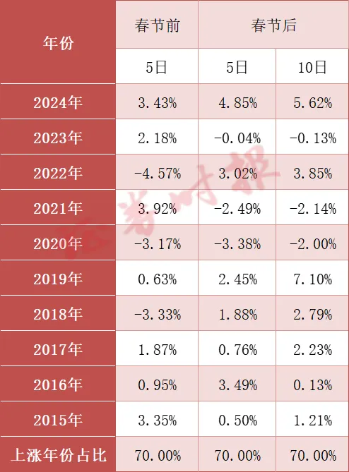 随着2025年春节的脚步越来越近,不少投资者又开始面对持股过节还是持币过节的“灵魂拷问”。 证券时报记者梳理2015年至2024年春节前后A股市场体现发现,春节前后A股上涨概率较高,投资者对春节前后的“红包行情”有所期待。 市场分析人士指出,春节后,随着运动性改善、长假竣事,投资者要重新加仓;与此同时,春节后隔断两会更近,投资者开始对两会政策进行预期和结构。因此,春节后,市场风险偏好会显着升温,交投显着活泼。 有望迎来“红包”行情 汗青数据显示,春节前后,A股市场有着显着的季候性规律体现。 春节前,随着机构资金开始对新的一年继续结构,受机构青睐资产往往在春节前更容易实现上涨。不外,在邻近春节期间,部分投资者担心假期大概出现的利空消息,加上春节前住民消耗会显着增加,个人投资者落袋为安情绪升温。 春节后,随着节前避险资金回流,以及1月金融数据多数实现“开门红”,投资者对经济复苏预期升温,市场风险偏好会显着升温。 据Wind数据统计,2015年至2024年的10年间,春节前后A股大概率上涨。从春节前5个生意业务日来看,10年中有7年上涨,涨幅最大的是2021年,到达3.92%;春节后5个生意业务日,上证指数的上涨年份占比也到达70%,涨幅最大的是2024年,到达4.85%;春节后10个生意业务日,上证指数的上涨年份占比仍有70%,涨幅最大的是2019年,到达7.10%。 近10年上证指数春节前后体现: 市场分析人士指出,A股市场往往有肯定的日历效应。每年年底至次年年初,市场常会有一波可观的“春季躁动”行情,此中春节长假之后的A股向好概率较大。投资者到底应该持股还是持币过节,取决于投资者的持仓质量。 机构期待节后“开门红” 在近期A股市场接连回调后,不少机构投资者对节后市场“开门红”的预期更为剧烈。 复盘汗青履历,海通证券以为,春季行情的开启时间与前一年度的三、四季度行情有关,若三、四季度行情好,则春季行情启动较晚。该机构表示,2025年的开年调解并未改变春季行情的汗青规律。 预测2025年,海通证券表示,随着增量政策出台落地,宏微观根本面有望加速修复。因此,无论从政策催化、运动性,还是根本面角度看,本年春季行情均值得期待。将来随着行情渐渐展开,市场的中期主线将渐渐明确,关注兼具供需上风的中高端制造以及受益于财产周期回升的科技制造。 财信证券指出,市场短期调解仍不改中长期震荡走强态势,后续市场走势仍将取决于政策面及经济根本面。该机构预计,1月下旬,随着外洋变乱扰动效应消退、A股业绩预告邻近尾声,股指将重回政策面及经济根本面驱动逻辑,届时有望迎来新一轮企稳回升行情,近期可逐步逢低结构A股优质资产。 注意市场风格厘革 每年的春节前后,也是市场风格厘革的告急节点。比方,2013年春节后,市场风格从代价切换为发展;2016年春节后,市场风格渐渐从小盘切换为大盘;2019年春节后,市场风格从大盘代价转向大盘发展;2021年春节后,市场从大盘发展转为小盘风格占优。 客岁9月24日以来,在支持并购重组政策不停推出的背景下,小盘风格持续占优,不少小盘股自阶段性底部开启翻倍行情。2025年春节后,小盘风格可否继续上演成为浩繁投资者关注的话题之一。不外,从现在多家券商的观点看,2025年发展风格有望占优。 招商证券以为,在扩内需政策发力之下,2025年宏观经济将进入复苏早期,企业盈利有望止跌回升,受益于运动性驱动的发展风格或体现更好。增量资金角度看,2025年A股资金净流入规模大概高出2024年,ETF有望成为整年主力增量利好大盘风格,融资、私募等资金有望反复活泼使得小盘风格阶段性占优。相比之下,外部运动性或难成为2025年A股风格的决定性因素。 海通国际表示,随着后续增量政策逐步出台和落地,我国宏微观根本面有望逐步修复,进而支持A股走向根本面驱动的向上行情。对应到行业层面,根本面更优的科技和中高端制造为代表的发展或是股市主线。 (泉源:证券时报) |