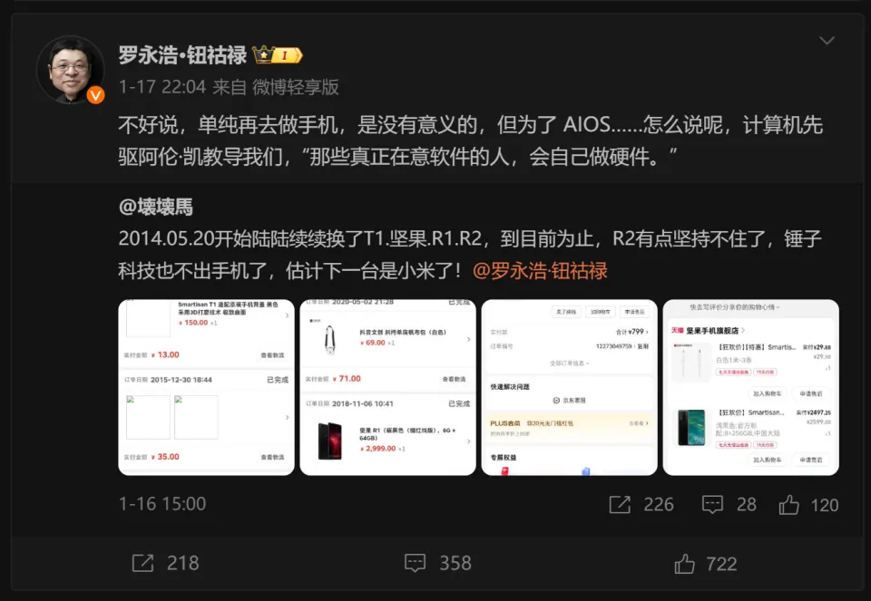盘算机先驱阿伦·凯曾说过:“那些真正在意软件的人,会本身做硬件”。 简直,AI渗透到各个硬件范畴当中,连续发掘应用场景,AI并非单纯的软件植入,为了更好地共同大模子,硬件的形态也发生了变革。智能手机原来只是集通信、娱乐、工作一体的工具,到了AI期间,它正在酿成大模子的载体,又大概说,由于AI的出现,智能手机变得更加“智能”。 4年前,坚果手机业务发生调解,字节跳动公布将原锤子科技团队组建的新石实行室并入教导硬件团队,坚果(锤子)手机倒在AI期间发作前夕,令人痛惜。履历完“真还传”的锤子科技首创人罗永浩,锚定了下一个创业方向——AI硬件,本以为和手机不会再有什么连累,但他迩来和网友的互动,难免让老粉丝的心里泛起一点涟漪。 (图片来自微博) 一位坚果手机的老实用户在交际媒体表现,2014年5月20日开始陆连续续换了T1、坚果R1、坚果R2,到现在为止,R2有点对峙不住了,锤子科技也不脱手机,估计下一台要换小米手机。 他的动态得到了罗永浩本人的关注,并回应称“欠好说,单纯再去做手机,是没故意义的,但为了AIOS......”,并引用了前面提到的阿伦·凯的名言。下方网友批评称“真的吗?我要漂亮的”,得到了罗永浩肯定的复兴:“嗯,漂亮只是基本功。” 这一系列回应无不勾起各人的等待,岂非说罗永浩会为了AIOS,再一次投身到“非传统”智能手机赛道吗? 为了AIOS,老罗要重操老本行?魅族手机的一次战略转身,小雷到现在另有印象。 2024年2月18日,魅族手机官宣克制传统“智能手机”新项目,All in AI打造AI Device(AI装备),并用AI重构Flyme体系。随后发布的魅族21 PRO,官方称其作“AI终端”。同时魅族还提到了各种AI化战略,包罗但不限于去应用化、向OpenAI等大模子团队开放硬件,为AI硬件加持。 小雷印象最深刻的,照旧魅族描画AI装备蓝图时提到了一个雷同“主动驾驶”的本领,即用户输出指令,AI负责中间的机器化利用,直到付款阶段再把决定权交还给用户,省去了很多繁复的交互。 (图片来自星纪魅族) 之所以提到魅族,小雷以为罗永浩口中的基于AIOS打造的硬件,思绪与魅族等手机厂商有些许雷同,就是让智能手机酿成AIOS的平台。 罗永浩再造手机在客岁已有迹象,2024年2月,国家企业光荣信息公示体系表现,罗永浩旗下细红线公司新增“移动终端装备制造、销售”业务。再加上罗永浩在锤子手机期间积聚了丰富的经验和供应体系,再建一款智能手机,理论上没有太多的阻力和难度。 除了硬件颜值很高,罗永浩并未向网友透露太多实质性信息,而且留下了很多牵挂。 就现在来看,不清除细红线造一台“雷同智能手机的AI硬件”的可能,假如有须要的话。但可以确认的一点是,即便是形似智能手机,也是围绕AIOS创建的产物,和“传统智能手机”有本质的不同。 老罗旗下细红线公司从AR转型AI后推出了第一款产物J1 Assistant AI助手,雷科技曾举行过体验,结论是很有“锤科特色”,融入了锤子便签、子弹短信、发牌手以及AI谈天等特性,能看出来罗永浩对AI产物有独特的见解。 (图片来自雷科技) 同时Matter官网还出现了一款名为“JARVIS ONE”的AI硬件,是一款由Wi-Fi、蓝牙、指纹辨认、麦克风等模块构成的“原生AI硬件”,从计划来看更像Rabbit R1之类的“新物种”。 但在小雷看来,这种围绕AI创建的原生硬件还处在概念阶段,没有完满的服务体系支持,可用性远不如成熟的智能手机。正因云云,老罗重拾手机业务,大概有他的考量。 AI手机负责市场,原生AI硬件负责精确AI技能的出现,重新定义了智能手机的脚色。 前面提到魅族All in AI的战略,最重要的思绪就是将智能手机酿成AIOS的平台。眼动手机AI化的趋势很明显,各家手机厂商积极在智能手机中融入AI功能特性,如AI智能相片美化、AI写作、AI谈天、AI摄影等,早期阶段以天生式本领为主。 其实AI手机的下一个阶段已经有所表现,包罗光彩在Magic7发布会上提到的雷同“主动驾驶”的功能,用户输入一个指令,AI助手输出实行步骤,省去大量的人机交互,进步智能装备的交互服从。 这是原生AI利用体系才气实现的主动化技能,与传统的基于原有体系架构改良的AI体系有本质区别。久而久之,这种主动化利用可以改变用户的用机习惯,同时软件生态也会发生变革。当用户不再频仍地与软件界面、手机屏幕交互,软件则会“隐退”成为服务,屏幕也会渐渐“退化”,渐渐酿成Rabbit R1、JARVIS ONE之类的原生AI硬件。 但如许的演化是一个恒久过程,原生AI硬件走得太前,服务配套和市场认知都没有创建起来,没有得当“新物种”的土壤。正因云云,AIOS需要一个更顺应当下市场的平台,小雷以为,智能手机就是最理想的平台。大概说,基于手机、PC等现有形态的产物,都很得当AIOS的生长。 (图片来自豆包AI) 最重要的缘故原由是,智能手机的形态更顺应当下市场对移动终端的需求,软硬件生态和斲丧群体稳固成熟,以此作为AIOS的平台再符合不外。究竟任何技能不投放到市场,不做尺度化、体系化的适配,再先辈都只是空谈。 对于罗永浩的细红线公司而言,智能手机更是一个AIOS的紧张平台,让更多人知道并打仗JAVIS AI助手,起首就需要一个人尽皆知的硬件。更况且,老罗本身就是做手机的一把能手,又有TNT这种突破手机与大屏边界的教导理念,智能手机推广AI的结果,远比JARVIS ONE如许的原生AI硬件有更好的结果。 AI手机负责市场,原生AI硬件负责精确,大