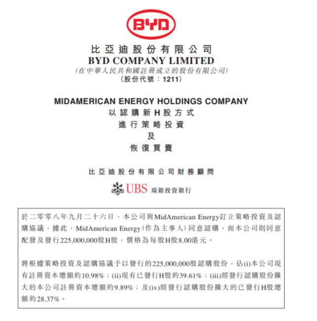 本报记者 李昱丞 在持有比亚迪近14年后,巴菲特选择落袋为安。8月30日,港交所披露易表现,伯克希尔哈撒韦8月24日以约277.10港元/股的均价,出售133.10万股比亚迪H股,套现约3.69亿港元。本次减持后,巴菲特仍持有比亚迪约2.19亿股,占H股比例降至19.92%。 受到消息影响,8月31日,港股比亚迪股份(01211.HK)低开低走,一度跌近13%。A股比亚迪(002594.SZ)一度跌超8%,失守300元/股大关。 此前7月11日,花旗银行席位持有比亚迪股份股数增长约2.25亿股,恰好和伯克希尔哈撒韦持有的比亚迪H股股份数目雷同,引发外界对巴菲特减持比亚迪动作的推测。 回首巴菲特投资比亚迪进程,根据比亚迪公告,2008年9月26日,伯克希尔哈撒韦旗下附属公司MidAmerican Energy(中美能源控股公司)斥资2.3亿美元(约18亿港元)以每股8港元的代价,认购比亚迪H股2.25亿股。 在近14年的时间中,只管比亚迪股价颠簸幅度较大,比方2009年10月下旬至2011年10月下旬跌幅超80%,但是巴菲特刚强持有,一股未卖。在公开场合,巴菲特反复力挺比亚迪,他把王传福列为自己最欣赏的四位CEO之一,巴菲特搭档芒格则歌颂王传福是“爱迪生和杰克韦尔奇的肴杂体”。 这种服从也为巴菲特带来高出33倍的回报。2020年3月尾以来,比亚迪股价走入上行通道,市值一度突破万亿元,逾越大众团体排名环球车企第三,仅次于特斯拉和丰田。按照8月24日减持代价277.10港元/股盘算,不计分红派息,巴菲特在比亚迪股份这只股票上得到了33.64倍收益。 值得留意的是,巴菲特减持比亚迪的时点选择在比亚迪披露中报之前、上半年竣事之后。比亚迪于8月29日晚间公布2022年半年报,其表现停止6月尾伯克希尔哈撒韦旗下WESTERN CAPITAL GROUP LLC(原MidAmerican Energy)持有2.25亿股,尚未开始减持。 比亚迪方面人士告诉《证券日报》记者,根据港股规则,伯克希尔哈撒韦公司持有比亚迪H股比例变动超过整数比例时必要公示,该公司停止2022年6月30日持股2.25亿股,H股持股比例20.49%;停止2022年8月24日持股约2.19亿股,持股比例19.92%,对方在股份变动导致持股比例超过20%时在联交所公示。 当前,比亚迪正处于业绩发作期。根据中报,比亚迪上半年分别实现营收、归母净利润1506.07亿元、35.95亿元,分别同比增长65.71%、206.35%,归母净利润已经高出客岁整年。公司1-6月份累计贩卖新能源汽车64.14万辆,累计同比增长314.90%;此中新能源乘用车63.82万辆,累计同比增长324.84%,已经高出客岁整年汽车销量。同时,上半年比亚迪连续4个月保持单月“10万+”销量,逾越特斯拉成为环球新能源汽车销冠。 “巴菲特此时减持或和其旗下投资公司近期业绩有关。”深度科技研究院院长张孝荣在担当《证券日报》记者采访时以为,比亚迪股价固然靠近汗青高位,但是比亚迪把握了新能源汽车财产上卑鄙关键环节,成为一家新能源生态核心企业,发展性较高。 陪同着美股颠簸,伯克希尔哈撒韦第二季度业绩并不理想,第二季度总收入同比增长10.22%至761.8亿美元,但由于投资及衍生品合约的账面亏损669.19亿美元,第二季度股东应占净亏损高达437.55亿美元,客岁同期净利润为280.94亿美元。 (编辑 孙倩) |