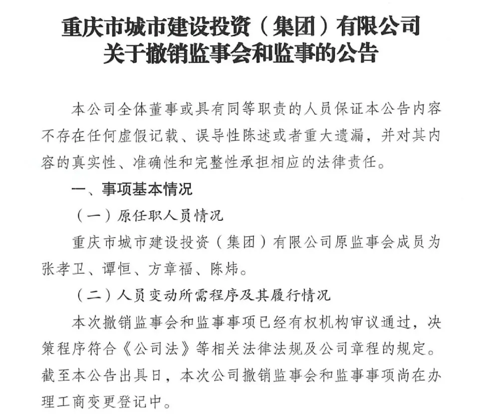 本文泉源:期间周报 作者:周松清 重庆国企改革衔枚疾进。 1月20日,重庆市都会建立投资团体有限公司(简称:重庆城投团体)发布公告,将打消监事和监事会,并已经获得有权机构审议通过,决定步调符合《公司法》等相干法律法规及公司章程规定。相干工商资料正在变更登记中。