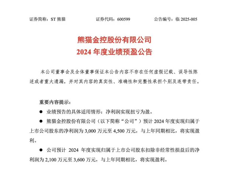 (文/王力 编辑/徐喆)1 月 22 日晚,ST 熊猫(600599.SH)发布 2024 年度业绩预报,数据表现,公司预计 2024 年度实现归属于上市公司股东的净利润为 3000 万元至 4500 万元 ,而在 2023 年,则亏损 2.12 亿元,这也标记取 ST 熊猫乐成实现了扭亏为盈。 扣非净利润方面,预计 2024 年为 2100 万元至 3600 万元,与上一年亏损 2.01 亿元相比,同样大幅提拔。