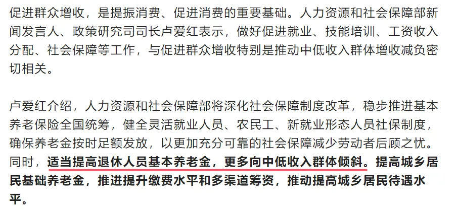 人社部定调!2025养老金调解向中低收入倾斜,“提低限高”来了? 2024年12月,中央经济工作集会定调得当进步退休职员基本养老金,进步城乡住民底子养老金后,财务部和国家发改委都先后做出了雷同的表态,如今又轮到人社部。 1月21日,人社部召开消息发布会,表现2025年要做好四方面的工作,此中之一就是健全社会保障体系。这内里有一句话是:得当进步退休职员基本养老金,更多向中低收入群体倾斜。进步城乡住民底子养老金,推进提拔缴费程度和多渠道筹资,推动进步城乡住民报酬程度。 短短一句话,信息量却很大。许多人解读为是不是要对基本养老金调解方式举行改革了,“提低限高”是不是要来了? 怎么明白这句话呢?起首,哪些人是中低收入群体?如今,天下大概有1.4亿城镇职工退休职员,包括机关古迹单位退休职员和企业退休职员。 根据之前发布的数据,机关古迹单位退休职员均匀养老金高出6000元,他们应该不算中低收入群体。而制止到2023年,企业退休职员均匀养老金是3162元,经过2024年的调解后,预计高出3200元。 企业退休职员养老金低于3200元,应该就算是中低收入群体,特殊是高龄退休职员,由于我国社保制度创建比力晚,那些退休比力早的高龄职员,缴的就比力少,导致养老金也不高。尚有就是在艰苦偏远地域工作的职员,他们当地的均匀工资程度低,以是调解的也不高。 其次,怎么向他们倾斜呢?如今还没有公布详细的方案。但“提低限高”的大概性不大,为什么这么说呢?“提低限高”的说法传播许多年了,却不停没有实现,缘故原由就是它和“多缴多得,长缴多得”的鼓励机制相违背。 试想一下,如果交多交少,都领同样的养老金,交的少,乃至涨的更多,谁还乐意多交呢? 不过,遵循“多缴多得,长缴多得”的鼓励机制,并不影响向中低收入群体倾斜。养老金三个调解方式中,定额调解和倾斜调解,就可以让养老金调解向中低收入群体倾斜。定额调解固然都是调解一样的金额,但至少不会拉大差距,而倾斜调解是进步中低收入群体养老金最好的方式。 第三,为什么要向中低收入群体倾斜?在客岁底召开的中央经济工作集会上就提到,要给中低收入群体增收减负。 怎么增收?给中低收入群体多涨一点养老金,就可以实现增收。中低收入群体数目巨大,也是消费的主力军之一。2025年消费要挑大梁,以是必要大力大举提振消费。给退休职员进步养老金,并向中低收入群体倾斜,就是一个方向。 尚有一个重点,人社部说的是2025年的工作重点,也就是说单独指2025年,来岁不一定还会继续向中低收入群体倾斜,以是,“提低控高”的说法就不成立。 不过,我个人以为在服从“多缴多得,长缴多得”鼓励机制之外,缩小养老金差距是局面所趋。 |