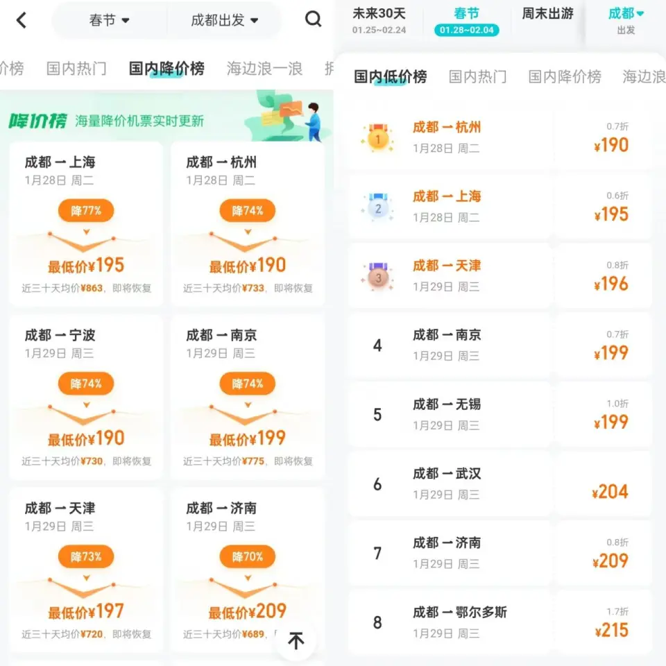 红星资源局1月25日消息,春节前夕,多条航线贬价,部分航线低至百元。去哪儿数据显示,如天津-上海裸票代价最低145元。 以成都出发的机票为例,春节假期期间,成都到上海贬价77%、到济南贬价70%、到杭州贬价74%。在低价机票方面,春节假期期间,成都飞往杭州、南京、武汉、无锡、天津、上海等城市均只需200元左右。 (截图自去哪儿APP) 红星资源局在采访中相识到,机票定价权掌握在航司手中,航司根据及时供需、客座率、航班总收益等指标动态调整代价。 对于贬价后能否退差价,红星资源局今日致电多家航空公司客服职员,发现各家航空公司退改政策不一。比方, 机票代价节前“跳水” 各地前去海口、三亚的机票降幅最高 本年春运从1月14日开始,到2月22日竣事。民航局在1月3日的例行发布会上先容,春运客流量有望创同期历史新高,民航游客运输量预计将凌驾9000万人次,全国日均航班筹划约18500班,同比增长8.4%。从订票数据看,春运期间北方哈尔滨、长春、乌鲁木齐等“冰雪游”目标地和南边海口、三亚等“避寒游”目标地游客量都将会有较大幅度增长。 不少人担心机票售罄,早早买好了机票,但是之后发现贬价了。一位消耗者告诉红星资源局,她于1月15日在去哪儿网购买了三张1月31日成都飞往南京的机票,一共耗费4200元。1月23日,她发现同批次航班贬价了,三张机票只需3636元,贬价574元。她盼望平台能退差价,现在正在宁静台协商。 另一位消耗者则称,她在1月16日通过 去哪儿数据显示,1月26日至28日部分热门航线机票代价比春运高峰期自制超500元。以北京至三亚航线为例,1月25日北京出发直飞代价为1965元,之后渐渐走低,1月26日出发最低1700元,1月28日(除夕)当天出发最低1159元。 据去哪儿盘货的国内热门机票贬价榜,1月26日-29日各地前去海口、三亚的机票代价降幅最高,如1月28日上海-三亚,同比近30天均价贬价幅度近55%,贬价金额超500元;1月26日成都-海口贬价53%,最低606元起;北京-三亚,贬价44%,最低764元起。 去哪儿大数据研究院分析,往年春运高峰会合在腊月二十七到腊月二十八,而本年却有所差别——由于不少人会选择1月26日、1月27日调休拼假,2025年1月25日(腊月二十六)将成为本年春运的出行高峰。春运高峰提前的同时,1月26日至1月28日形成相对的出行低谷,票价也更自制。 团体来看,本年春节前机票代价和去年同期相比根本维稳,出现小幅下滑。据第三方出行平台“航班管家”数据显示,制止2025年1月23日,对比2024年春运类似提前期预订周期,2025年春运国内航线经济舱平均票价(不含税)约882.7元,同比微降4.6%(同期为925.4元)。 代价谁来定?贬价能否退差价? 国内某OTA平台负责人告诉红星资源局,机票代价不是平台来定,是航司来定。该负责人分析称,机票代价的高低一样平常与预订时间早晚没有肯定接洽,最紧张的缘故起因在于市场供求关系。在远期,无法正确预知市场需讨情况下,运力投放有限;临近出行高峰,随着需求高涨,运力增长,供给大概过剩,这个时间机票代价大概就会降落,降幅取决于供求失衡的水平。 上述负责人称,春节黄金周具有显着的“潮汐”活动特性,反映在机票代价上,假期前从一线城市或地域中央去往劳务输出重点地域以及热门旅游目标地的机票代价相对高,假期后半段则会快速回落,返程机票的代价大概会快速上升。针对机票代价贬价后能否退差价,该平台表现机票退改按照航空公司政策实行。 此前,民航专家韩涛担当红星资源局采访时也表现,机票代价是由航空公司决定,这是票价的源头。中国民航高质量发展研究中央专家綦琦此前也告诉红星资源局,机票是航司提供的产物,代价由航司决定,OTA平台只是一个在线虚拟买卖业务市场,是一个拉拢平台。 韩涛表现,航空公司会根据客座率、市场需求、竞争状态等因素及时调整机票代价,在旅游高峰期,如暑期,代价变更会更加频仍。OTA平台会按照肯定的频率革新机票代价和库存,但由于革新存在延伸,用户在差别时间点看到的代价大概会有所差别。 当机票贬价后,消耗者可以要求退差价吗?1月25日,红星资源局咨询各大航空公司。中国国航客服职员称,因票价接纳“随订随售”的模式,代价会随着时间和订座情况进行变更,无法退差价。 南边航空客服职员表现,若乘客购买南航国内客票(不含港澳台航线)后,发现类似航程、类似日期、类似航班号的南航现实承运航班原舱位品级或更高舱位品级票价低于原购客票票价,可于出票时间24小时内提出申请,南航将在游客购买新票后,免费办理原购客票退票。 红星新闻记者 俞瑶 曾汉 编辑 肖世清 |