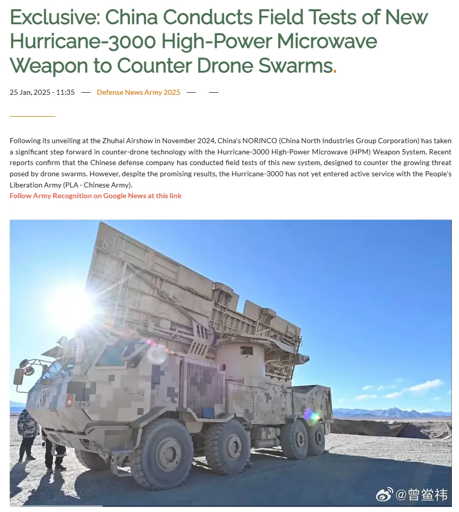 继2024年11月在珠海航展上亮相后,中国北方工业团体的“飓风3000”高功率微波武器体系又在反无人机技能范畴迈出了告急一步。近来的报道证明,中国北方工业团体已经对这种新型体系举行了实地测试,旨在应对无人机群日益增长的威胁。不外,固然取得了可喜的结果,但“飓风3000”如今还没有进入中国人民解放军服役。 本文是比利时《陆军承认》网站发布的一篇专栏文章,由本人翻译并编辑给各人。由于本文作者为比利时人,对中国实际环境的了解告急泉源于网络,以是部分认知与实际环境不太符合,请各人理性对待,本人翻译此文章只是为了转述外国职员在分析从我国网络平台流出的照片后表达的一些见解,并非本人观点,盼望各人可以或许理解。 无人机在今世战役中的利用越来越频仍,正在举行的俄乌辩说就是活生生的例子。无人机被用来侦探、打击,以致是自尽式的攻击,表明确传统部队在无人机群眼前的脆弱性。辩说两边都利用无人机来获取战术上风,这导致天下各地的部队都在寻求先辈的反制步调。随着无人机的利用不绝升级,对于可以或许克制无人机群的体系需求变得尤为告急。 “飓风3000”正是中国北方工业团体针对无人机威胁所推出的办理方案。该体系利用高功率微波能量,针对无人机的电子元件举行攻击,使其失效大概被摧毁。传统的防空导弹体系资源高昂且轻易造成附带侵害,而高功率微波武器则提供了一种资源效益高、正确且风险低的办理方案,可同时应对多种无人机威胁。 中国北方工业团体举行的实地测试体现出了良好的结果,特别是在必要快速清除无人机群威胁的环境下。“飓风3000”安装在一个高机动性底盘上,配备了强盛的微波阵列,可以或许产生猛烈的电磁脉冲来粉碎小型无人机的控制体系。该体系可以或许探测到6公里以外的目的,并在4公里范围内对其举行光学跟踪。纵然是3公里以外的微型无人机,也能正确锁定并摧毁 中国北方工业团体的专家先容,与传统家用微波炉只能在30厘米范围内加热食品差别,“飓风3000”的有效作战范围为3公里,是家用微波炉的1万倍。该体系的工作原理与微波炉雷同,发射高功率微波束,对目的举行电磁攻击,刹时烧毁目的的电子元件和控制装置。该体系的运行速率靠近光速,险些可以刹时摧毁目的。无论是击落单架无人机,照旧对无人机群造成大规模粉碎,“飓风3000”的杀伤力能显现出良好的作战效能。 在一次测试中,一架小型无人机在飞行途中被击落,验证了该体系的作战效能。“飓风3000”已被证明可以打击各种规格的无人机,从用于侦探的小型无人机到用于正确打击的大型无人机。别的,该体系的快速反应本领确保了它可以或许在极短时间内应对快速移动的空中威胁。与传统的反无人机体系差别,“飓风3000”不必要正确对准,也不易受气候条件干扰,可以或许在各种环境下高效运作,是将来防御武器库中的多面手。 “飓风3000”的高功率微波束还起到了雷同“半球形蚊帐”的作用,可以或许覆盖半径3公里的范围,可防止无人机的饱和攻击。这项功能在应对大规模无人机群时非常告急,可有效防止任何无人机入侵受掩护的空域。总体而言,“飓风3000”代表着定向能武器范畴的一次巨大飞跃,为对抗无人机群提供了一种可扩展、经济高效且反应敏捷的办理方案。 随着军事部分对定向能技能的投入不绝增长,中国北方工业团体通过“飓风3000”的积极不仅展示了中国在这一范畴的进步,也反映出环球在反无人机计谋上向创新与高效转型的趋势。随着其他国家继续探索雷同体系,将来的空中防御大概会发生巨大变化,而像“飓风3000”如许的高功率微波体系将在下一代防御技能中发挥焦点作用。 |