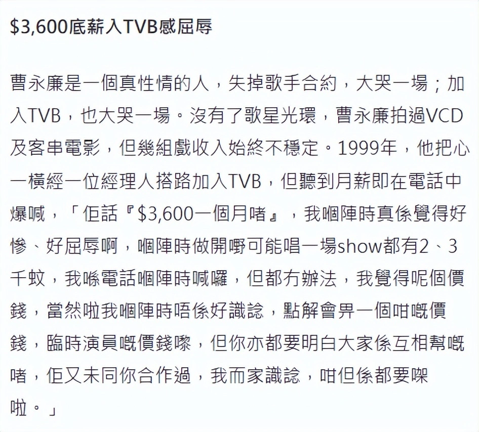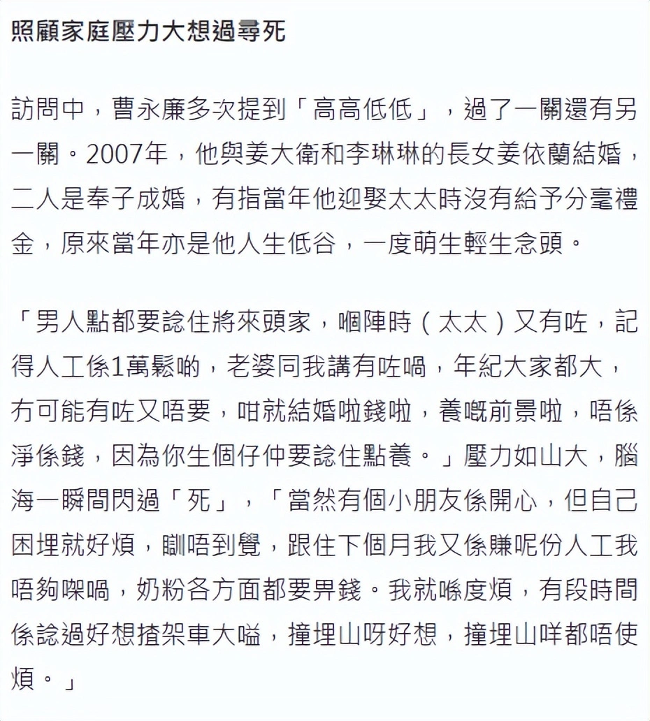 60岁港星曹永廉在《能手仁心II》出演“向众仁”而被观众熟知,只管不是第一号男主,但曹永廉在香港最少也是二三线的演员,其时的工资程度却远不如打工族。 1月26日,曹永廉担当港媒采访曝光,他在采访中表现,1999年参加TVB,其时一个月工资只有3600港币(折合人民币3300元),其时随便去夜店唱一首歌都可以抵在TVB一个月的工资,曹永廉哭了好久,但无可怎样,也认为自己只值临时演员的价格。 曹永廉在2000年出演《能手仁心II》走红,不外工资程度没有多大变化,到了2007年才涨到一万港币,其时曹永廉和太太未婚先孕,因为口袋没钱,囊中羞涩的他一度想过自杀。曹永廉特别感谢邵美琪,因为对方乐意放低姿态和他炒CP,让曹永廉赚了很多外快,终极还清了外债。 曹永廉的太太姜依兰是姜大卫和李琳琳的爱女,两人低调来往多年,2007年奉子完婚,在此之前,曹永廉不但没钱给彩礼,以致尚有十多万的外债,一时间陷入两难,听到太太说“有了”,心烦意乱无法入眠,因为自己的工资根本不敷养小孩,偶然间开着车都想往大山撞去。 所幸曹永廉没有因为一念之差想不开,起初还想去看生理医生,发现看一次要900港币,末了只能找朋侪倾吐,在朋侪的劝解下才逐步走出人生低谷,儿子出生之后,曹永廉的古迹也有了转机,接拍了不少广告,总算是撑了下去。 究竟上,曹永廉的“贫苦”与原生家庭有关,他的家中有四兄弟,曹永廉排第三,15岁那年父亲谋划的工厂走下坡路,一家六口只能挤在不到10平米的木屋,夏热冬凉,一到下雨就有水流到床上,因为是家里没有茅厕,晚上去公厕常常会踩到粪便,如许的生存情况,导致他从小悲观。 曹永廉高中没毕业就开始做暑假工,先后做过临时演员、装修工人、干净工、超市副经理,以致女性内衣售卖员,他从小喜欢唱歌,终极在一次歌唱角逐中拿下冠军,90年代的香港乐坛神仙打斗,曹永廉根本没有出头之日,因为多张唱片的销售结果不理想,公司终极和他解约。 其时曹永廉身无分文,三十多岁尚有十多万的外债,逐日以泪洗面,终极决定去TVB拍戏,但听到工资只有3600港币的时间,曹永廉大哭一场。 时隔二十多年,曹永廉回想过往照旧念念不忘,现在的他在TVB站稳了脚跟,也有不错的收入,因为多次饰演反派角色,还被网友评为“无线御用罪犯”。 究竟上,曹永廉的长相和谈锋都不错,加上岳父又是武打明星姜大卫,要是有点时机的话,完全可以大红大紫,只不外造化弄人,相比二十年前贫无立锥,现在的曹永廉一家四口家庭美满幸福,也算是逆袭乐成了。 |