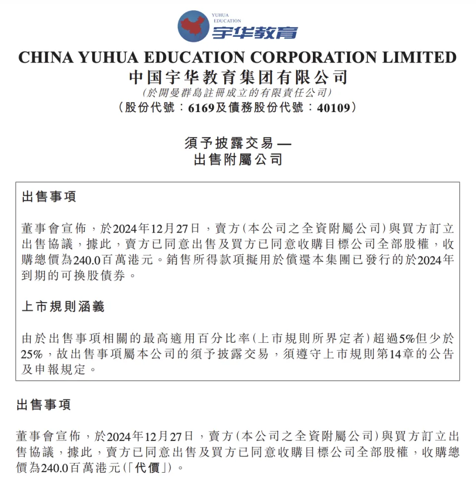 曾经的香饽饽,现在已经无人问津。 港股民办高教板块,已经跌入谷底,且现在仍旧没有转好的迹象。 根据统计表现,港股21家民办高教公司,已有11家股价跌破了1港元,此中不少跌幅超过了90%。 民办高教公司作为一个较为特别的商业群体,其一共分为两大板块,分别为营利性的和非营利性的,而营利性的民办高教公司告急是依赖学费及过夜费等获取收入。 非转营对于民办高教公司而言,具有告急意义。 2017年2月,宇华教育登岸港股市场,成为了“民办高教公司第一股”。以后,新高教团体、中教控股等行业龙头先后赴港上市。 仅2018年至2020年,就有15家教育公司在港乐成上市。由此,港股的民办高教板块正式成型。2021年,港股高教板块迎来“高光时候”,中教控股市值突破500亿港元,宇华教育市值突破300亿港元。 但这种高光时候并未维持多久,随着“双减”的落地,新东方、好将来等教培行业的龙头暴跌,港股高教板块也未能幸免。从2021年下半年开始,港股高教板块广泛大跌,跌幅在90%以上的比比皆是。 以宇华教育为例,顶峰时期其市值一度突破了300亿港元,现在其总市值仅剩13.35亿港元。而造成这种征象的,除了自身问题之外,告急就是行业自己的问题,在这种配景下市场对于这种大型的重资产投资并不看好。 值得留意的是,股价的暴跌导致了公司自己融资受限,进而引起了连锁反应。此前,由于陷入债务风波,宇华教育吃尽了苦头。时至本日,宇华教育仍旧处于停牌状态。 12月尾,为避免可转债违约,宇华教育董事会主席李光宇,连着签发三则公告,宇华教育公布,将出售泰国斯坦福国际大学,所得的2.4亿港元用于偿债。 疯狂扩张的代价2002年,《民促法》的颁布后,民办教育进入了黄金发展期。 在此之前,宇华教育以“北京大学附属中学河南分校”为名创建了第一所K12学校。在此之后,宇华教育开始安稳扩张。 2017年,资源市场在教育板块掀起了投资热,宇华教育则顺遂在港交所挂牌。彼时,宇华教育已发展为拥有1所大学和24所K-12学校的大型民办教育团体。 上市之后,宇华教育开始了极速扩张的步调。 根据统计表现,上市一年多的时间,宇华教育就吞并了两所学校。此中包罗,以14.3亿元吞并的全国老牌民办本科高校湖南涉外经济学院及其附属学校;另外就是以1.07亿元并购的开封市最大的民办高中之一开封市祥符区博望高中。 除此之外,宇华教育还将眼光盯向了国外。2019年2月,宇华教育以2.18亿的价格并购了泰国斯坦福。据悉,该大学在泰国设有两个分校,告急提供国际及泰国本科及研究生学位课程。其课程包罗商业管理、传媒、酒店管理及信息技能,课程、课程范畴及学位获泰国教育部和大学事件部全面认可,而该大学也已获录入大学事件部的泰国认可私立大学名单。2019年7月,宇华教育又乐成地并购了山东英才学院…… 2019年12月,为了保障现金流,宇华教育发行了一笔20.88亿港元的可转债,也就是这一笔可转债,终极让宇华教育陷入到了债务的“泥潭”之中。 随着扩张的步调以及行业的景心胸提升,宇华教育一起高歌猛进,走出了河南开始全面扩张,已成为了覆盖幼儿园、小学、中学、大学全部范畴的教育团体。 规模的提升的同时,公司的股价也开始狂飙,其市值一度突破了300亿港元。而代价就是,公司的债务规模也越来越大。 2021年,行业风向开始急转直下,宇华教育也开始剥离旗下的K9业务。在宇华教育快速切割之下,从2021年8月31日竣事起,K9业务不再归并报表。以后,宇华教育的股价开始暴跌。仅一年时间,宇华教育跌幅就超过了85%。 从扩张到紧缩,宇华教育在极速的刹车之下,债务风险开始放大。 因此,从2022年开始,这笔可转债就成了悬在李家父女头上的达摩克利斯之剑,为了归还这笔可转债,李光宇、李花父女二人想尽了办法。但由于民办高教公司无法直接利用旗下院校资产偿债,因此,团体的归还本领十分有限。 根据当时发债的条件,宇华教育需在2024年12月27日之前全部归还这笔可转债。但根据宇华教育的此前发布公告,团体尚有未转换的可转债本金额仍旧高达9.14亿港元。 停止现在,宇华教育在国内仅剩9所学校,分别为5所高中和4所大学及职业学院。 断臂求生,果断出售2024年12月27日,宇华教育发布两则公告,一共涉及三条信息: 第一,换股债券的详细处理处罚步伐; 第二,公司2024财年年报延长刊发、继续停息股票交易; 第三,出售泰国斯坦福。 一家坐拥百亿资产的民办教育团体,被一笔9.14亿港元可转债逼到了骑虎难下的地步。由此也不丢脸出,宇华教育的资金周转困难。 为相识决债务问题,李光宇和李花也并未逃避责任,而是果断脱手,出售了泰国斯坦福。根据出售协议,这笔生意业务价格为2.4亿港元,预计本次出售,将录得1.2亿元利润。 宇华教育称,出售事项可扩大现金流量,用于归还债务。 侃见财经以为,只管这一笔出售可以大概缓解公司的现金流,但照旧杯水车薪。根据21世纪商业批评消息,在此次公告披露前坊间就有宇华出售院校的听说流出,但目的却是郑州工商学院。 根据此次可转债协商结果,持有75%可转债的投资者同意,宇华先赎回4.3亿港元可转债,剩下的欺凌转换为约6.6亿股股份。公司将通过征求同意书的方式,尽快开始实施,不迟于2025年3月31日。 值得留意的是,倘若终极探究失败,债券持有人有权要求宇华付出7050万港元现金的同意费。 固然,和眼下的逆境比