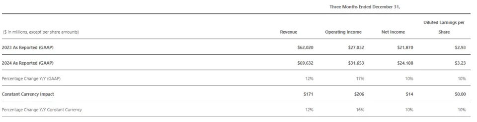 1月30日消息,美国本地时间周三美股收盘后,微软发布了停止2024年12月31日的2025财年第二财季财报。财报体现,微软第二财季营收为696.3亿美元,同比增长12%;净利润为241.08亿美元,同比增长10%;每股摊薄收益为3.23美元,同比增长10%。财报发布后,微软股价在盘后交易中下跌逾1%。 以下为微软第二财季财报要点: ——营收为696.3亿美元,与上年同期的620.2亿美元相比增长12%,而LSEG观察的分析师均匀预期为687.8亿美元; ——净利润为241.08亿美元,与上年同期的218.7亿美元相比增长10%; ——每股摊薄收益为3.23美元,与上年同期的2.93美元相比增长10%,而LSEG观察的分析师均匀预期为3.11美元; ——运营利润为316.5亿美元,较上年同期的270.3亿美元增长17%; ——毛利润为478.3亿美元,高于上年同期的424亿美元; 按部门分别 1.微软第二财季生产力和业务流程(Productivity and Business Processes)古迹部营收为294.4亿美元,与上年同期的258.5亿美元相比增长14%(按固定汇率盘算增长13%),高于StreetAccount预期的288.9亿美元。此中: ——微软365贸易产物和云服务收入同比增长了15%,重要得益于微软365贸易云收入增长了16%(按固定汇率盘算增长15%); ——微软365斲丧者产物和云服务收入增长了8%,重要得益于微软365斲丧者云收入增长了8%; ——LinkedIn收入增长9%; ——Dynamics产物和云服务收入增长15%(按固定汇率盘算增长14%),重要得益于Dynamics 365收入增长了19%(按固定汇率盘算增长18%)。 2.微软第二财季智能云业务(Intelligent Cloud)古迹部营收为255.4亿美元,与上年同期的215.3亿美元相比增长19%,但低于StreetAccount推测的258.3亿美元。此中: ——服务器产物和云服务收入增长21% ——Azure和其他云服务收入增长31% 3.微软第二财季更多个人盘算古迹部(More Personal Computing)营收为146.5亿美元,与上年同期的146.4亿美元根本持平,高于StreetAccount预期的142.9亿美元。此中: ——Windows OEM及装备收入增长4% ——Xbox内容和服务收入增长2% ——不包罗流量获取本钱在内的搜刮和消息广告收入增长21% (按固定汇率盘算增长20%) 现金流 停止2024年12月31日,微软持有的现金、现金等价物和短期投资总额为715.6亿美元。而在停止2024年6月30日,该公司现金、现金等价物和短期投资总额为755.4亿美元。 在2025财年第二财季,微软以股票回购和派发股息的情势向股东返还了97亿美元现金。 高管点评 微软董事长兼首席实行官萨蒂亚·纳德拉(Satya Nadella)表示:“我们正在整个技能栈中举行创新,资助客户充实开释AI的投资回报,以把握将来的巨大机会。目前,我们的AI业务年化收入已突破130亿美元,同比增长175%。” 微软实行副总裁兼首席财务官艾米·胡德(Amy Hood)说:“在第二财季,微软云业务收入到达409亿美元,同比增长21%。我们将继承在运营服从和云及AI根本办法投资之间保持平衡,确保恒久增长。” 股价变更 美国本地时间周三,微软股价报收于每股447.2美元,下跌了0.91%。财报发布后,停止本文发稿,该股在盘后交易中下跌近1%,目前每股交易价格为442.33美元。微软股价自2025年以来累计上涨了6%,而同期尺度普尔500指数上涨了3%。 已往52周,微软最低股价为385.58美元,最高股价为468.35美元。按照周三的收盘价盘算,微软市值约为3.3万亿美元。(腾讯科技特约编译金鹿) |