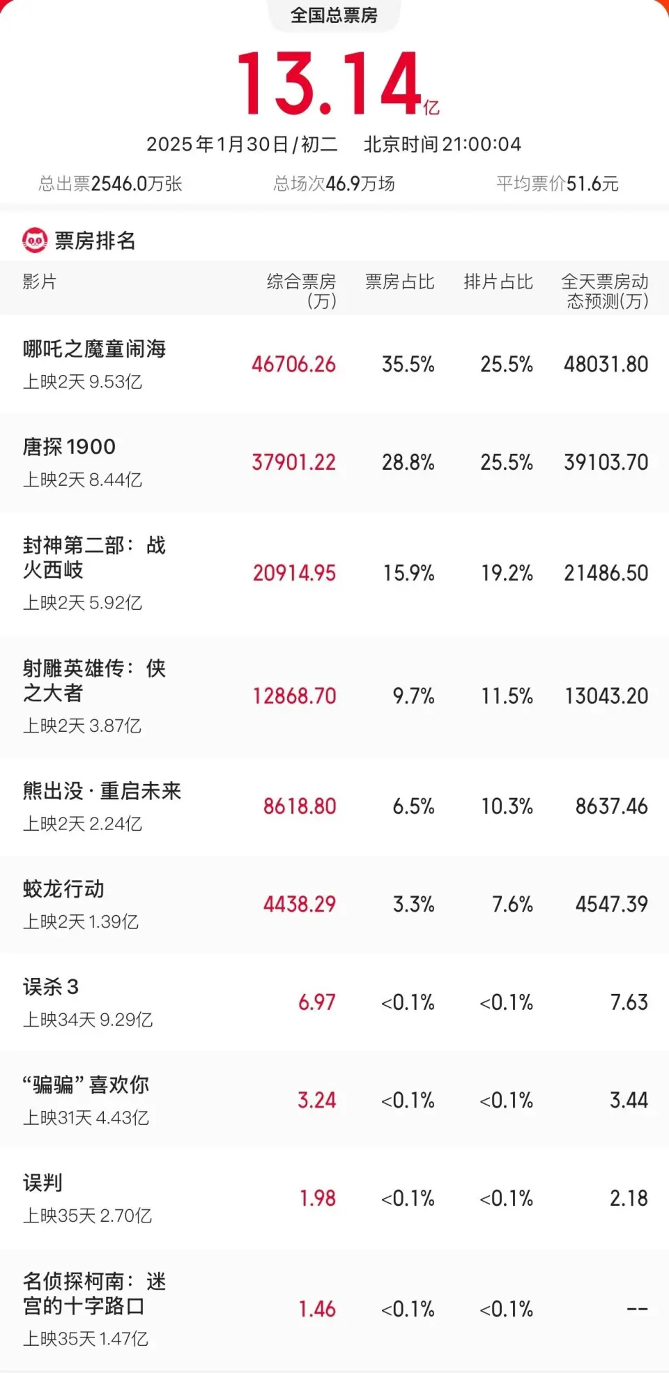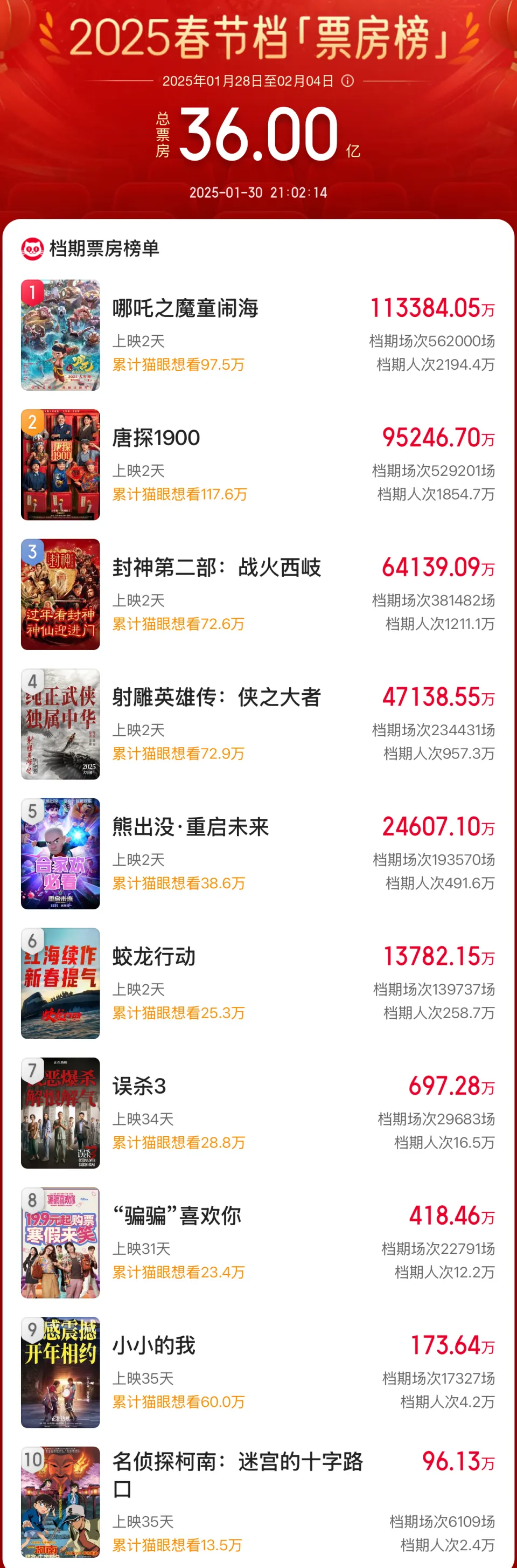 据网络平台数据 停止1月30日21时 2025年春节档总票房36亿 大年初二单日票房13.14亿 一连2天大盘单日票房破10亿 《哪吒之魔童闹海》一连领跑春节档票房榜 军事武侠加魔幻 笑剧探案合家欢 多样题材纷至沓来 2025年开年好戏 你最等候哪一部? 春节档影戏任你来选 大年代朔,共有六部国产新片会合上映,包罗《封神第二部:战火西岐》《哪吒之魔童闹海》《唐探1900》《蛟龙举措》《熊出没·重启未来》《射雕好汉传:侠之大者》。详情>> (总台央视记者 许盼盼) 2025中央广播电视总台版权全部。未经允许,请勿转载利用。 |