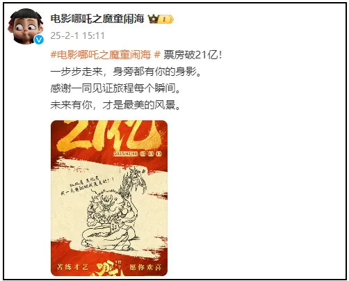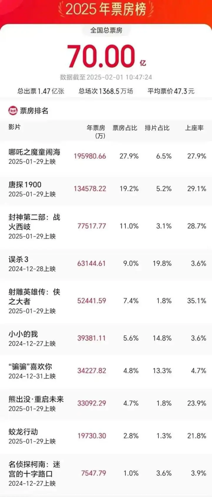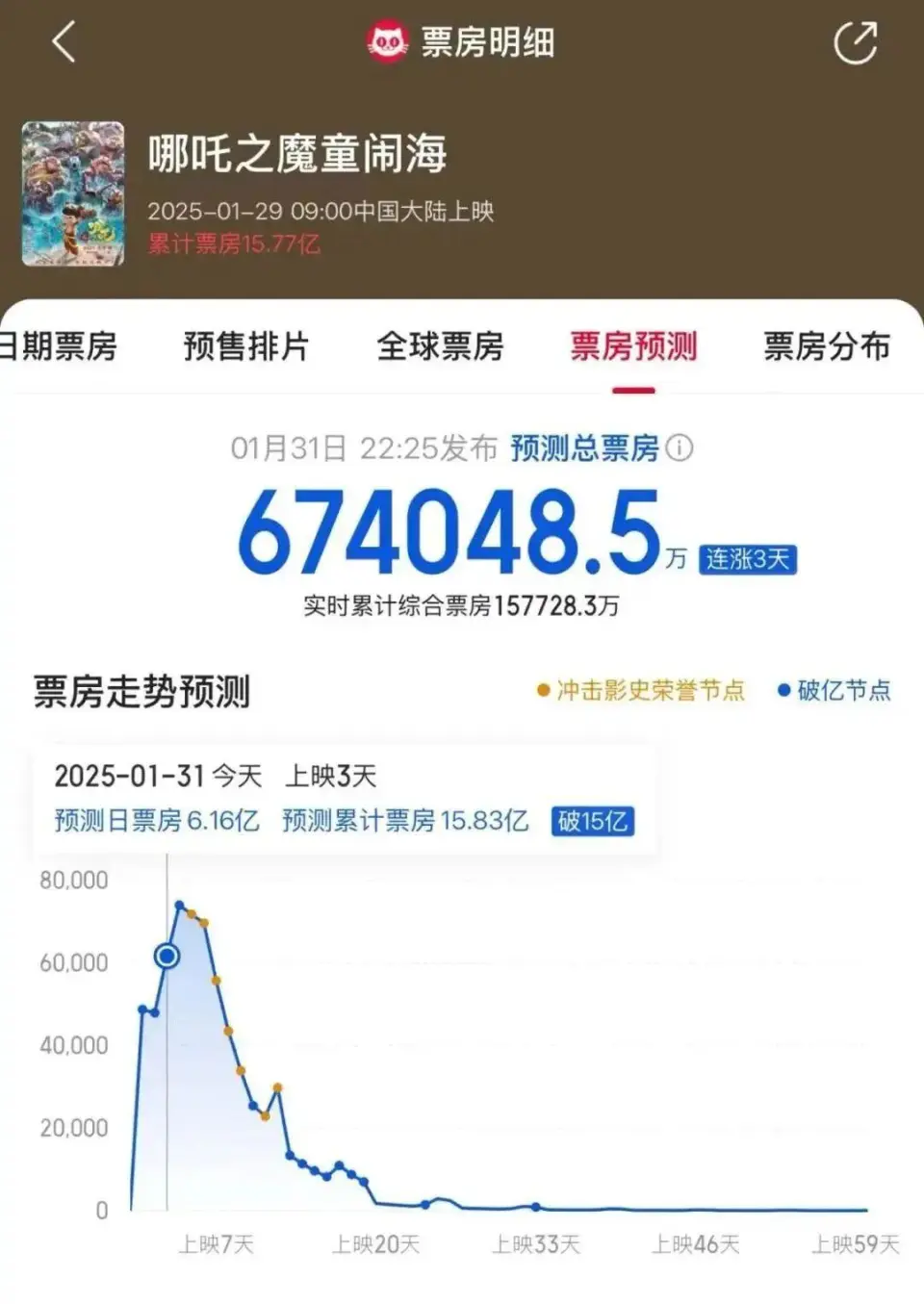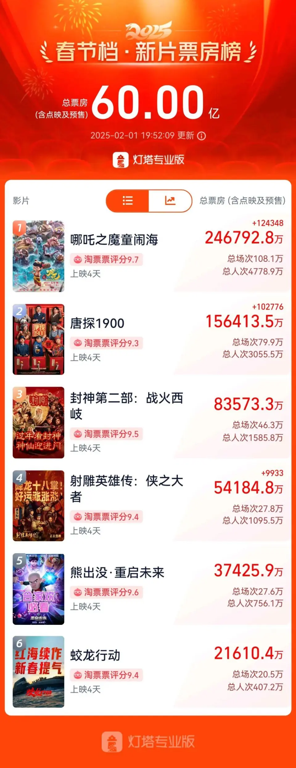 据网络平台数据 2月1日19时52分 2025春节档总票房(含预售)破60亿! 《哪吒之魔童闹海》《唐探1900》 《封神第二部:战火西岐》 分列春节档票房榜前三位 很多网友表现:没想到《哪吒之魔童闹海》能这么悦目,还要二刷! 上映仅四天,《哪吒之魔童闹海》的票房便如火箭般飙升,豆瓣评分也一起升至8.6分,好评如潮。从《哪吒之魔童降世》到《哪吒之魔童闹海》,观众们期待了五年,但每一帧画面都证实白这份期待是值得的。不少观众在交际媒体上纷纷表现,看完影戏后已经开始期待《哪吒3》的到来。 1月31日,影戏《哪吒之魔童闹海》单日总票房超6.1亿元,这也是中国影戏票房排行榜上第三部单日票房破6亿的影片,上映3天总票房超过18.5亿元。据灯塔专业版数据《哪吒之魔童闹海》最新猜测总票房61.16亿元,猫眼专业版猜测哪吒2总票房或超67.4亿,将大幅超过《长津湖》57.75亿元,成为中国影史首部票房破60亿元的影戏。 这个春节假期的影戏档,你pick哪一部? 早期回顾 |