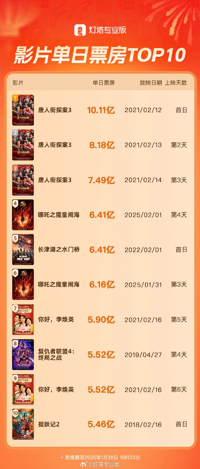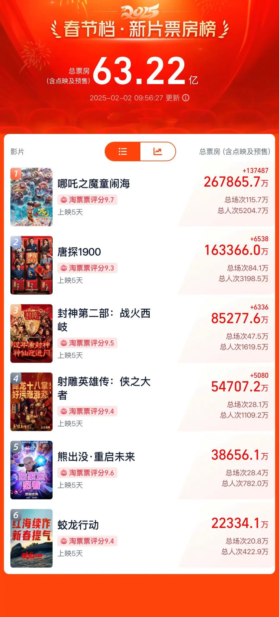 据网络平台数据,制止本日9时32分,2025春节档总票房(含预售)破63亿。《哪吒之魔童闹海》《唐探1900》《封神第二部:战火西岐》分列春节档票房榜前三位。 别的。据灯塔专业版,2025大年代朔至大年初四累计票房超57.4亿,超过2021年代朔至初四累计票房(57.33亿),成为历史春节档同期票房新高! 其中,制止2月2日9时22分,影片《哪吒之魔童闹海》票房突破26亿。2月1日单日票房突破6.41亿!进入中国影史单日票房榜前四。 泉源:央视消息、灯塔专业版 报料、维权通道:应用市场下载“晨视频”客户端,搜索“报料”一键直达;或微信添加报料客服:xxcbcsp;或拨打热线0731-85571188。如需内容相助,请拨打政企服务专席19176699651。 |