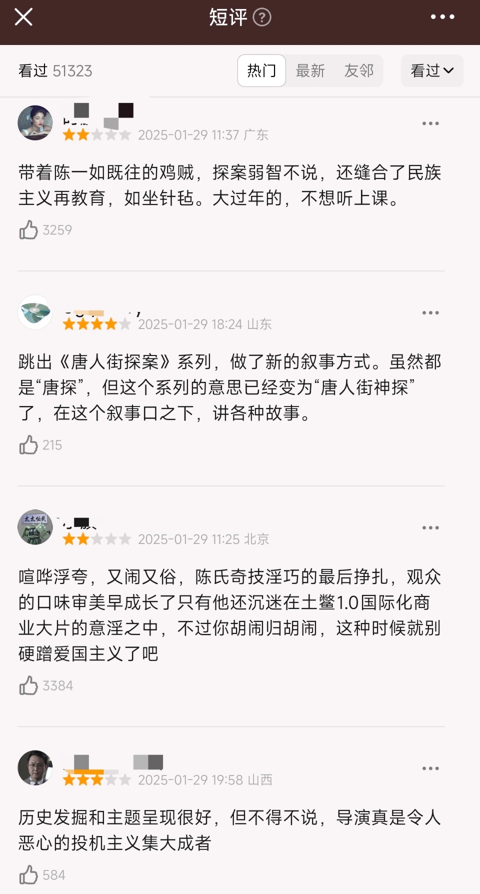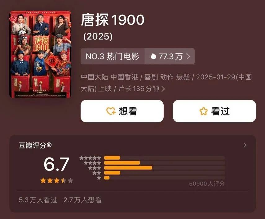 谁说没人看影戏了? 这个春节档彻底是爆了。 本年春节档首日票房就到达了18亿,突破国产影戏历史纪录,截止到发稿前,春节档大盘已经凌驾80票房,仅用六天时间冲破了客岁的总和。 大盘飞起,是由于影戏具有竞争力,险些每部影戏都是大IP。 而故意思的是,在一众大制作中,位居票房榜首的竟然是动画片《哪吒2》,其次才是《唐探1900》。 《哪吒2》能拿冠军不难明白。 究竟发挥稳固,口碑爆棚,8.5分开局,无论是专业媒体照旧路人观众都挑不出弊端。 而第二名的《唐探1900》固然票房咬得很紧,截止到发稿前刚刚突破20亿票房,推测也有35亿。 适口碑却判若云泥。 一个8.5分,一个6.7分,这快要两分之差就是天壤之别。 走出影院的观众,有人吐槽喧嚣闹腾,有人吐槽爱国教诲,有人说陈思诚照旧老一套。 这样看来,春节档竣事前,《唐探1900》很有大概连6分都保不住。 可这就能证实《唐探1900》是烂片吗? 实在否则。 陈思诚,作为中国票房第三高的导演,同时也具备巨大争议。 人们都说,他就是当代的王晶,只懂得怎么从观众兜里掏钱。 但换个角度来看,陈思诚能让观众乖乖掏钱,这也不也恰好证实白,他具备可以大概满足观众需求的本领吗? 你想看什么,我都能给你,这岂非也算“烂导演”吗? 看完《唐探1900》,我想把本年第一个大拇指送给陈思诚,他真正做到了让观众在春节能和家人坐在一起,轻松笑一笑。 不是陈思诚必要春节档,而是春节档必要陈思诚。 陈思诚的商业片本领会合展示《唐探1900》不是唐探系列的续作,可以说是前传,也可以说是发生在平行宇宙的故事。 走出影院,如果用一句话来形容这部影戏,那就是: 《唐人街探案》9周年豪华升级版。 本片无论是脚色、剧情、布局都与唐探前作一脉相承,而唯一的区别是陈思诚将这9年间累积的本领都融进了这一部影戏中,大可以看做是陈思诚对商业片本领的会合展示。 剧情是老一套。 1900年,美国唐人街发生命案,说著名的“开膛手杰克”来到了美国,杀害了一名白人女子和一名印第安人。 白人女子是立法委员的千金,兹事体大,而碰巧有人看到当地华人帮派的少爷在现场颠末,遂被怀疑。 帮派老大”白轩龄“为了摆脱儿子的怀疑,特别邀请英国的著名侦察福尔摩斯前来查案,却阴差阳错把使命交付到了中医“秦福”身上,与印第安死者的儿子“阿贵”构成一队,在唐人街睁开探案。 脚色设定照旧老一套。 王宝强和刘昊然照旧经典的“没头脑与不高兴”组合。 一个负责脑力部分提出理论知识,一个负责实践部分操刀就干。 布局也是老一套。 开场先抛出一个悬案拉高观众等待,而在主角查案的过程中,情节不绝升级,新脚色不绝加入,由个人案件辐射到多方权势的暗中比赛。 到了第三阶段案件开始清楚,末了脚色下线的下线,该领盒饭的领盒饭,正反方一顿嘴炮打完收工。 哦对了,还有陈思诚系列影戏的经典计划—— 当你以为凶手被绳之以法时,彩蛋里总会出现一个更大的幕后黑手,给观众一个终极的反转。 可以这么说,只要你看过《唐探系列》,甚至说陈思诚导演、监制的影戏,那本片的所有剧情走向都能看出似是故人来的影子。 每一个元素都像是从陈思诚的常用素材库中取出来的积木,熟练搭建成面前这样一部影戏。 我想许多人得知白人女和少爷的关系时,后续的剧情就都猜个八九不离十了。 固然,一个套路重复用,也能证实这是陈思诚用快要10年时间研究出来的不败公式。 《唐探1900》在商业性上绝对完成了90%。 我看的那场影戏,全场爆满座无虚席,但没有一个人刷手机或睡觉,自王宝强出现后笑声就没有停过。 笑剧与悬疑齐头并进,四条故事线并行依然能做到清楚抓人,引人入胜,叙事节奏如手术刀般精准,笑料也摒弃了屎尿屁,转而向年轻人更喜好的无厘头和冷幽默。 王宝强模拟枪声那场戏我都笑蒙了,整个影戏院险些都要被笑声翻开天花板。 从制作角度来看,无论是笑剧照旧悬疑,无论是叙事照旧美术、置景、选角,《唐探1900》都无可挑剔,做到了丝滑流通,一口气浑身心看完136分钟。 对比隔壁被全网怒喷的蓝色巨人,《唐探1900》到现在还没有一条被网友会合吐槽的缺点。 没犯错,在春节档就是已经是乐成。 商业之外也有表达然让人惊喜的是,套路之外也有新意。 比如,王宝强这次不同于系列中的“唐仁”。 这次他的性格进行了180°反转,从插科讥笑、谋利倒把的咸湿中年男,变成了老实慎重,甚至是有些悲剧底色的复仇者。 而刘昊然的脚色也非天才少年,固然脑袋也很灵光,但更多的却是靠中医的“望闻问切”来错位破案。 会有失误,也会有精彩的灵光乍现。 固然最大的改变是,这一次陈思诚不再一味寻求高兴,在笑剧表达之余也有自己的严厉表达。 为什么要把配景时间计划在1900年? 那是大清之亡时,也是民初走向共和的火苗闪耀之时,而这两条命案不但是一个华人被怀疑,也是千千万万个在美国求生的华人被怀疑时。 排华法案风起云涌,命案的背后,是西方天下给所有华人的逐客令。 而许多人没有注意的还有,王宝强的脚色是清末“左券华工”的后代,他是华人,又被印第安人收养长大。 他有着本土情结,但同时又与劫掠他人土地的美国人有着同样外来人的对位关系。 让这样一位华裔印第安人出现,陈思诚的讽刺很大胆。 从“阿贵”的视角来看,不管是从华裔血脉照旧印第安人身份,美国人那卖弄的自