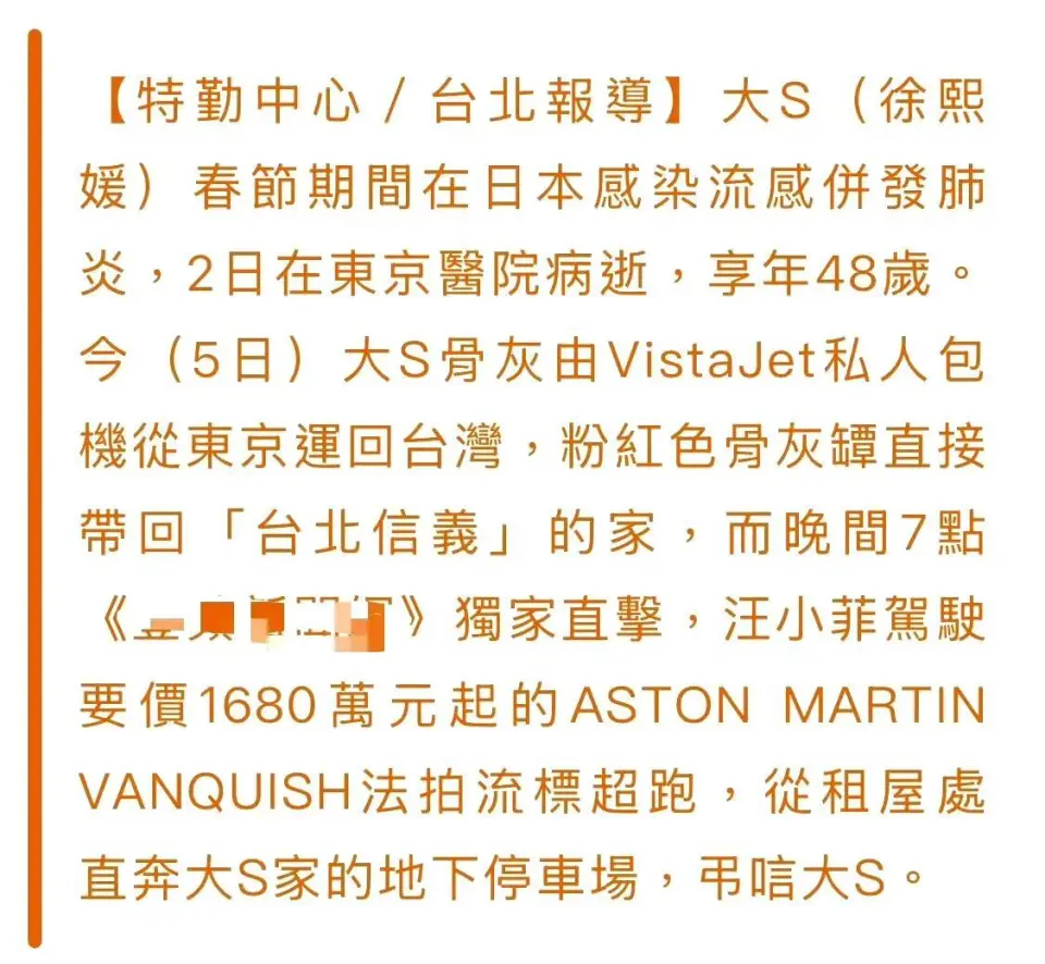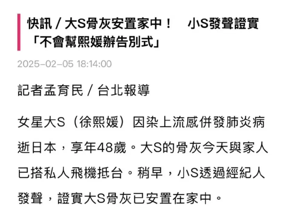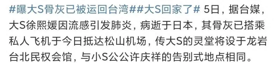 据台媒报道,48岁的大S徐熙媛由于流感引发肺炎,在新春佳节猝逝于日本,很快遗体就在当地火化了。直到2月5日,大S的骨灰才搭乘私家飞机抵达台湾。 大S的骨灰由丈夫具俊晔一起护送,在下车的时间可以瞥见,具俊晔戴着帽子、口罩和耳机,整个人全副武装,现场的氛围也非常极重伤心。 除此以外,大S的两个孩子小玥儿和小箖箖也搭乘这趟飞机,同妈妈大S一同返台。在照片中两个孩子都戴着口罩,小玥儿容貌形状落寞、缄默沉静不语,一起上都低着头,感觉眼睛都哭红了,还时不时地扶着车门强装冷静。 大S骨灰刚落地,前夫汪小菲就开着代价1680万台币的豪华跑车,从出租屋飞奔到大S的地下停车场,疑似前来吊唁前妻。 而此前小S就通过经纪人发声,称大S骨灰已经抵达台湾,现在安置在家中,并且不会帮熙媛准备告别式。按照汪小菲的性情秉性,本来就没有见到大S末了一面,如今徐家也不举行告别式,以是他只能出此下策,突入大S家吊唁了。 对于汪小菲的做法,批评区南北极分化非常严峻,一部分网友以为汪小菲又在演戏立蜜意人设了,偏偏每次都能被媒体拍到。另一部分网友则表现,两个孩子失去了妈妈,肯定伤心欲绝,作为爸爸汪小菲去照顾孩子天经地义。 自从大S病逝后,汪小菲的感情似乎彻底瓦解了。先是把头像由与马筱梅的情侣合影改成黑头像,背面又带着老婆从泰国直飞台湾。 在飞往台湾的飞机上,汪小菲泣不成声、痛哭流涕。抵达机场后,面对铺天盖地的镜头和记者,汪小菲容貌形状含糊、满脸愁容,还对着媒体深深鞠躬,希望各人能多说说大S的好话,还称大S是本身的家人。 落地台湾后,老婆马筱梅搭乘出租车先回到了住处,而汪小菲淋了雨30分钟并徒步回家,一起上氛围极重、容貌形状哀怨,衣服和头发都淋湿了。 以后汪小菲更是不顾现任老婆的感受,在有关大S的视频批评区里留言“老婆,我好想你”,有部分网友看不懂汪小菲的疑惑操作,发文怒怼他是“装货”,汪小菲则复兴称,我装我不对,死的人应该是我,谢谢你骂我,谢谢你爱熙媛。 互撕是真的,爱也是真的,逝者已矣,生者更必要刚强地活下去,两个孩子已经失去了妈妈,希望徐家和汪家可以不计前嫌,握手言和,让小玥儿和小箖箖在充满爱和包容的情况中茁壮长大! |