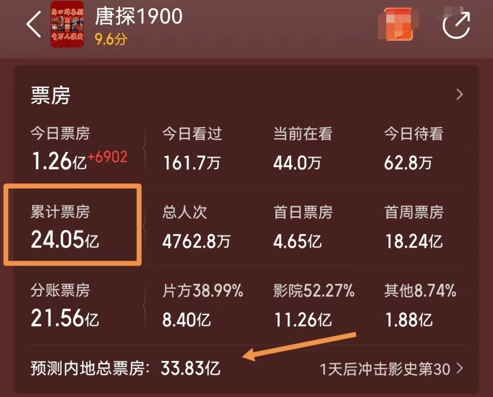 “中国有句古话:此一时,彼一时,三十年河东三十年河西。” “假如那里强盛了,谁还来这边……” ——摘自影戏《唐探1900》中周润发和王宝强口中的台词。 2024年,陈思诚做了一次大胆实验,用不一样的镜头语言和我们解释了影戏《解密》,固然该片票房只收到3.34亿,但他讲故事的本事却进步了一个档次。 在《唐人街探案3》口碑扑街之后,陈思诚回归“唐探宇宙”系列,用了四年,经心打造了全新脚本,系列前传《唐探1900》在这个春节档和各人晤面了。 那么,此片是重蹈了上一部的口碑覆辙,还是大张旗鼓,给观众带来不一样的惊喜呢? 啡哥春节档看的第四部影戏便是《唐探1900》,在此,我将结合票房与本身的观影感受,和各人共同探究一番。 一、春节档收官,《唐探1900》夺得亚军。 2025年春节档硝烟散尽,美满收官,可谓几家欢喜几家愁。 今年和往年的竞争大有差别,在《哪吒之魔童闹海》大爆之后,阶梯式的走势非常显着,越是强横的影戏,票房越高,越是低迷的影片,越没有观众答理。 垫底的影片,为博纳影业制作出品的《蛟龙办法》,照说工业大片,还是主旋律题材的,观众应该不会少吧,可实际很暴虐,如今仅拿到3亿票房。 就算是博纳掌门人于冬亲自了局撕口碑,票房始终没有仰面趋势,排片率和上座率起不来,其他的一切都是徒然,林超贤的金字招牌这次不灵验了。 《熊出没·重启将来》媒体映前猜测票房多数在20亿左右,可上映之后,并没有一连该系列票房发作走势,8天累计仅收5.4亿,与预期相差甚远。 缘故起因其实很简单,同为动画片,加上春节期间票价太高,很大一部分观影孩童让《哪吒之魔童闹海》分走了。 耗资巨大的武侠大片《射雕好汉传:侠之大者》在预售一枝独秀的环境下,走出了一起狂跌模式,如今总票房刚刚凌驾6亿,排名第四。 徐克这次真的恰烂饭了,脚本一塌糊涂,很显着,他就是利用流量明星肖战来赚粉丝的钱,当豆瓣开出5.5分之后,路人再也没有观影的激动了。 乌尔善的《封神第二部》票房破了10亿,位居第三,票房和口碑下挫最严峻,与第一部26亿票房另有16亿的差距,想要逾越几无大概。 主创在太原某影城路演的时候,乌尔善遭贴脸开大,粉丝直言:“为啥第二部口碑南北极化?我们粉丝帮你售后,不绝帮你们说好话,是什么题目,你到底想过没有?” 其实,我也很想知道答案,乌尔善不妨复兴一下呗。 《哪吒之魔童闹海》票房大爆56亿,夺冠!间隔中国影史票房冠军只剩一步之遥,是当之无愧的票房之王。 此片想必绝大部分观众都已欣赏了吧,这就是口碑载道,认真做影戏,市场自然会给予高回报。 陈思诚导演的《唐探1900》以8天轰下24亿票房效果稳坐亚军之位,虽不敌《哪吒之魔童闹海》的“断层碾压”,却以远超第三名《封神第二部》近14亿的差距。 一连了“唐探系列”每逢春节必夺亚军的“宿命”。然而,这一次的亚军,却比以往任何一次都更具分量——口碑逆袭了。 影片最新猜测票房为33亿,有望成为春节档第二部破30亿的影戏。这一效果虽未到达系列第三部的高度,但在竞争激烈的春节档中已属不易。 尤其在面对《哪吒之魔童闹海》的“碾压式体现”,《唐探1900》依然依附独特的题材和踏实的制作,稳住了本身的基本盘。 凭捏词碑发酵,后续走势妥当。 二、影评:三线并进,唐探二人构创建。 相较于《唐人街探案3》的5.3分口碑争议,《唐探1900》在豆瓣评分上拿到6.5分,实现了远超前作的口碑。 陈思诚这次拍的是“唐人街探案”的劈头故事,配景放到1900年的旧金山,我们这边为晚清时期,内忧外患,还被列强欺侮。 故事分支出三条主线。 第一条线为“旧金山开膛手杰克案” 本地著名的政客之女爱丽丝,死于戏院后门,作案伎俩与“开膛手杰克”类似。办案职员抓获的嫌疑人为唐人街好坏通吃的老大白轩龄之子。 白轩龄用尽方法到处寻找侦探帮助破案,他深知本身的儿子绝对不是凶手。 第二条线为秦福探案。 刘昊然饰演秦福,身世中医世家,他来到这边是为了寻找哥哥,没事的时候,就顺便做翻译。影戏开头,他被改编的师傅夏洛克福尔摩斯忽悠,前往旧金山处置惩罚一起案件。 秦福的破案技能为中医的“望闻问切”和抽丝剥茧的伎俩。当他得知要破的案件正是“开膛手杰克案”后,就想逃离,周润发饰演的白轩龄怎会放他? 第三条线为养父追凶。 王宝强饰演的脚色叫“阿鬼”,他的父亲是一名修铁路的底层劳工,因发生爆炸事故而离世,他成了孤儿,被本地部落首领收养。 他的养父在去旧金山换东西的时候被害,就死在爱丽丝旁边。 由于“阿鬼”在原住民部落长大,学习了很多狩猎技能,比如说有“鹰的眼睛”、“豹的速度”和“熊的气力”等。 就如许,白轩龄请秦福帮助破案,“阿鬼”为养父追凶,机遇偶合之下,他们走到一起了。 《唐探1900》的完成度比力高,这次的优点就是故事完备,没有搞东南亚假造国度,也没有七零八落的缝合怪,更重要的是,没有原著的纯原创脚本。 固然支线繁芜,但主线清楚,末了都在旧金山唐人街汇合了。 外貌上看,就是一个简单的破案寻凶,实则牵涉出背后的政要职员,权利和款子才是重点,并引出谁人《法案》。 影片的内核就是披着悬疑的幌子,打造了一部暗线主旋律影片,掉队就要挨打,如何让国家变得更强盛,华人在外洋腰杆挺直,才是王道。 尤其末了有一句点题:假如那里强盛了,谁还到这边来?极大地增强了