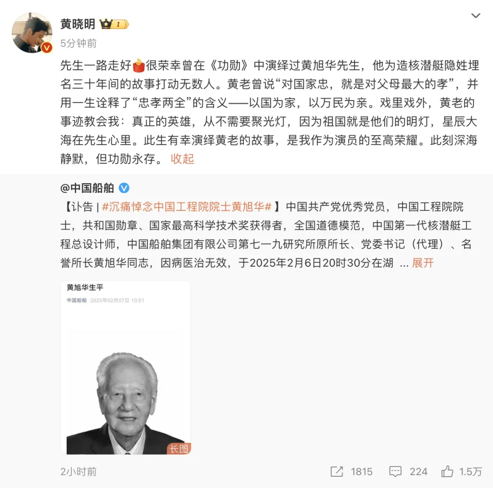 2月7日,黄旭华同道治丧工作委员会发布讣告:中国共产党优秀党员,中国工程院院士,共和国勋章、国家最高科学技能奖得到者,天下道德模范,中国第一代核潜艇工程总筹划师,中国船舶集团有限公司第七一九研究所原所长、党委书记(署理)、名誉所长黄旭华同道,因病医治无效,于2025年2月6日20时30分在湖北武汉逝世,享年99岁。 黄晓明发文哀悼:老师一起走好,很荣幸曾在《功勋》中演绎过黄旭华老师,他为造核潜艇隐姓埋名三十年间的故事感动无数人。黄老曾说“对国家忠,就是对父母最大的孝”,并用一生解释了“忠孝两全”的含义——以国为家,以万民为亲。戏里戏外,黄老的古迹教会我:真正的好汉,从不需要聚光灯,由于故国就是他们的明灯,星辰大海在老师心田。今生有幸演绎黄老的故事,是我作为演员的至高光彩。现在深海静默,但功勋永存。 潇湘晨报综合 报料、维权通道:应用市场下载“晨视频”客户端,搜索“报料”一键直达;或微信添加报料客服:xxcbcsp;或拨打热线0731-85571188。如需内容互助,请拨打政企服务专席19176699651。 |