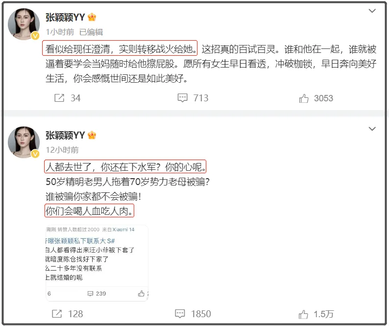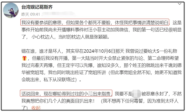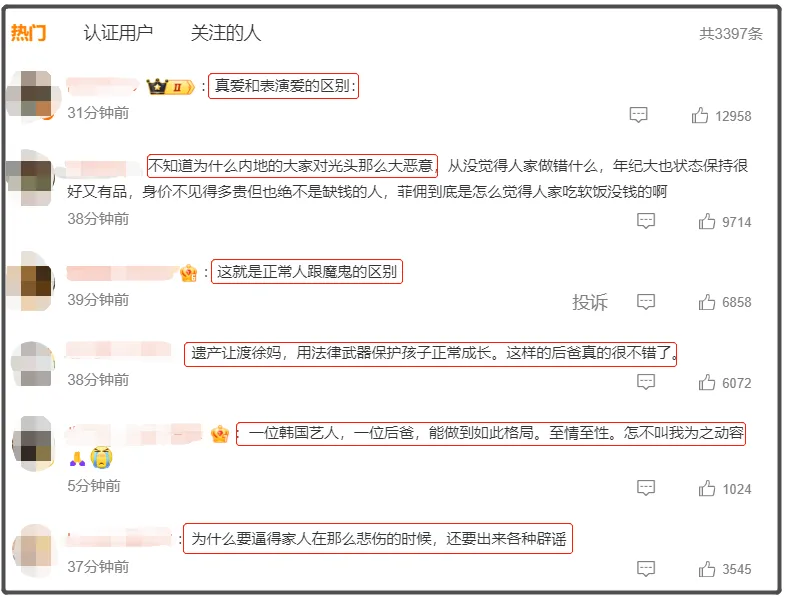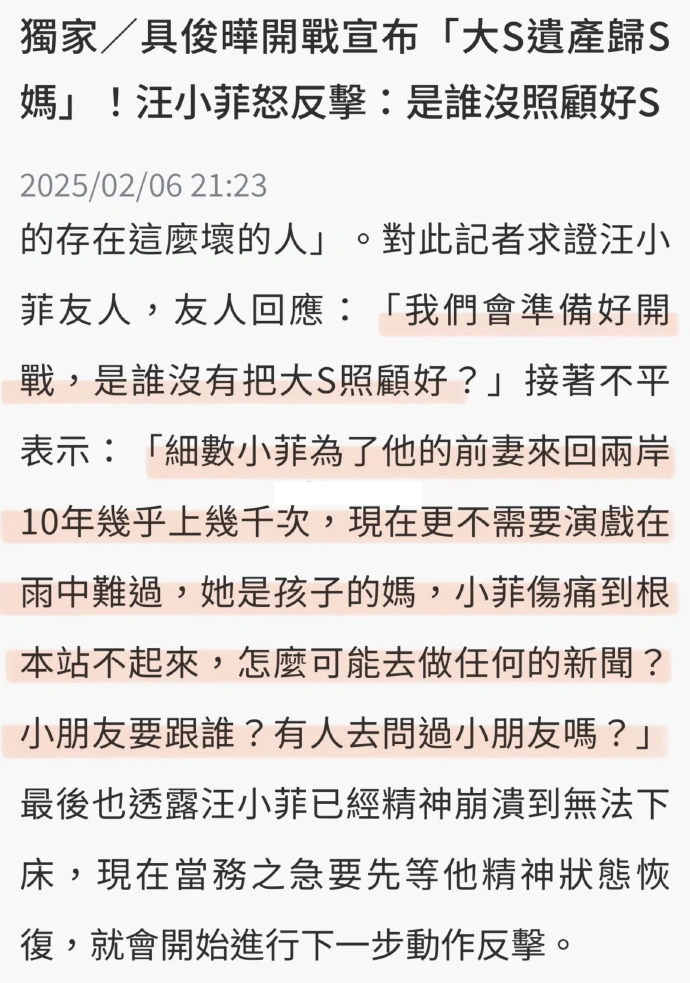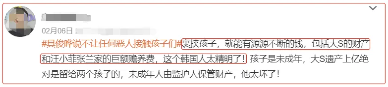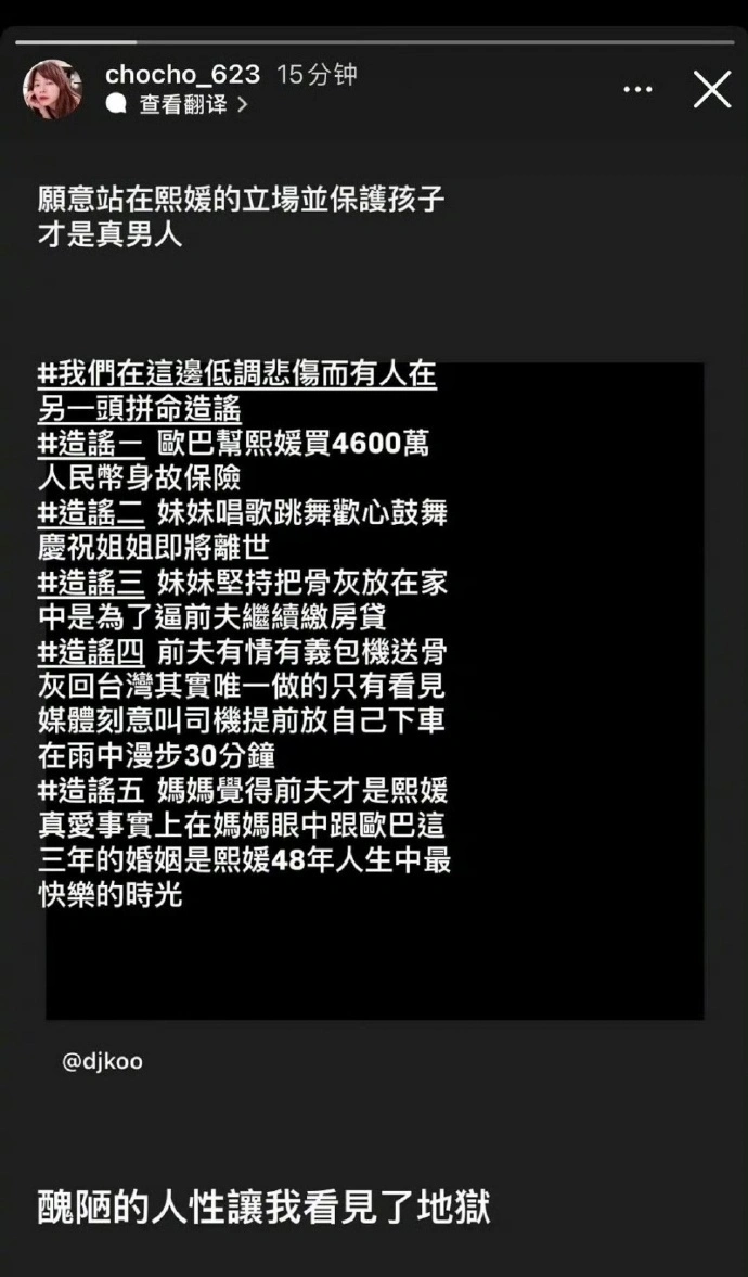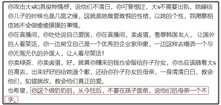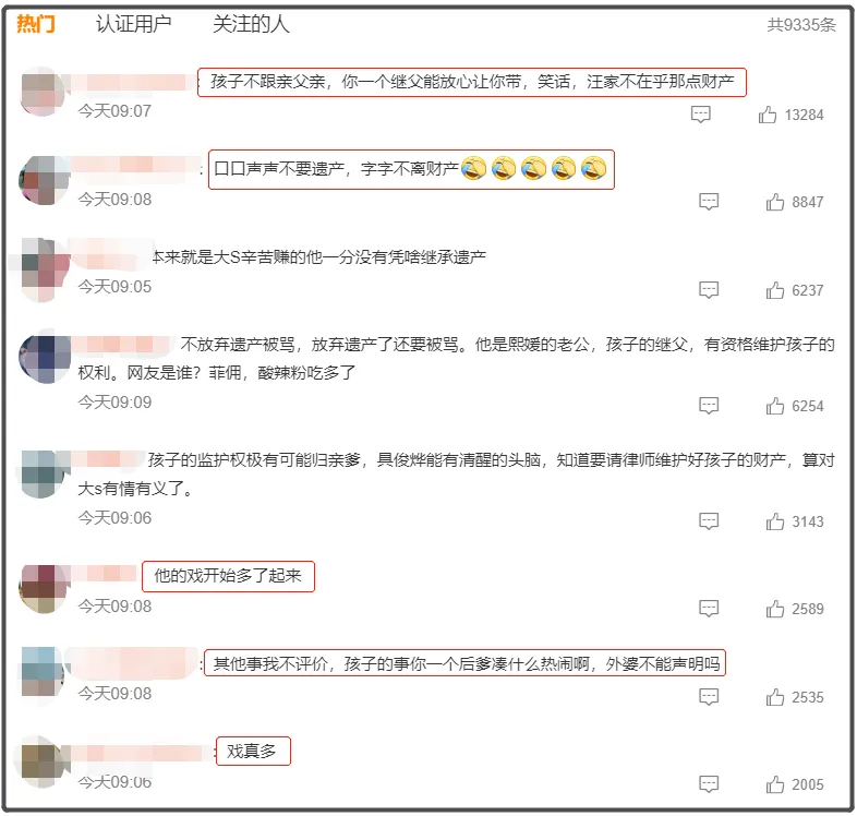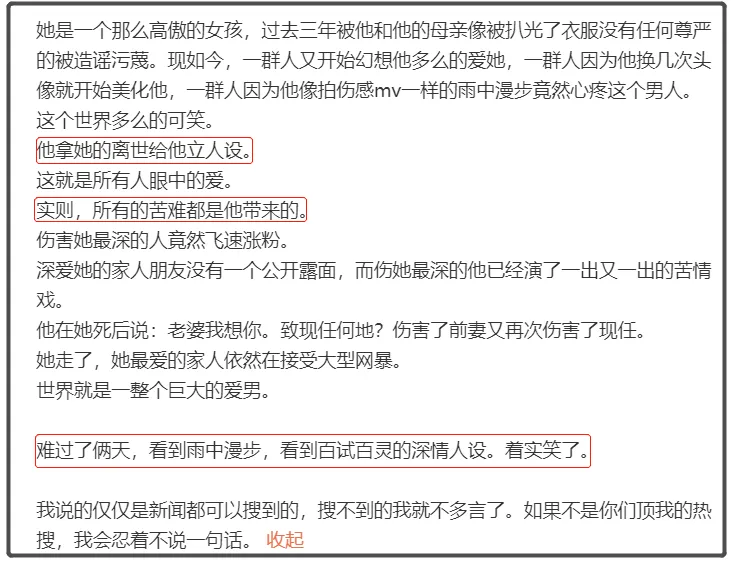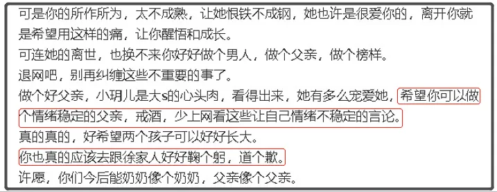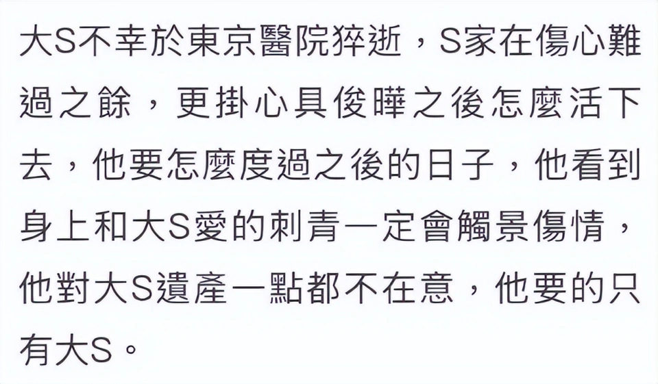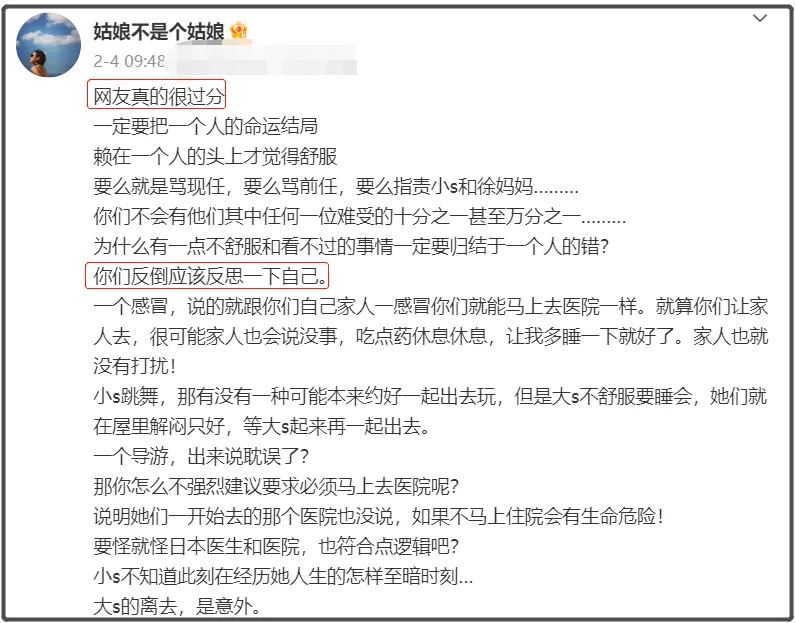 文 | 烤娱 大S因流感并发肺炎不测离世,这一消息不光让整个娱乐圈哗然,也让粉丝们扼腕叹息,生命偶然间就是这般脆弱! 从发病、去世,到火化、包机回家,统统流程快得让人来不及反应和作别。S家人给她选了粉红色的骨灰盒,终极骨灰永世放在家中。 更让人遗憾的是,大S离世后风波不停,死因被传来传去,家人们纷纷被质疑,包机回国又闹了乌龙,前夫和老公轮替登热搜,可谓一波未平一波又起。 生前大张旗鼓,死后还要以更抓马的方式震撼娱乐圈,大S的人生充足“魔幻”。 而从大S离世这件事,更能折射出真实的人性——有人急着蹭流量,有人忙着去站队,有人乘隙争权益,有人冷静表达爱。 小S安排了这一次去日本嬉戏的行程,姐姐失事她肯定自责。从媒体报道来看,小S在日本的时间每天以泪洗面,感情已经彻底失控,几乎完全没有办法做任何决定。 小S把骨灰放在家中,也是想和姐姐多语言,不过这种做法是否妥当,只能仁者见仁智者见智了。 作为熟悉了多年的老朋友,蔡康永早早发文悼念大S,字里行间满是不舍与爱。在出席书展运动时,他更是啜泣哽咽,哭到鼻头发红,他说“疯狂惦记一个人不是丢脸的事变”。 恩师王伟忠帮忙大S一家人处置处罚后事,还不停替S妈发声。娱乐圈这个大染缸里,还是有那么一抹温情色彩的。 在这些天充满戾气的互联网,总算是看到了暖和、面子、戳心的内容,这才是思念一个人精确的打开方式。 固然,互联网也让我们看到了人性凉薄、貌寝的一面。 在大S离世期间,张颖颖跳了出来,她先是在粉丝群预言汪小菲肯定会翻车,接下来在交际媒体发表长篇大论来谴责汪小菲,直言他立蜜意人设,大S的全部痛楚都是汪小菲带来的。 张颖颖打着为大S鸣不平的旌旗,细数了大S为汪小菲所做的事变,言辞剧烈,慷慨鼓动,但网友们压根不买账,葛斯齐都看不下去了,直言如今轮不到张颖颖来责备谴责。 葛斯齐在直播间表示,在大S和汪小菲签订仳离协议的过程中,状师手中把握的一些资料是由张颖颖提供的,此中就包罗汪小菲和其他女性的密切照片。 本想通过发声获取存在感,张颖颖打错了算盘反挨骂。曾经到场别人的婚姻,在大S忽然离世时,她最没有资格跳出来当“意见首脑”,她应该做的就是保持安静和隐身,上蹿下跳的结果就是被葛斯齐锤了。 同样出来蹦跶的,尚有曾到场过综艺《再见爱人》的嘉宾张婉婷。她先是把矛头对准了广大网友,以为网友真的很过分,不应该去责备谴责大S的家人,应该反思一下自己。 接下来,她又开始给张兰、汪小菲母子俩上课了,一篇洋洋洒洒的小作文,核心头脑就是提示张兰做好好奶奶,不要在孩子面条件起大S一个不字,提示汪小菲也要做个感情稳固的父亲,去徐家好好鞠躬道个歉。 作为一个局外人,张婉婷的发言自己就有主观色彩,这一做法也引发网友的不满。有网友指出,张婉婷不停以来都喜欢蹭热度,热衷于教别人服务。《再见爱人》帮麦琳语言,《一起繁花》又替李小冉开脱,同心用心想要当网红却没有那么多的流量。 张婉婷挨骂一点也不冤,她在《再见爱人》里劝退了无数观众,自己家里那点事变都没搞明确,反过来替别人费心。当年上节目挺招骂,如今依旧爱招骂。 一个张颖颖,一个张婉婷,让我不禁想起影戏《夏洛特烦恼》里的一句经典台词——人家秋雅完婚,你搁这又唱又跳!这种发急站队博取关注的,又何尝不是吃人血馒头呢? 没嫁人前风光无穷,嫁人之后满城风雨,大S的两段婚姻充满了戏剧性。在她离世后,丈夫具俊晔和前任汪小菲天然成了舆论的核心。 先来看一下汪小菲,得知大S去世后,换头像、飞台北哭肿双眼、给媒体鞠躬、陌头淋雨、躁郁症严重复发……不停上热搜,一个蜜意的男子形象深入人心。 惋惜的是,汪小菲身边的队友拖后腿。短视频博主爆料汪小菲包机接大S回家,张兰授权的直播号举行了保举,让很多网友信以为真。 但很快就被打脸了,小S发文称包机全部的安排都是徐家人负责的,还生气表示人在做天在看。随后,巨细S包机公司也发声明,夸大费用均由徐熙娣全额付出。 原形明白了,此前爆料的博主删除了视频,但账号被限定关注了,台媒很快扒出博主是张兰干儿子的身份,张兰的直播更是被网友举报下播,汪小菲的口碑也大反转。 大S离世后,丈夫具俊晔在网上的风评并不好,很多人都吐槽他是个没继承的人,只会说一些虚头巴脑的话,没有照顾好大S,大S的死他要负重要的责任。 不过S家人不停在积极维护他,小S在对媒体采访中就特殊夸大具俊晔全程陪伴大S,包罗生病照料、临终吻别、骨灰运送等,这也让S家人很欣慰。媒体报道也夸大,S家人更关心具俊晔未来的生存,具俊晔对大S遗产一点都不在意,他要的只有大S。 在大S去世不到一周,不停保持缄默沉静的具俊晔,终于对外发声了! 具俊晔在声明中指出,自己这些天履历痛楚无法用言语来形容,原来不想说什么,但有些人像恶魔一样平常品评我们一家人。 接下来他话锋一转,他把矛头对准了汪小菲:有位装很悲惨的淋雨乱跑,有些人故意侵害我们家族的形象,乱发关于保险和款子的假消息,这天下上真的有这么坏的人。 具俊晔表示产业都是大S用心血换来的,会把自己全部的权利都让给大S的妈妈。 至于孩子们的抚养权题目,具俊晔夸大不让任何恶人接触孩子们,会通过状师用法律步伐让他们安全长大。 但具俊晔随后再发表增补声明,称之前中