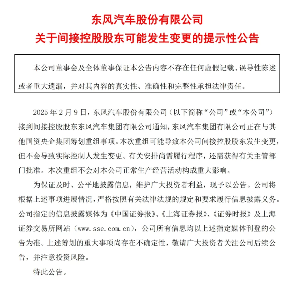 每经记者:孙桐桐每经编辑:董天意 2月9日,东风汽车股份有限公司(以下简称“东风股份”)和东风电子科技股份有限公司(以下简称“东风科技”)均发布了关于间接控股股东大概发生变动的公告。同日,长安汽车也发布了雷同公告,称其间接控股股东兵器装备团体正在与其他国资央企团体操持重组事项。 图片泉源:东风股份公告截图 对此,有观点以为,东风团体和长安汽车或将团结重组。《逐日经济新闻》记者向东风团体干系负责人扣问,对方回应称:“以现在公告内容为准,现在尚处于操持阶段。” 具体来看,东风股份在公告中称,东风股份于2月9日接到间接控股股东东风汽车团体有限公司(以下简称“东风团体”)关照,东风团体正在与其他国资央企团体操持重组事项。本次重组大概导致东风股份的间接控股股东发生变动,但不会导致现实控制人发生变动。干系安排尚需推行步伐,并需得到有关主管部门答应。本次重组不会对公司的正常生产谋划活动构成庞大影响。 东风科技公告称,东风科技于2月9日接到间接控股股东东风团体关照,东风团体正在与其他国资央企团体操持重组事项。本次重组大概导致东风科技的间接控股股东发生变动,但不会导致现实控制人发生变动。有关安排尚需推行步伐,并需得到有关主管部门答应。本次重组不会对公司的正常生产谋划活动构成庞大影响。 同日,长安汽车也发布雷同公告称,2月9日,重庆长安汽车股份有限公司(以下简称“长安汽车”)接到间接控股股东中国兵器装备团体有限公司(以下简称“兵器装备团体”)关照,兵器装备团体正在与其他国资央企团体操持重组事项。本次重组或将导致长安汽车控股股东发生变动,但不会导致现实控制人发生变动。有关安排尚需推行步伐,还需得到有关主管部门答应。本次重组不会对长安汽车正常生产谋划活动构成庞大影响。 逐日经济新闻 |