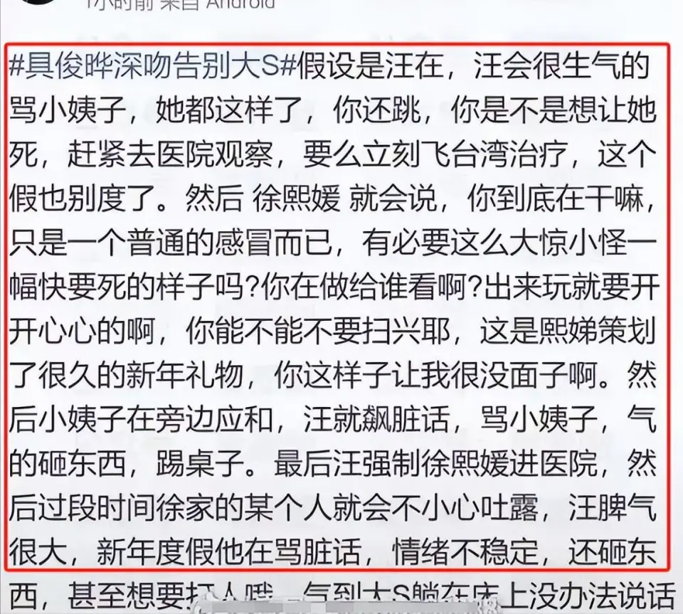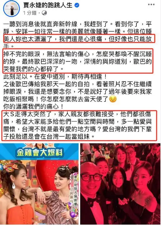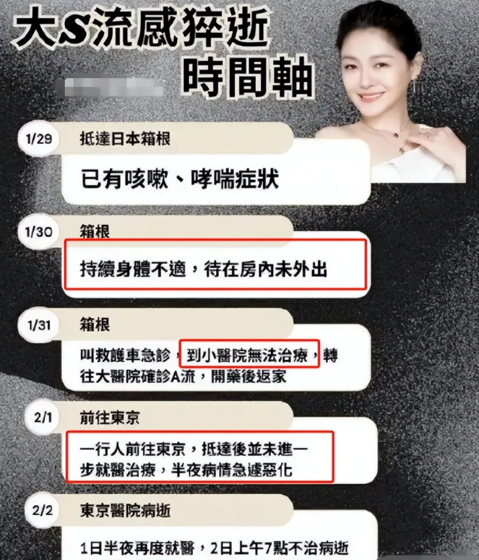 大S的猝然离世,让这个春节有了一丝酷寒的刺痛。 谁都没想到,她居然就这么突然地离开,仅是因为在日本旅游期间因流感而离世。 着实,大S的身材状态不好,大众早有耳闻。 起首,大S的身材曾因生产而非常衰弱,特别是在她备孕期间,还打了催卵针,再加上履历两度流产。 尤其是在生第二个孩子时,她还突发癫痫缺氧昏倒,心跳、呼吸都一度停止过。 再者就是不科学的减肥与美白方法。 终极,她是变美了,但也“毁掉”本身的身材,如许的身面子对病魔,是没有铠甲掩护的。 别的,她此前就多次因为癫痫复发告急送医,不光云云,大S妈妈还曾在媒体前透露,大S还患故意脏二尖瓣脱垂。 在小S的一个采访中,她曾吐槽过汪小菲“大惊小怪,动不动就叫120”,即便是完婚十年,大S一旦身材不好,汪小菲都会打120。 大S癫痫发作时,也是汪小菲找最好的大夫给救治的。 就像下面这位网友说的,假设这一次汪小菲也同去日本,看到大S的状态,肯定是发性情让大S立即去医院观察,或者是立即回台湾治疗。 可如许的身材状态,无论是大S本人还是其家人,都应该格外注意。痛惜的是,她们好像没故意识到严重性。 之前,就有人曝光了一张大S抵达日本的照片,画面疑似是导游司机的视角。 照片中可以看出,其时大S的状态就已经非常不好了,她依靠在具俊晔的身上,心情痛楚,表情煞白且有浮肿,随后被送往医院。 对其家人来说,以为这只是一次“重感冒”,好像并没有什么大标题。然而,大S没有等来病情好转,反而急剧恶化,在2月2日便因救治无效离世。 而随着大S离世的消息,让各人痛心的同时,也给我们留下了两个谜团。谜团一,为何医疗体系比较发达的日本,一位着名艺人在抱病后却未得到有用救治呢? 那是因为,日本是实验分级转诊制度。 先是由基层机构诊断,“转诊”的流程非常严格,并不是任意能举行的。而基层医疗机构大多数是以门诊为主,给予流感患者的治疗方式根本上也都按感冒处置惩罚。 即便是病人被救护车接走,也不意味着他就肯定会得到住院治疗,在当下的日本,即便流感肆虐,但这种病仍被视为“可自行规复”的疾病。 这也是大S在日本没有不停住院,而是不停被送进医院的原因,也大概因此延长了最佳救治时间。 现在,大S的遗体已于2月3日在日本火化,而据媒体消息,其家人也将从日本返回。 那么另一个谜团也来了,为何大S的遗了解在日本火化? 对于大S的粉丝来说,遗体要是能运返来,也可以或许让喜欢大S的粉丝们前往送其末了一程。但其家人做出的决定,让很粉丝在遗憾的同时,也有所不解。 要知道,当年黄家驹在日本录制节目的时间,从舞台上摔了下来,只管履历了几天救济,也终究是不幸离世了。 之后,他的遗体是被运送回香港,高出30万粉丝自觉为其送上末了的告别。 同样,在外国不幸离世的另有邓丽君。 1995年,她在泰国清迈的一家医院因为哮喘救治无效而去世,随后她的遗体被运回台湾。 而大S的死后事为何非得在日本呢? 起首,在外国不幸离世、遗体要运回去是可以的,但要满足很多条件。 好比,要按照本地的相干法规和步伐,提供相应的证明质料,且有些文件还要公证,所泯灭的时间比较多。 其次,运输也要根据遗体的状态,还要接洽专业的运输机构。总之,整个流程与时间,都是比较冗长的。 而即便是在日本火化,大S妈妈也沉痛表现,要带大S回家,但所要办理的手续也比较多。 当然,另有一种大概是大S一家人都在日本,告急的家人都在身边,这与回去后火化区别不是很大。 之前,就有记者在台湾机场拍到了汪小菲,画面中他双眼红肿,对着镜头深深鞠躬,而且恳求记者:“求各人多说她的好话”。 而当被问及会不会帮助时,汪小菲摇摇头没有回应,只是说了一句:“熙媛是我的家人。” 之后,他更是跪在雨中痛哭,对着大S家的方向跪拜,感动了无数网友。 2月5日,大S的骨灰已包机回台北,并由家人护送回家。 2月8日,是大S头七以及和具俊晔完婚三周年的日子,徐家人以完婚三周年的名义,约请好友聚在一起哀悼大S。 本来这些事都能在肃穆的氛围中有序举行,却不想随着大S的离世,一场“闹剧”也在寂静上演。不外,在这场“闹剧”中,开始被责怪的不是决定要去日本旅游的小S,而是第一时间赶往台湾的汪小菲。 就在2月4日,汪小菲的前任张颖颖。 她责怪汪小菲给了大S太多的伤害,却在对方离世后,居然在凹蜜意人设,让她感到可悲又可愤。 有网友认同张颖颖的观点,以为她是熙媛留下的解密解语花。 不外,也正是因为张颖颖的这番话,也掀起了一场骂战。 而张颖颖则直接硬刚:“谁有我知道的多呢,我的嘴巴很严了哦!” 而另一边,大S妈妈则删除了与具俊晔比心的照片。 小S则通过经纪人发声,这次大S骨灰的包机费用都是由徐家和她老公负责处置惩罚的。 2月8日,与汪小菲和张兰相干的抖音账号被无穷期封禁,来由是恶意造谣,不尊重逝者和家属,违反公序良俗和道德底线;之后张兰的微博账号也被处置惩罚。 显然,大S离世后的一些变故还在上演。 不外,从大S好友贾永婕发出的文章可以看出,大S走得算是清静、安详、洒脱的,她是为数不多赶去日本送大S末了一程的人。 没错,大S的这一生应该是洒脱不羁,她不缺大胆,也很自信。她在能爱时闪婚,又在不爱时闪离;在调解好本身,又能敏捷再婚,喜欢就去爱。 就像她说的,“我必须找回我本身,你们也是。” 希望,在另一个天下,她还能
