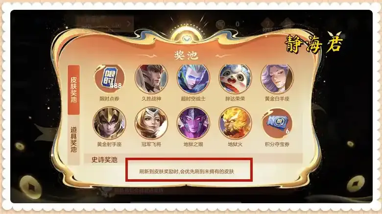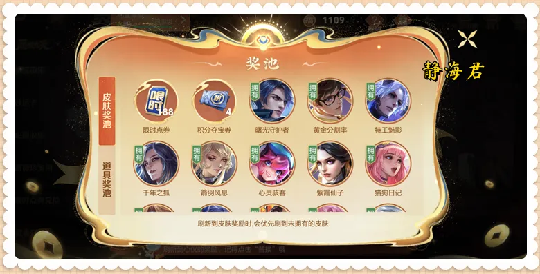 因为史诗皮肤已经全部有了,我在现实革新的过程中,只会刷出五种结果:限时点券×188、积分夺宝券×4、限时点券×488、积分夺宝券×6以及传说皮肤。 我在一连刷出限时点券×188、积分夺宝券×4等夸奖后,运气相对较好的刷出了花木兰的传说皮肤。 回到标题,为什么110次能刷出传说呢?单纯从概率的角度来看: