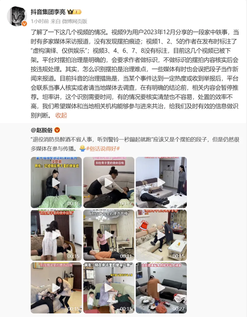 2月12日,针对网友提出的“退役消防员醉酒不省人事,听到警铃一秒蹦起就跑”等摆拍视频质疑,抖音团体副总裁李亮在微博发文回应。 李亮体现,相识了网友所质疑的几个视频情况。此中部分没有发现摆拍陈迹,部分视频的作者在发布时标注了“假造演绎、仅供娱乐”,因此没有题目。而还有几个没有举行标注的视频,抖音已经举行了下架处置处罚。 李亮进一步提到,究竟上,平台对摆拍管理是明确的,会要求作者做标识,不做标识的摆拍内容核实后会按违规处置处罚。但怎么辨认摆拍是管理难点,一些媒体偶然也会误把段子当作新闻来报道。 针对干系题目,现在抖音的管理措施是,当某个变乱达到肯定热度或受到举报后,平台会接洽当事人核实大概请当地媒体去调查,在有明确的结论前,干系内容会停息推荐。 “坦率讲,这个辨认需要时间,有的情况要核实清楚也不容易,处置的效率不高,我们希望媒体和当地干系机构能够到场进来共治,给我们及时有效的信息做辨认判断。”李亮说道。