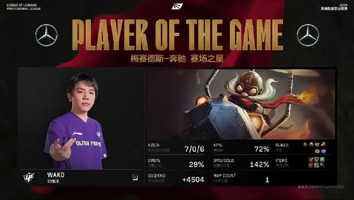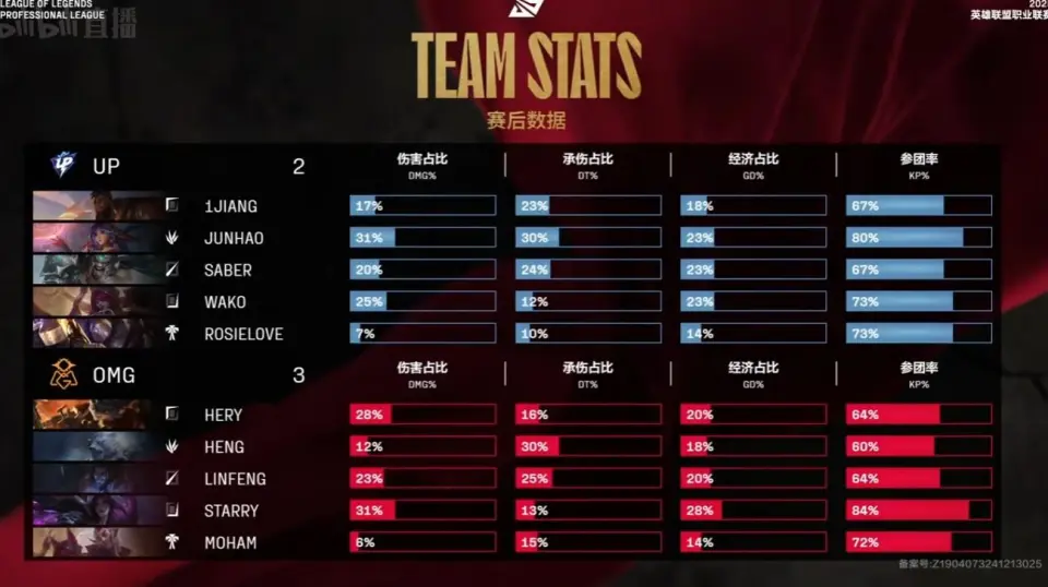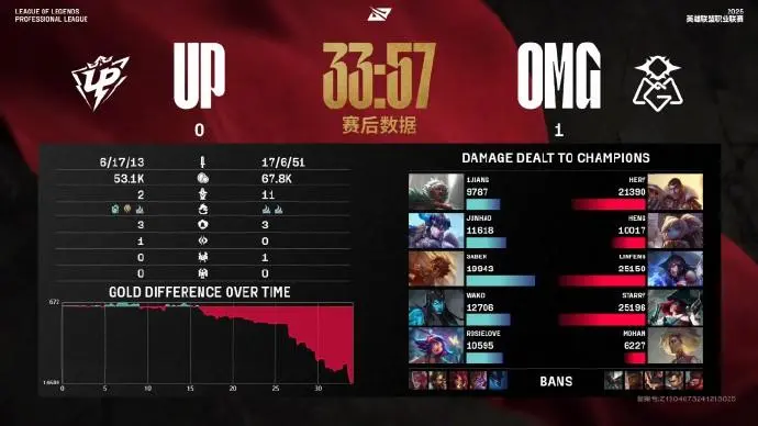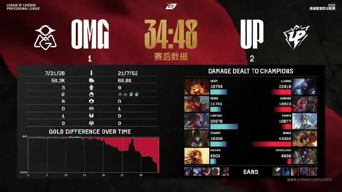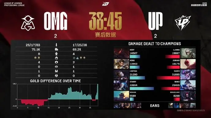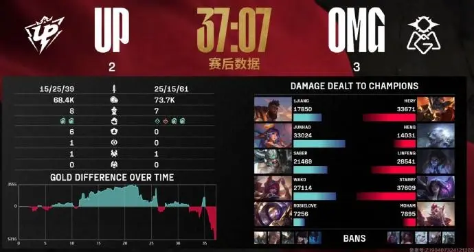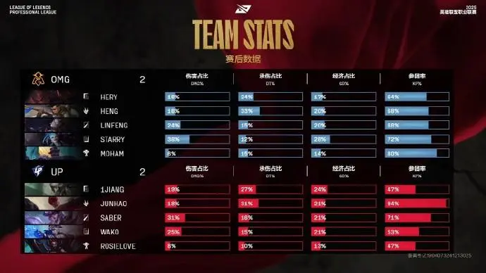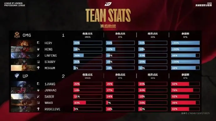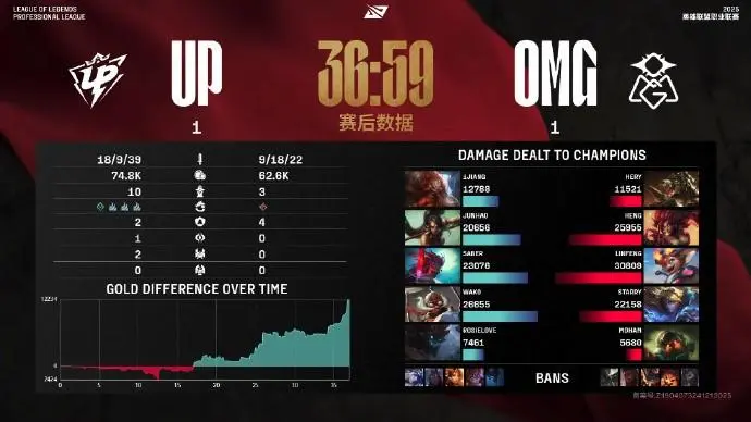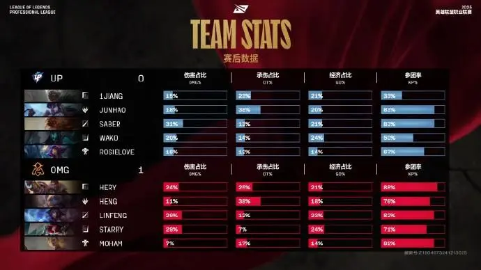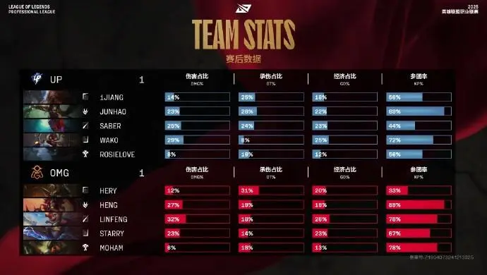北京时间2月12日17时,2025LPL第一赛段通例赛小组赛继承举行,今日角逐由UP vs OMG。 首发名单: UP:1Jiang、Junhao、Saber、Wako、Rosielove OMG:Hery、Heng、Linfeng、Starry、Moham SOLO赛:1Jiang锐雯直接推掉Hery韦鲁斯一塔拿下胜利,UP获得本场BO5首场选边权,UP选择蓝色方。 第一局BP 赛况 第6分钟,巢虫团,Wako击杀Moham拿下一血,OMG抢下一只巢虫,1-0(UP在前)。 第11分钟,巢虫处拉扯,OMG上野抓到1jiang,随后OMG追击反被击杀上野,3-2。 第16分钟,先锋团,1Jiang闪现大又空了,双方中辅交换后OMG追击收掉Wako,UP拿到先锋,5-5。 第26分钟,OMG中路集火击杀1Jiang,随后逐个击破打出0换4拿下大龙加小龙,6-9。 第33分钟,OMG中路推进,Junhao被锤走,OMG打出0换5拆掉UP基地拿下首局,6-17。 赛后数据 第二局BP 赛况 第10分钟,巢虫团,UP先行开团,Linfeng击杀Rosielove拿下一血,0-1(UP在前)。 第12分钟,OMG四人上路硬越塔击杀Saber,随后UP支援赶到收掉OMG三人,3-2。 第17分钟,UP中路放先锋打出0换2,6-3。 第24分钟,双方围绕厄塔汗拉扯,最终UP拿下厄塔汗,Linfeng努力换掉UP四个复活甲,但OMG四人阵亡,UP拿下大龙,13-6。 第31分钟,OMG上路找到时机乐成击杀1Jiang后,双方在野区相遇打出1换1后拉开,后续UP拿下龙魂和第二条大龙,14-9。 第36分钟,高地征战,Saber单切Linfeng,UP打出0换4推平水晶扳回一城,18-9。 赛后数据 第三局BP 赛况 第3分钟,UP上野共同击杀Hery,Junhao拿下一血,0-1(UP在前)。 第16分钟,OMG三人上路想越1Jiang,UP队友及时支援打出 1换2,3-1。 第24分钟,中路团战,UP再打出1换2,1Jiang收下双杀,7-2。 第26分钟,OMG野区开团,Saber被秒,OMG打出1换4后拿下大龙,8-6。 第28分钟,UP拿下水龙魂后追击打出1换3,11-7。 第33分钟,中路征战,Junhao进场开Starry,UP击杀OMG三人推上高地,16-7。 第34分钟,OMG连续复活后想留人反被UP团灭,UP率先拿下赛点,21-7。 赛后数据 第四局BP 赛况 第2分钟,一级团,Junhao进场开到多人,UP乐成击杀OMG三人,Junhao拿下一血,3-0(UP在前)。 第12分钟,UP三人蹲伏,OMG打出2换4,8-6。 第14分钟,OMG拿下巢虫打出1换2,9-8。 第21分钟,厄塔汗处拉扯,Moham先行阵亡,OMG抢下厄塔汗,随后OMG复活结果全被打掉,双方2换2,11-11。 第24分钟,小龙团,Wako直接被秒,OMG拿下小龙打出0换4,11-15。 第31分钟,Saber被击杀,OMG开动大龙被Junhao抢到,12-17。 第35分钟,小龙团,Heng走位失误先行被击杀,OMG秒掉Rosielove,后续3v3,UP上野收割残局打出3换5拿下土龙魂,17-20。 第38分钟,OMG拿下大龙击杀Starry,后续OMG推上高地团灭UP扳平比分,双方来到决胜局,17-25。 赛后数据 第五局BP 赛况 第2分钟,OMG四人越塔击杀1Jiang,Starry拿下一血,0-1(UP在前)。 第6分钟,巢虫团,Rosielove勾到Linfeng并将其击杀,UP拿下巢虫,2-1。 第11分钟,UP在上路4包2乐成击杀OMG上辅两人拆掉上一塔,4-2。 第22分钟,UP拿下小龙,Hery大招进场共同Moham,OMG乐成打出1换3,6-7。 第25分钟,中路团战Moham阵亡,UP拿下大龙,团战OMG打出0换5,7-11。 第32分钟,双方中路爆发团战,Starry飞进人群三杀,OMG打出2换4,9-15。 第34分钟,大龙团战,Moham进场开到两人,OMG拿下大龙,UP打出1换5后中路推进,OMG众人复活在高地击杀UP四人乐成守家,14-20。 第36分钟,OMG带着兵线反推UP高地团灭UP拆掉基地拿下胜利,15-25。 赛后数据 |