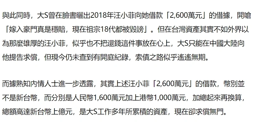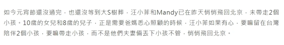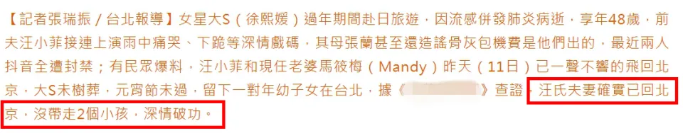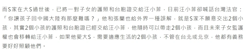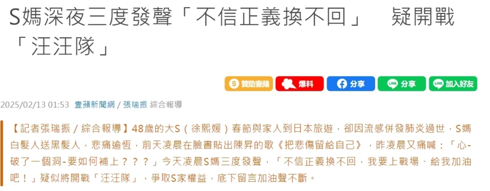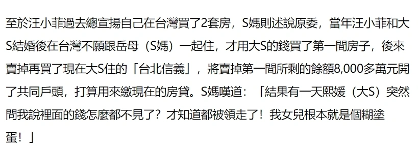 大S(徐熙媛)随家人到日本旅游,在2月2日于本地猝逝。 得知消息的汪小菲立刻从泰国飞奔到中国台湾。 徐家包机返台,将大S的骨灰送回家之后,汪小菲立刻将两个孩子接走,亲身照顾。 2月12日,台媒消息,汪小菲还没有比及大S树葬,就跟妻子马筱梅(Mandy)在2月11日静静飞回北京。 据相识,汪小菲并没有将一对子女带归去。 徐家亲朋透露,汪希玥跟汪希箖的台胞证以及护照,都已经交给了汪小菲。 以是,汪小菲是可以自由带孩子到任何地方的。 对于汪小菲将子女单独留在台湾,徐家体现了不满,“如果他故意的话,就应该好好照顾两个孩子”。 2月13日破晓,徐妈妈(黄春梅)疑似向汪小菲开战。 她在交际网发文,“不信公理换不回,我要上战场,给我加油吧!” 这不是徐妈妈痛失女儿后初次发文。 她分别在2月11日跟12日都发过文。 11日,她上载歌曲《把伤心留给自己》诉心声,翌日,她再度对外发声,“心破了一个洞要怎样补上?” 网友隔着屏幕都可以大概感受她的非常伤心。 大S猝逝,孩子的抚养权以及遗产安排,是外界关注的两大焦点。 大S生前与汪小菲有官司没有完结,汪小菲欠了前妻一大笔债务。 大S生前居住的豪宅“台北信义”,业权到底属于谁,是大S出钱购买,还是汪小菲出资? 这些都必要理清。 至于两个孩子的抚养权,根本没有争议,台湾多名状师体现,大S离世,抚养权会主动交给汪小菲。 以是,徐家并没有在抚养权上纠结,直接将孩子的护照、台胞证交给汪小菲。 在这个大条件下,徐妈妈可以大概做什么呢? 有状师体现,徐妈妈可以调和汪小菲,让孩子们继承留在台湾读书发展,也有权声请制止汪小菲的亲权直到孩子成年。 总而言之,只要徐妈妈提出“让孩子留在台湾上学对发展最有利”“汪小菲感情不稳无法照顾小孩”等等,她就有大概让汪小菲被制止亲权。 不外,这是一场恶战,汪小菲有权利向法院声请规复亲权,而且胜算很大。 这就是为什么,汪小菲被封号之后随处骂人,会被状师劝阻,由于全部的报道,都可以大概影响讯断。 状师盼望万无一失。 究竟上,孩子的抚养权不是徐家最关心的,大S的遗产以及她生前与汪小菲的官司才是重点。 大S和具俊晔并未签婚前协议书,具俊晔声称要将自己的遗产份额转给徐妈妈。 实行之后,大S的遗产还是分成三份,两份由子女继承,一份交给徐妈妈。 前面提到过,大S的遗产有多少钱,借出去的钱能不能要返来,房子属于谁,都是徐妈妈要在“战场上”办理的题目。 大S与汪小菲的官司,则由继承人承受诉讼,现在看来,那就是徐妈妈了。 大S生前拥有“台北信义”以及“国家艺术馆”(徐妈妈居住)两套豪宅,代价高出6亿台币(约合1.3亿元人民币)。 其中,“台北信义”这套豪宅,争议最大。 2024年3月,徐妈妈继承媒体专访,其时她特意提及这套房子。 徐妈妈说,汪小菲对外总说自己在台湾买了两套房,但真相并非云云。 徐妈妈口中的真相是如许的: 当年汪小菲和大S完婚后,不肯意跟徐妈妈一起住,于是用大S的钱买了第一套房子“冠德远见”。 厥后,房子不够住,大S将第一套房卖掉,付出“台北信义”的首期款。 然后,大S将卖掉第一套房所剩的8000多万台币(约合1800万元人民币),与汪小菲开了共同户头,操持用来缴新居的房贷。 然而,大S某天发现,这笔巨款不翼而飞。 而张兰跟汪小菲口中的真相是如许的: 张兰出钱,让汪小菲在台湾购买了第一套婚房,写的是大S的名字。 购买第二套豪宅的首期款,同样由汪小菲付出,然后由他缴房贷。 至于卖掉第一套房剩下的余额,张兰说被徐妈妈偷走了。 双方各执一词,如果要打官司,鹿死谁手,尚未可知。 大S和具俊晔再婚后,汪小菲就再也不付出仳离协议上约定的房贷、子女抚养费、大S精力抚慰金等。 每个月约300万台币(约合66万元人民币)的费用,汪小菲恒久摆烂。 大S再婚三年,汪小菲一直没有付出的话,滚动到现在已经是2376万元人民币了。 大S还曾晒出借给汪小菲2600万元的欠据,现实金额是1600万元人民币和港币1000万元。 这些债务,总额是半亿人民币,大S生前一直在追讨,但至今没乐成。 徐妈妈说自己要上战场,不知道是否要为女儿讨回公道。 |