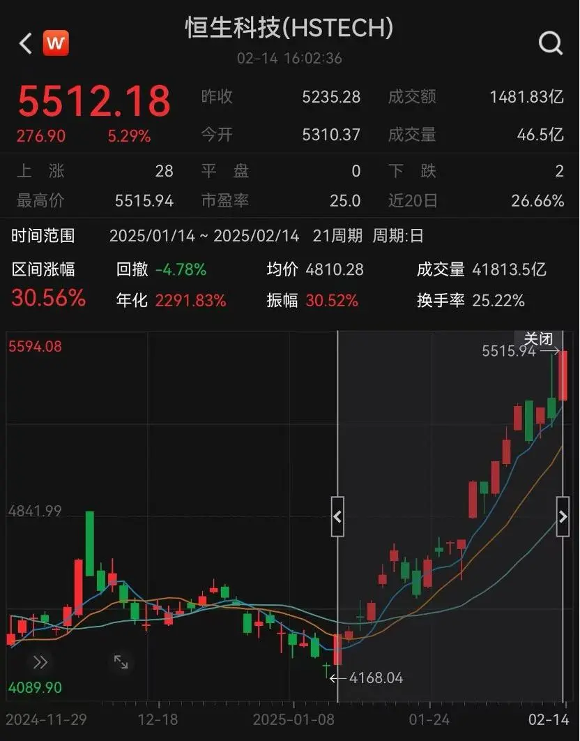 财联社2月14日讯(记者 闫军)从大跳水到大反攻,恒生科技两个生意业务日过山车行情演绎了“什么叫惊喜,什么叫刺激”。 2月14日,恒生科技指数,大涨5.29%,报收5526.22点,单周狂飙7%创下3年新高。自1月14日低点以来,短短一个月时间,恒生科技指数涨幅到达30.56%。 指数的上涨表现在ETF上相称直观,2月14日,24只港股ETF涨幅超过3%,5只涨幅超过4%。此中,上涨最高的是博时中证港股通互联网ETF,涨幅到达4.9%,这只产物场内规模仅1.67亿,但是成交额到达惊人的38.2亿元,换手率到达2140.14%。别的,涨幅超过4%的ETF另有华宝、富国和易方达旗下港股互联网ETF。 行情有多疯呢?中证港股通互联网指数席卷的30只成份股均涨逾2%,22股涨超5%,8股喜提两位数涨幅,团体涨幅中位数高达7.12%。 港股互联网ETF基金司理丰晨成指出,外洋投资者对中国科技股的态度出现反转,这从电商巨头巨头阿里巴巴近期的走势可见一斑。受到人工智能方面的突破,在外资投资者看来,Deepseek点燃了中国科技股复兴的希望。 多重利好推动港股走牛 AI高潮带动下,港股团体投资气氛高涨,业内机构多数以为,这可能意味着中国底层资产代价有望迎来重估,将来有望重新被赋予AI溢价。 随着一波大涨拉开序幕,不过,近两个生意业务日,在恒生科技指数来到高位后,先是跳水,随后开启强势大反弹。2月13日-14日,涨幅4.64%,回撤-3.7%,振幅到达6.15%,肯定程度上,表现了资金在高位上的审慎。 怎样对待这一轮的大涨,华夏基金等机构以为,春节后多重利好叠加推动了原来行情。 起首,AI圈黑马DeepSeek带动整个人工智能产业成为本年A股、港股的主线。DeepSeek依附低资源、高性能优势引发市场波动,或推动投资者重新评估中国科技企业在AI赛道的技能潜力,科技股或迎来价值重估行情。 其次,阿里与苹果互助利好消息催动。2月12日,据the information消息,苹果将与阿里巴巴互助为国内iPhone用户开发AI功能。越日,阿里巴巴连合首创人、董事局主席蔡崇信确认了阿里与苹果互助听说。在业内看来,干系消息意义大于详细效益,这说明中美两大巨企有时机携手在科技范畴上互助,对于A股、港股上市的科技股掀起了估值释放的正面结果。 在申万宏源看来,从字节/豆包开端验证国内AI需求/应用,到Deepseek叫醒推理放量需求,再到苹果与阿里互助,隐含的均是本土化、多元化的趋势以及云主线的回归。 第三,举世对冲资金在买入中国资产,港股是第一站。在德银、贝莱德、瑞银等外资机构纷纷喊话看多中国后,外资真金白银买入也进一步得到披露。 高盛在最新研报中表示,截至2月7日,高盛举世范围内的主经纪商(PB)业务中,中国在岸和离岸股票合计成为本年“名义净买入量最大的市场”。即在2月3日-7日当周,出现了对冲基金4个多月来购买中国资产的最强劲海潮。此前对冲基金大佬泰珀更是曾放言“买入统统中国资产”,其旗下Appaloosa LP的13F披露文件显示,这家对冲基金在第四序度全面增持了中概股和中国股票基金。 第四,南向资金的加持。2月14日,南向资金及时买入达87亿元。截至13日,南向资金成交总额到达1541.36亿。 在机构看来,南向资金及产业资源回购连续注入,提升了港股的韧性。2024年整年净买入额到达8078.69亿港元,较2023年增长2.5倍,创下最大年度净买入规模。2025年1月,南下资金月净流入额到达1256亿港元,为2021年2月以来单月最高,显示了当地投资者对港股市场的连续看好。 资金在科技股上做“减法” 不过,随着指数大涨,止盈资金在ETF上开始做减法。 截至2月13日,权益ETF(包罗QDII股票基金)年内资金净流出近240亿元,资金流出前五名中,涨幅较好华夏科创板ETF流出最多,达88亿元,嘉实科创板芯片ETF流出47亿元,另外三只均为QDII基金,华夏恒生互联网科技ETF、易方达中证外洋互联ETF以及华夏恒生ETF分别净流出55.5亿元、41.6亿元以及35.4亿元。合计20只股票ETF+QDII基金流出超10亿元。 从资金净流出比力大的QDII ETF来看,外洋互联网、恒生科技净流出居前。 在业内看来,资金在当前流出并不奇怪,一方面是止盈资金赢利离场;另一方面,以恒生科技指数为例,指数已经超已往年924行情的5649.27点的高位,按照惯例,资金在回本阶段亦有离场的现象。 牛市能不能继续?机构有了大分歧 对于恒生科技后续怎样走?机构观点分歧较大。 华夏基金指出,低估值还是港股市场的优势。港股市场感情徐徐回暖,恒生科技指数的估值处于汗青低位,市盈率(PE-TTM)仅为22.69倍,低于成立以来78.19%的时间。这使得港股市场具有较高的性价比,吸引了更多投资者的关注。 猜测后市,丰晨成以为,只管短期看来,投资者的生意业务核心仍然只是中国互联网板块;中期看,中国科技行业的连续增长势头以及政策支持地产行业的迹象,有望连续提振投资者对中国资产的感情。 不过,中金在港股再度大涨的几点思考中表示,在本轮港股大涨中,总体还是一个结构市,而且是更为极致的结构市,只有20%多的股票跑赢指数(924行情有超过60%的个股跑赢指数)。 但就能靠这些小范围个股推动团体指数上涨且跑赢A股,重要的缘故原由是:1)港股团体盘子小;2)港股的软件股和大厂更多,这个A股没有;3)指数构建上,恒生系列指数人为限定了个股权重上限是8%,以是会使得中小公司对指数的拉动结果上更大。 别的,中金还表示,本轮大涨中,长线外资没有到场,应该是被动资金,生意业务资金等短线外资到场。假如将来科技