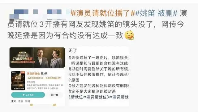 2月14日晚,由腾讯视频推出的演技竞技真人秀《演员请就位》第三季热度一起走高,不外,观众发现,这档节目于当天21:00方才上线,比原定播出的时间晚了整整3小时。 晚点的缘故起因,竟然是由于临时的“删除”。 极目消息记者梳理后发现,《演员请就位3》正式播出前就由于杨子模仿费翔在《封神1》中的表演片断已然出圈,“与黄圣依仳离”“重返演员赛道”“出演纣王被群嘲”的三个BUFF叠加在一起,让这档节目未播先红。 而在这个片断之外,章子怡、吴镇宇、惠英红继承导师的阵容,也让不少人等待节目会有怎样的“毒舌”点评。 不意,最火的却和节目本体无关。 2月11日,《演员请就位3》官宣高朋,姚笛、杨子、刘梓晨等加盟,引发大批讨论。 姚笛连续两天在个人外交账号发文为《演员请就位3》宣传,还放出本身演绎“破碎”感情的视频。 视频中,姚笛面临镜头,双眼含泪,心情痛楚挣扎。关于#姚笛 复出#的话题也登上热搜。 然而,当《演员请就位》第三季姗姗来迟之后,观众灵敏发现,“少人”了——2月14日上午10点还在微博官宣“今晚18:00,我们不见不散”的女演员姚笛,在节目中不见踪影。 网友给出的截图也表现,参加节目的所有演员名单中,也没有了姚笛的名字。 节目上线时间临时延后,姚笛的镜头又无影无踪,让“姚笛 被删”灵敏登上热搜榜第一,更引发“劣迹艺人”的推测,不外,也有不少人体现不解:娱乐圈有过“第三者”绯闻的艺人触目皆是,《演员请就位》第三季中另有此前被张天爱微博放出灌音控告“劈叉”的徐开骋,为何单单就姚笛被删除? 14日晚,极目消息记者相识到,姚笛临时被删除并非网友推测的缘故起因,而是“条约问题”。 而就在13日,姚笛还出席了《演员请就位》第三季的发布会,更被推选为本季节目“最值得等待的演员”之一,被等待来由是“好久不见,走过低谷,(她的)人生是否可以大概触底反弹”。 公开资料表现,姚笛,1982年3月17日出生,女演员、导演。 2007年,姚笛因到场“红楼梦中人”的选秀而进入演艺圈,并在李少红执导的《红楼梦》中出演王熙凤,之后又陆续塑造了《南京!南京!》小妹、《裸婚期间》童佳倩、《北京青年》唐娇等多个让人印象深刻的脚色。2024年1月23日,姚笛以导演身份参加新剧《姥姥的春天》开机仪式。 泉源:极目消息(记者:付瞰) |