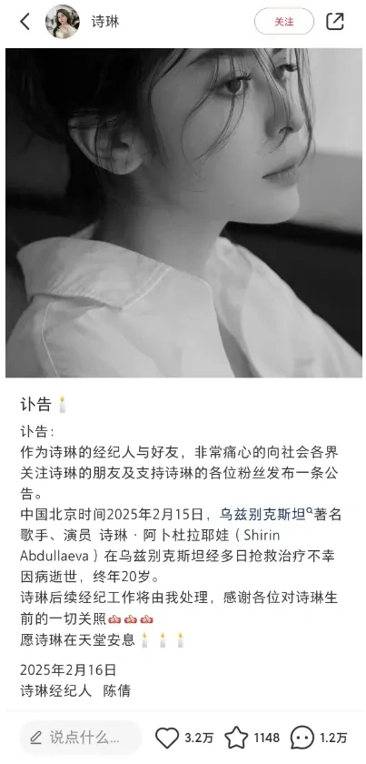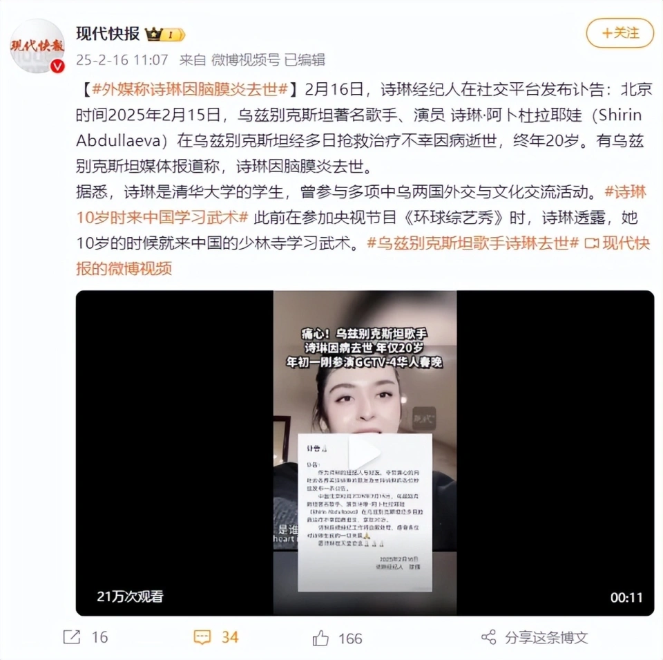 2月16日,乌兹别克斯坦歌手、演员诗琳·阿卜杜拉耶娃(Shirin Abdullaeva)去世的消息让不少中国网友痛惜。 据诗琳在中国的经纪人发文透露,诗琳突发疾病,在乌兹别克斯坦经多日接济治疗不幸于15日去世,年仅20岁。讣告中没有透露诗琳的死因,但看得出来诗琳病发得非常忽然。 另据现代快报报道,有乌兹别克斯坦媒体报道称,诗琳因脑膜炎去世。 就在1月尾,诗琳还到场了2025年全球华侨华人春晚,登上了央视舞台,当时,她与王凯、林晓峰等人一起演唱《中国年,天下年》。据悉,诗琳多才多艺,而且很早就自学中文,她现在就读于清华大学。作为歌手,她还多次到场中乌文化交换活动。 诗琳曾在个人账号中发布到场央视春晚并体验英歌舞的视频。视频中,诗琳多次表达对中国的喜欢,她说她们的春节是3月21日,但是她来看节目有些不一样,她非常喜欢中国的春节,因为非常热闹。 当时的采访中,诗琳的身段看上去并没有抱病的迹象。 别的,在之前的1月19日,她还曾和歌手王霏霏同台演唱歌曲《月牙湾》。 不少网友得知诗琳去世的消息后,纷纷留言表现哀悼。 来源:红星消息综合现代快报、都市快报 |