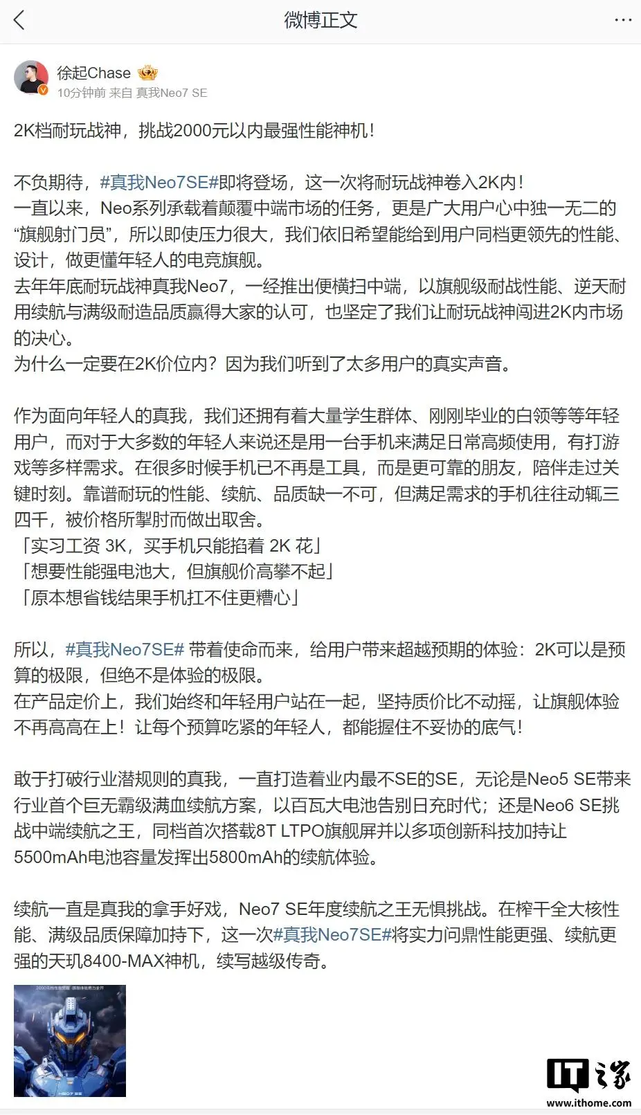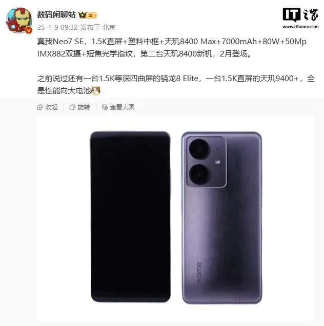 IT之家 2 月 17 日消息,realme 今日官宣将推出真我 Neo7 SE 手机,号称该机是“2K 档耐玩战神”。 真我 Neo7 SE 将搭载天玑 8400-MAX 处理器,号称“年度续航之王无惧挑战”,订价在 2000 元价位内。 据IT之家此前报道汇总,该机已三证齐全,型号为 RMX5080,支持 80W 快充。 联发科于 2024 年 12 月 23 日发布了天玑 8400 处理器,其首发Cortex-A725 全大核架构,该核心的单核性能提升 10%,功耗低沉 35%,搭载 8 个 A725 CPU 大核。 GPU 方面,天玑 8400 搭载ArmImmortalis G720 MC7 1.3GHz GPU,支持硬件光线追踪、40% 带宽优化等,GPU 峰值性能相较上一代芯片提升 24%,功耗低沉 42%。 博主@数码闲聊站 已曝光真我 Neo7SE 手机的重要参数: