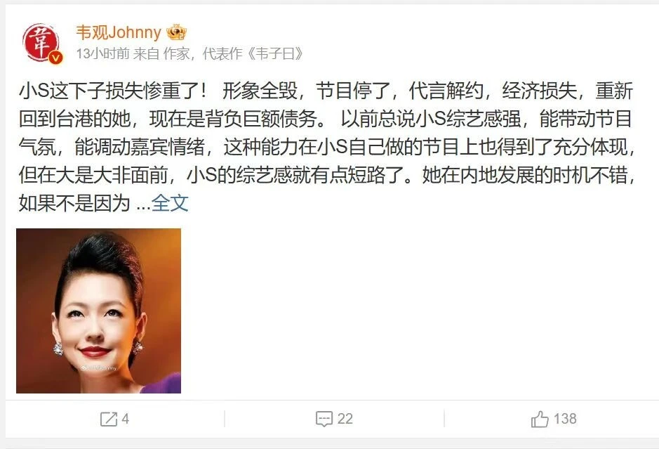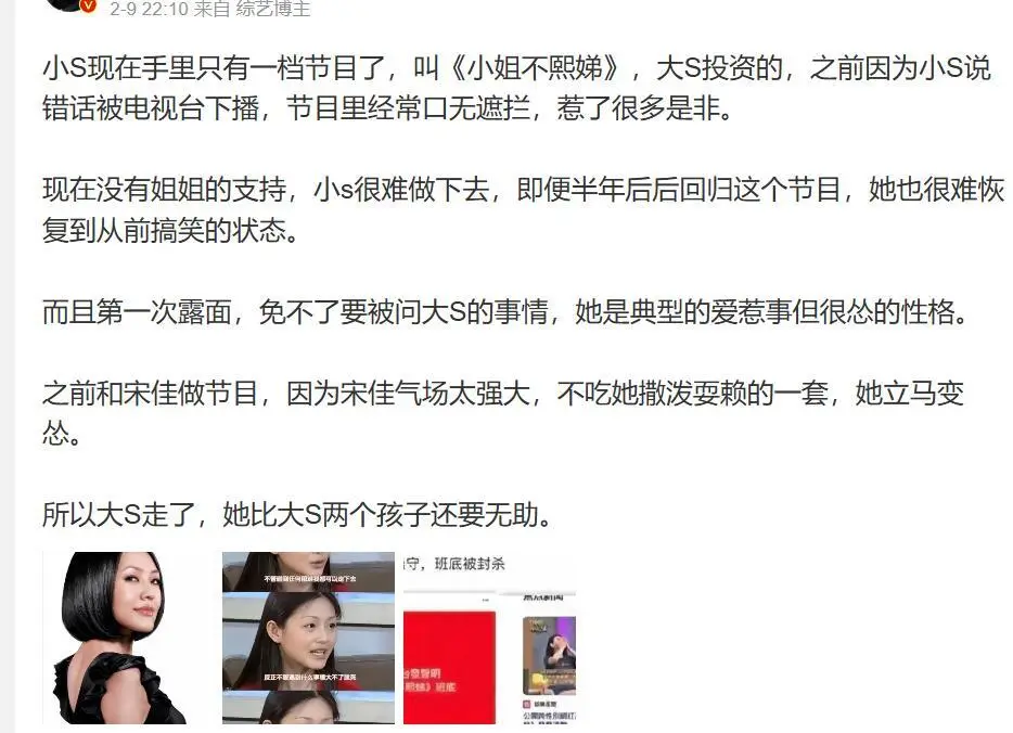 大S去世以来,她的家人和前任在网络上的大战并没有停下,时不时的上演一场“舆论战”。 现在还要演变成遗产争夺战,纷纷袒露出了本身卖弄的一面,也引发了不少网友的唏嘘。 一、汪小菲作为跟大S爱恨胶葛半生的人,汪小菲在大S救济时就收到了消息,也第一时间知道了她的死讯。 随后,他高调的去哀悼亡妻,还发声说死的人应该是他,许多网友却以为他的言语里没有诚意,而是想要为本身的店挣更多流量。 现在他的运动也坐实了这一说法,大S还没有安葬,他就提前带着现任妻子马筱梅离开了台北,回到北京。 也没有出钱着力为大S摒挡后事,再次佐证了他的薄情。 一、小S小S在姐姐大S去世前一天和母亲一起跳舞,在姐姐去世后,为她申请了树葬。 在大S头七那一天,还跟挚友一起集会,这些情景都让网友直呼很难担当,感觉她并不器重本身的姐姐,以致大概像网传的消息一样嫉妒本身的姐姐。 固然,姐妹本是同根生,有网友分析说,小S因为大S去世丧失惨重,她的商业代价以后以后就掉光了。 因为她本来走的是笑剧谐星门路,要显现出本身快乐的一面,在镜头眼前逗各人笑。 但是在她姐姐去世以后,她再以快乐的形象示人的话,肯定会遭遇许多的攻击,对她的奇迹是绝对的打击。 而且,她的节目《小姐不熙娣》照旧大S投资的,以后以后,大S再也没有时机扶持她的节目了。 二、徐妈妈最让人唏嘘的照旧大s的母亲徐妈妈,徐妈妈之前发布了一篇文章,哀悼本身的女儿。 说本身的心就像是破了一个洞,也体现出了她对女儿去世的伤心。 可是随后她又一改伤心的风格,在网络上发布了一则宣战的宣言,至于宣战的对象她并没有说出来,但是不少网友推测跟大S的遗产有关。 有网友扒出了大S的遗产情况,发现大S的遗产大多是由她的儿女继承,徐妈不肯定可以大概继承。 而大S生前有两套房子,一套是大S婚前买的,现在是由徐妈居住,另一套则是大S嫁给汪小菲之后,汪小菲在台湾购买的,被登记在了大S的名下,也算是大S的产业。 但是在大S去世之后,这两套房子的归属权就不再清朗,很有大概不属于徐妈了。 她大概也怕本身被赶出现在住的房子,才会公然宣战,这也让不少民气凉了半截,以为徐妈妈也太实际了。 回顾大S 的一生,曾经的她是多么的风光,十几岁就成为了华岗艺校的校花,得到贵人的相助,有了属于本身的节目,还拉扯着本身的妹妹小S一起进了娱乐圈。 从主持人转型做演员以后,她出演了不少偶像剧女主。 无论是《流星花圃》照旧《泡沫之夏》,她演的女主角总是被众星捧月,有浩繁蜜意的寻求者。 跟汪小菲闪婚之时,她的婚礼也是格外风光,有10余名明星姐妹为她撑腰。 汪小菲也脱手阔绰,为婚礼豪掷1000万元,整场婚礼就像是一部偶像剧的了局。 直到大S去世后才发现,她身边竟然没有一个至心相待的人,曾经的风光似乎都一笔勾销,也让人以为非常的唏嘘,渴望她可以大概一路走好吧! |