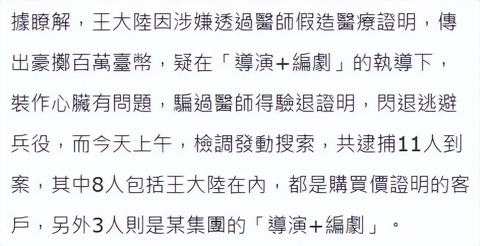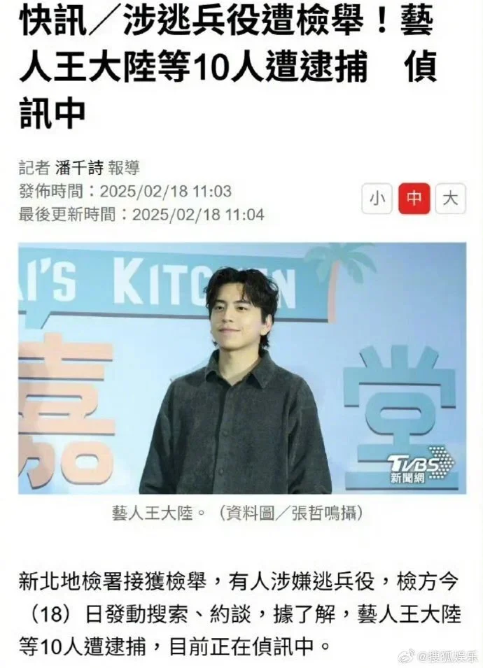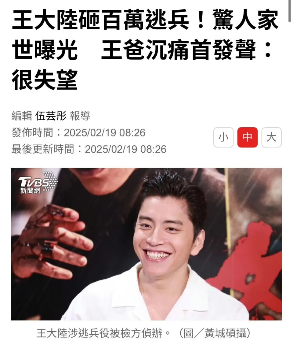2月18日,据台媒报道,演员王大陆因涉嫌逃兵役而被相干部门逮捕,此消息一出敏捷引发了网友们的热议。 据悉18日上午,相干职员去往王大陆住所查抄证物,并将本人带走拘留,从曝光的照片来看,王大陆被带走的时间戴着口罩,看起来非常淡定。 其着实此之前,王大陆就曾多次被质疑逃兵役,但末了都不了了之,据悉这次被发现是因为有人曝光了为了免服兵役,找大夫造假医疗证实的案子,有关部门观察这个案子的时间,刚好王大陆也在此中。 只管这件事变曝光之后引起了多方关注,但很快便有了处理处罚效果,在颠末一个半小时的审判后,最终王大陆交了15万台币的担保,并安排他于3月正式入伍投军。 至于王大陆为何要逃兵役?如今还不得而知,但据台媒报道,王大陆为逃兵役可以说是煞费苦心,为了拿到假的医疗证实,不惜耗费上百万,找人上演假装心脏有题目标戏码,骗过大夫拿到证实,从而逃过兵役。 很多网友对于王大陆砸百万逃兵役的行为体现不解,究竟他又不是顶流明星,娱乐圈也不是缺了他不可。 同样不明白的尚有王大陆的父亲,2月19日,据台媒报道,王大陆父亲王台庆在得知儿子逃兵役后首度发声,他体现自己也是透过消息才得知儿子逃兵役,更是私下和友人诉苦对儿子非常扫兴,坦言王大陆什么事变都不跟他讲,“他都自己先做了,有时间我也是看报纸才知道的。” 王大陆父亲王台庆是身家上亿的古董收藏家,以是王大陆家世显赫,是演艺圈著名的富二代,当年王大陆解约风波,也是爸爸支付的950万违约金。 如今儿子王大陆做出如许的事变,作为父亲的王台庆天然是很扫兴,只管他体现王大陆与自己接洽不多,但网友对于他的说辞并不买账。 不少网友体现,作为父亲怎么大概不知道自己的儿子有没有去服兵役,岂非就没有猜疑过吗?即便是不经常接洽,但对儿子基本的关心总是少不了的。 乃至尚有网友直言王台庆肯定知道自己儿子的所作所为,只是如今事发,也只能体现不知道此事,不然就成朋友,包庇犯罪。 如今王大陆方面临此事没有做出任何回应,至于是否会影响到他的演艺生存还不得而知,思量到王大陆工作重心是在本地,对于他逃兵役一事,本地网友好像并没有一窝蜂地踩。 王大陆如今尚有三部待播电视剧和两部待播电影,能不能顺遂播出还是个未知数。对于此事你怎么看?接待批评留言! |