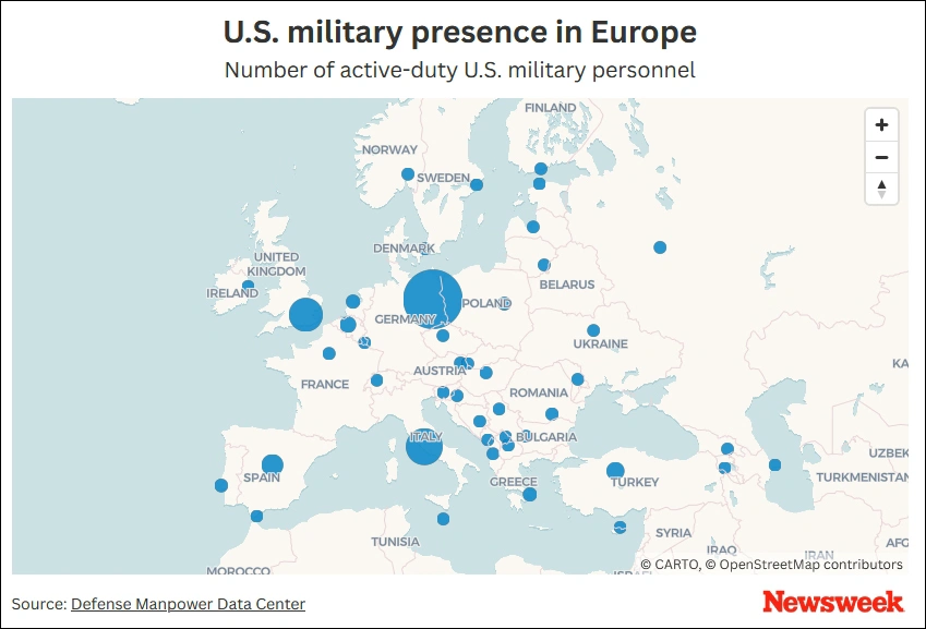 现役驻西欧武士员分布图 《消息周刊》网站制图 特朗普向来不满美国负担北约近半军费开支,以为北约其他成员国在协防“不着力”,还曾以“退群”威胁其进步军费开支占本国国内生产总值(GDP)的目标比例。在第一任期,特朗普设定的标准是2%;开启第二任期后,他又将这一门槛接连进步到3.5%、5%。 不外,现在还没有一个北约国家能达到5%的门槛。根据北约方面客岁发布的估算数据,与乌克兰接壤的波兰是北约成员国中国防开支占GDP比例最高的国家,约为4.12%。紧随厥后的是爱沙尼亚(3.43%)和美国(3.38%)。匈牙利是2.11%,还略低于德国的2.12%。总体而言,北约国家的军费均匀占GDP的2.71%。