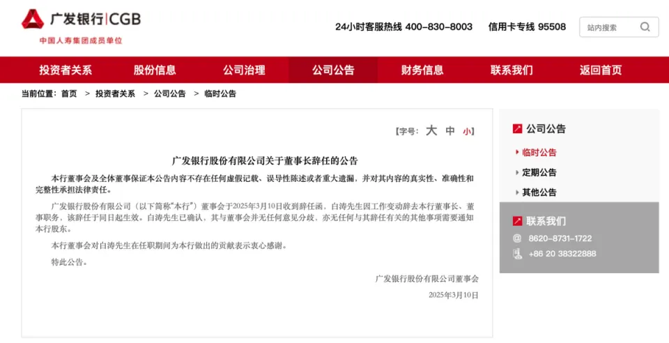 文|王彦强 克日,广发银行官网公告表现,该行董事会于2025年3月10日收到辞任函,白涛因工作变更辞去该行董事长、董事职务,该辞任于同日起收效。 公开资料表现,白涛于1963年出生,结业于中国人民大学,获经济学博士学位,高级经济师。从履向来看,白涛的工作经历高出银行、资管、保险等多个金融业,曾任职于工商银行、中投公司、中国人保、国家开发投资团体、中国人寿团体等。 2022年1月起,白涛出任中国人寿团体党委书记;同年5月,继承中国人寿团体董事长,其广发银行董事长的任职资格也于当月获羁系部门批准。2024年8月,蔡希良接替白涛,出任中国人寿党委书记。同年9月,白涛也卸任中国人寿团体董事长职务。 在白涛离任的同时,广发银行董事会构成也发生重要厘革。广发银行官网公告表现,3月4日,广发银行2025年第一次临时股东大会在广州召开。集会由第十届董事会调集,当日由副董事长王凯主持集会。此次临时股东大会通过了约请外部审计机构、推举田明显为第十届董事会董事、推举李德峰为第十届董事会独董等在内的五份议案。 公开资料表现,田明显现任中信信托党委委员、副总司理。而中信信托为广发银行第二大股东,仅次于中国人寿,持股14.137%。这意味着中信信托自2011年入股广发银行以来,首次得到了董事席位。 据官网表现,广发银行建立于1988年,前身为广东发展银行,是国内首批组建的全国性股份制商业银行之一。2016年8月,广发银行成为中国人寿团体成员单元。现在,中国人寿团体持有该行43.686%的股份,别的持股高出5%的股东包罗中信信托有限责任公司、国网英大国际控股团体有限公司、江西省交通投资团体有限责任公司、财务部,分别持股14.137%、8.919%、8.184%、5.218%。 据广发银行发布的 2025 年度同业存单发行计划及相关财报表现,2024年整年,广发银行实现业务收入687.96亿元,同比下滑0.65%;净利润150.06亿元,同比降落4.98%。 制止2024年末,该行总资产为3.64万亿元,总负债为3.35万亿元。在资产质量方面,2024年,广发银行的不良贷款率为1.53%,较2023年降落0.05个百分点,拨备覆盖率为165.58%,较2023年上升4.68个百分点。 |